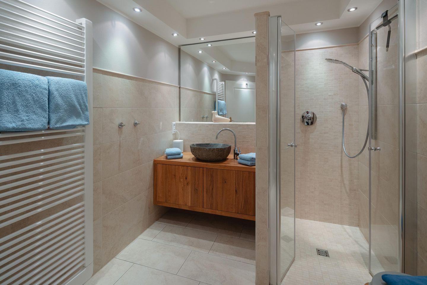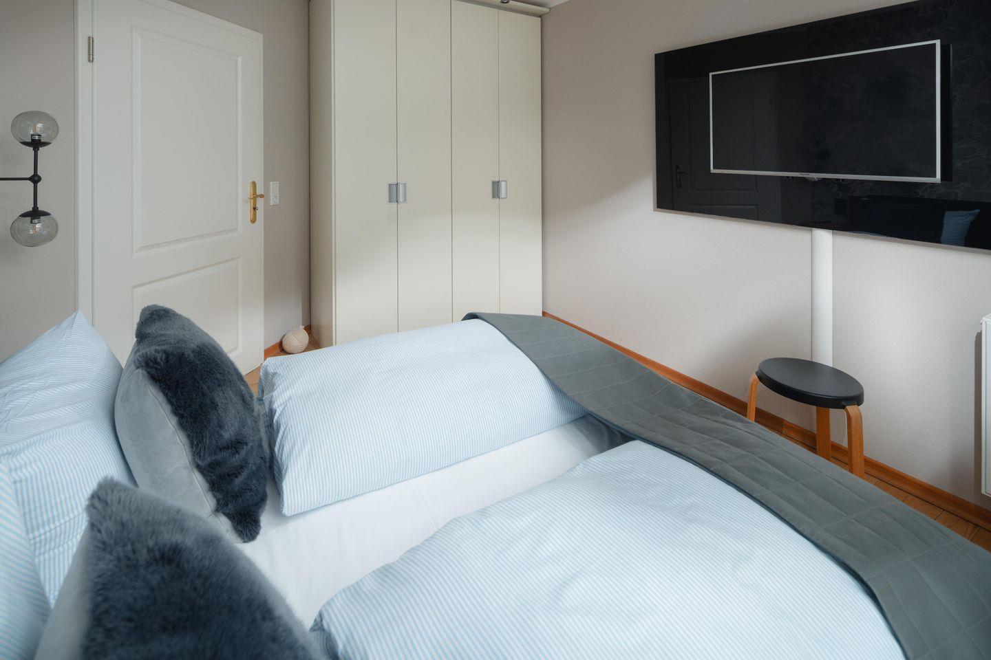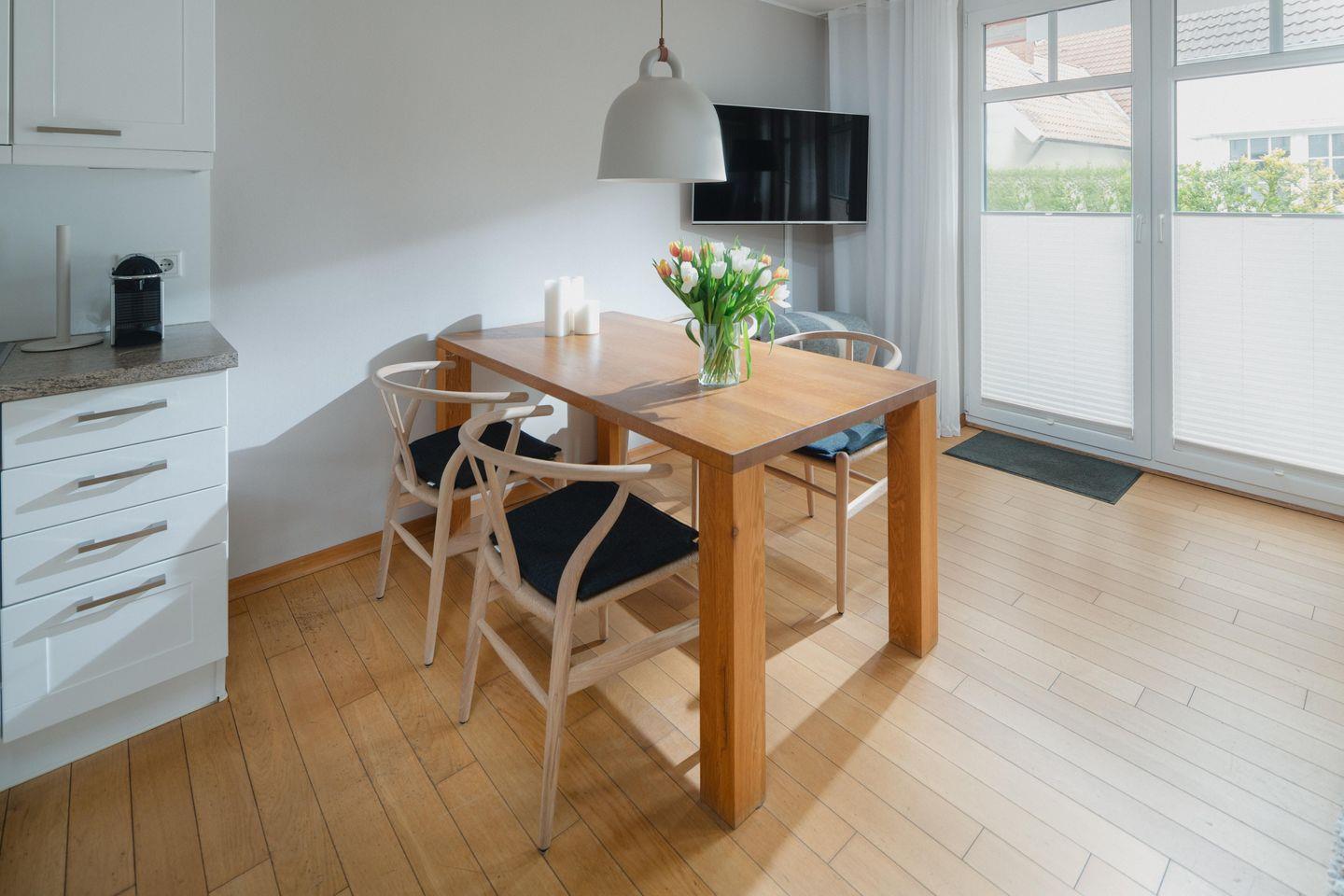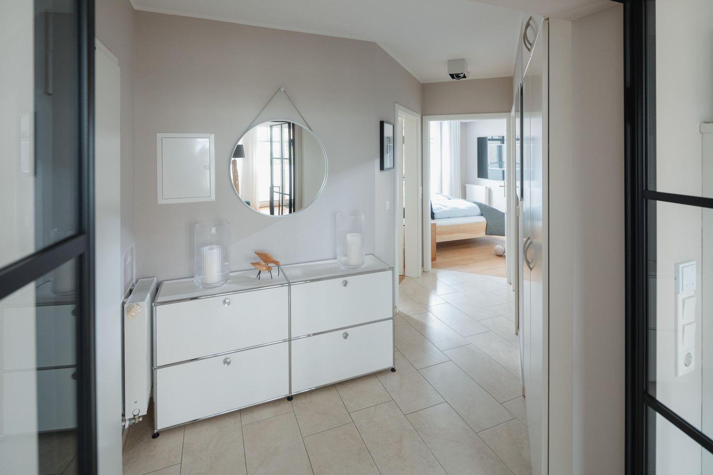 Das Highlight der Wohnung ist das große, helle Wohnzimmer mit Fußbodenheizung und einer offenen, modernen Wohnküche. Vom Wohnbereich aus gelangt man auf die knapp 20 qm große Südterrasse mit Loungemöbeln. Die beiden Schlafzimmer sind zur ruhigeren Nordseite zum Innenhof ausgerichtet und verfügen über Doppelbetten sowie elektrische Außenjalousien. Für Kaffeeliebhaber steht in der Küche eine Nespresso-Kapselmaschine und eine Moccamaster Filter-Kaffeemaschine, sowie eine Tassimo-Kapselmaschine bereit. Das Badezimmer ist mit einer Dusche mit bodengleichem Einstieg und ebenfalls Bodenheizung ausgestattet. Alle Türen haben eine Breite von 100 cm, was für zusätzlichen Komfort sorgt.