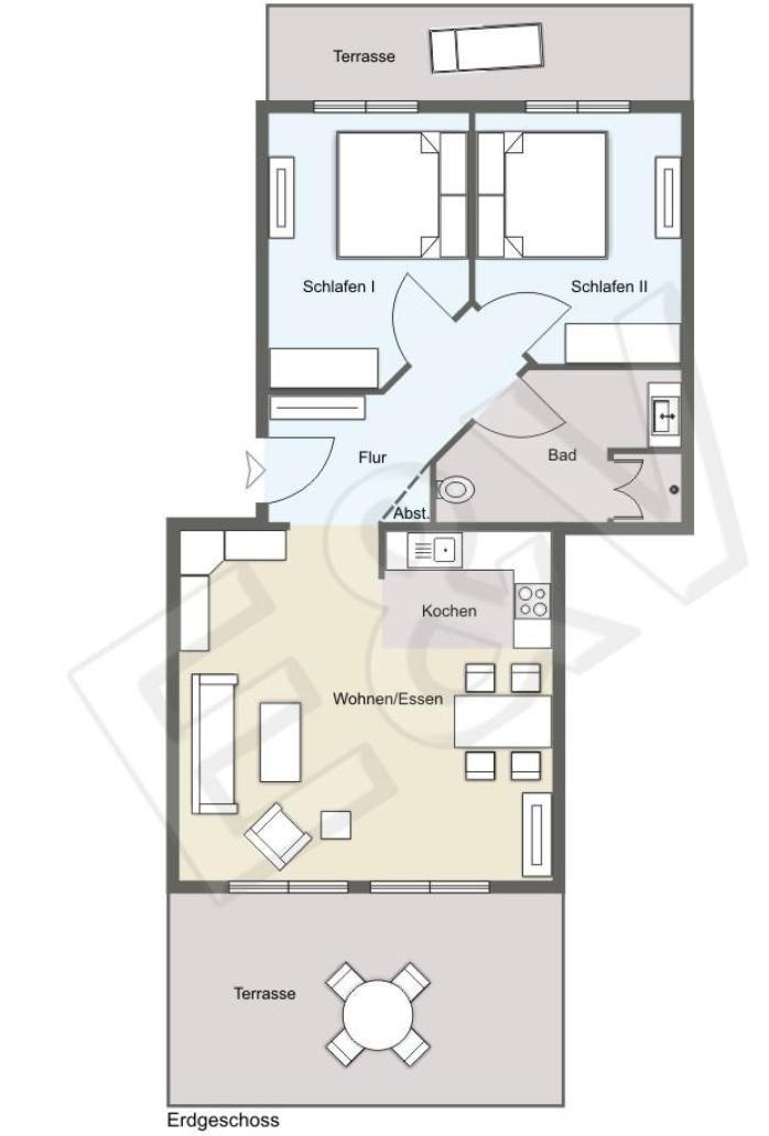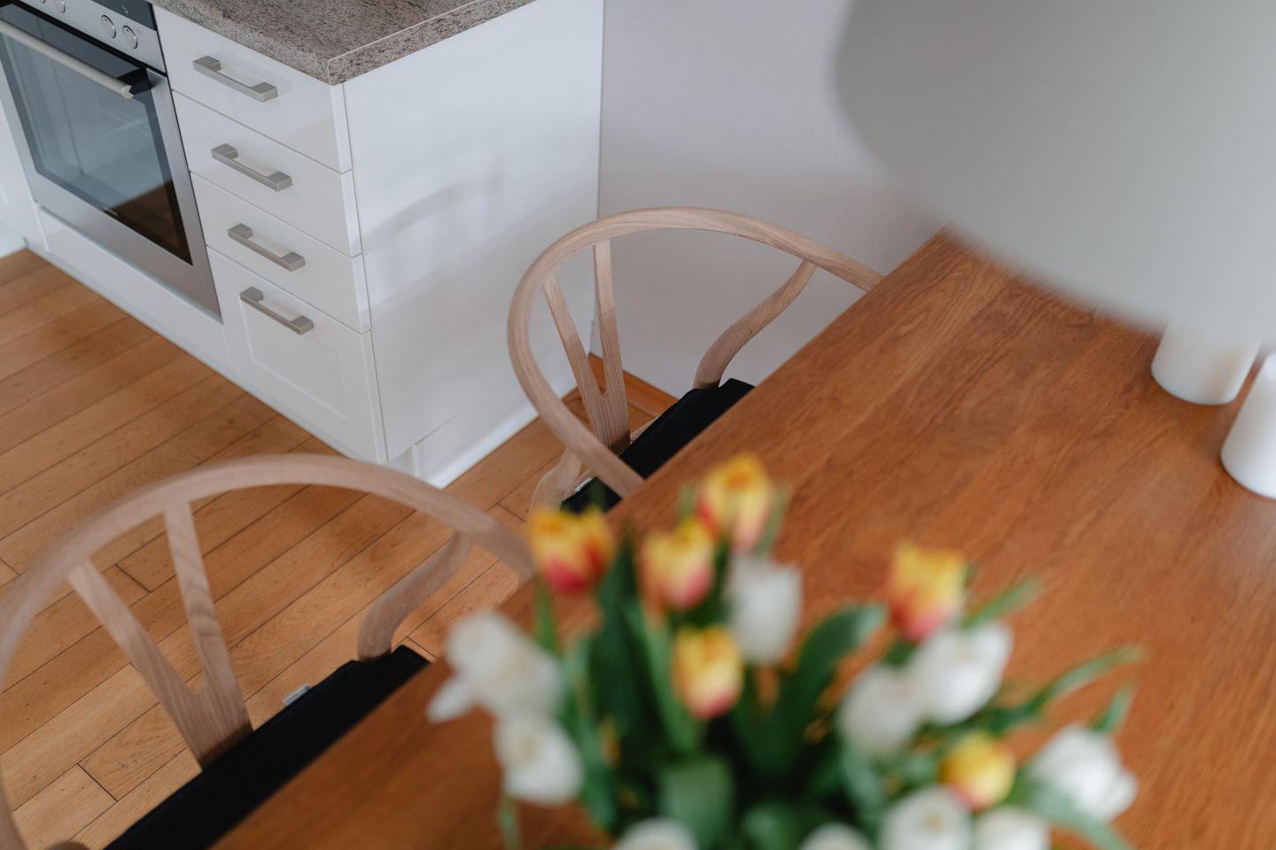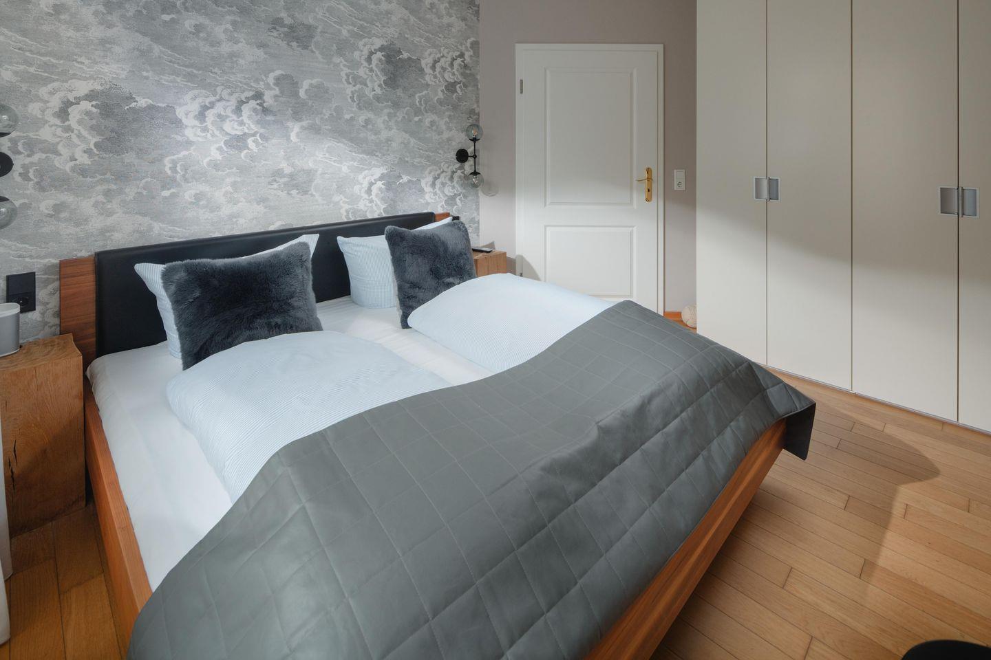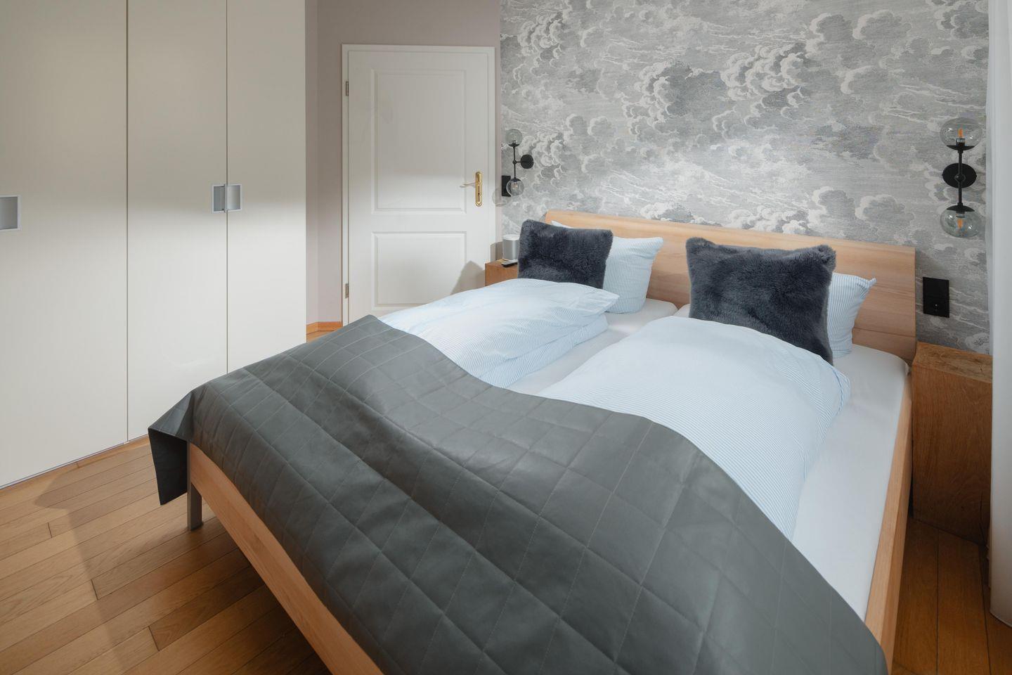 Das Highlight der Wohnung ist das große, helle Wohnzimmer mit Fußbodenheizung und einer offenen, modernen Wohnküche. Vom Wohnbereich aus gelangt man auf die knapp 20 qm große Südterrasse mit Loungemöbeln. Die beiden Schlafzimmer sind zur ruhigeren Nordseite zum Innenhof ausgerichtet und verfügen über Doppelbetten sowie elektrische Außenjalousien. Für Kaffeeliebhaber steht in der Küche eine Nespresso-Kapselmaschine und eine Moccamaster Filter-Kaffeemaschine, sowie eine Tassimo-Kapselmaschine bereit. Das Badezimmer ist mit einer Dusche mit bodengleichem Einstieg und ebenfalls Bodenheizung ausgestattet. Alle Türen haben eine Breite von 100 cm, was für zusätzlichen Komfort sorgt.