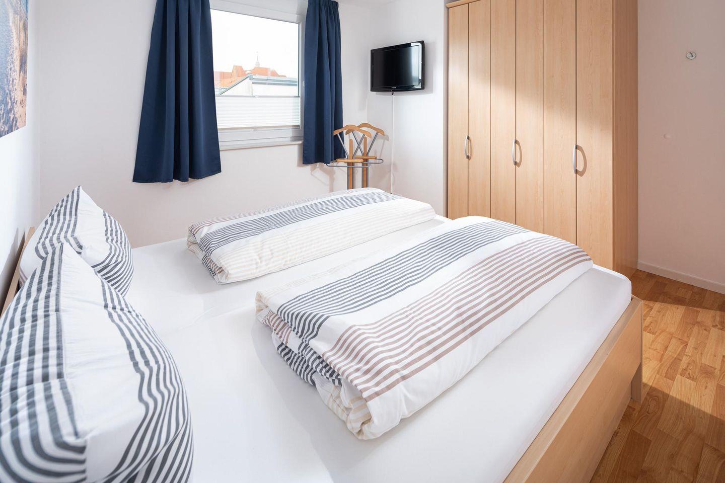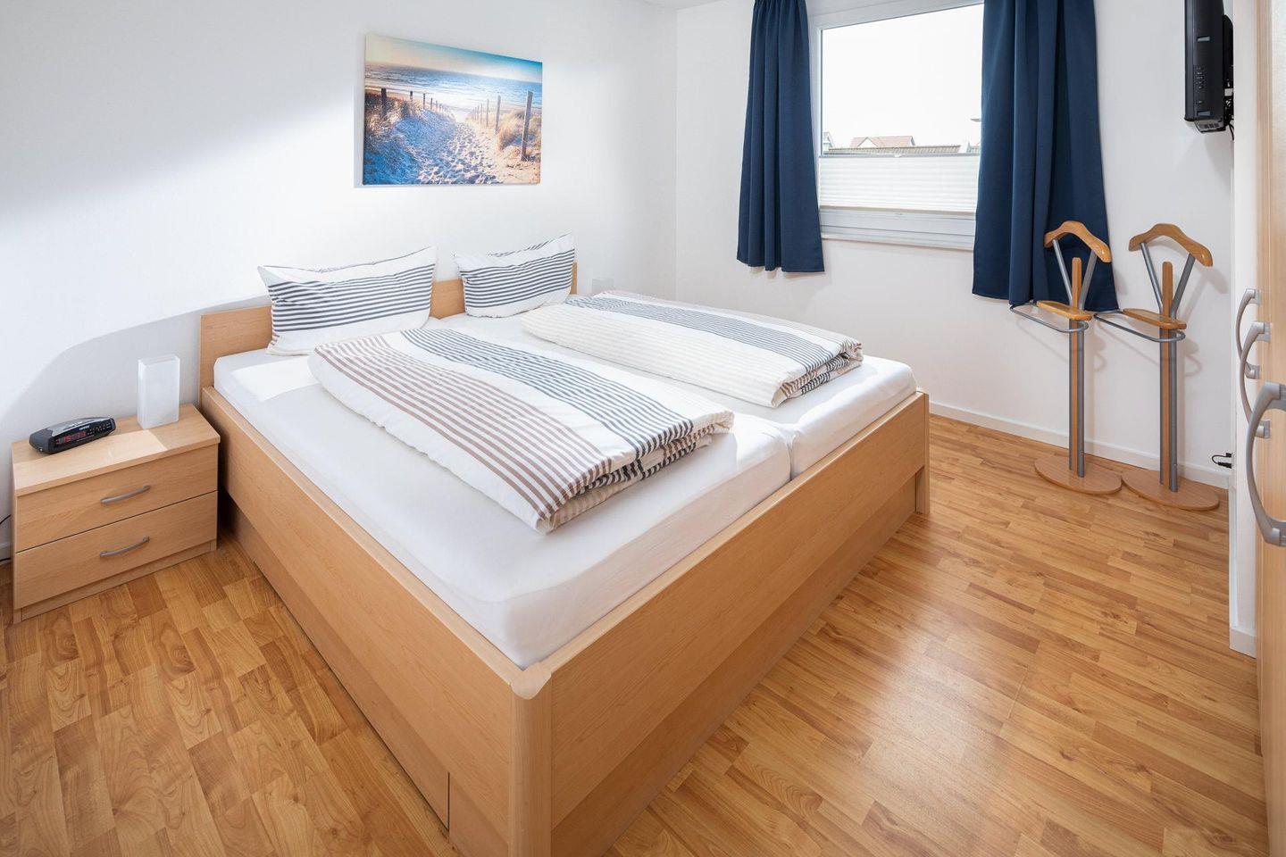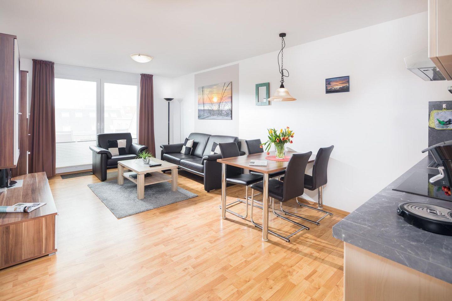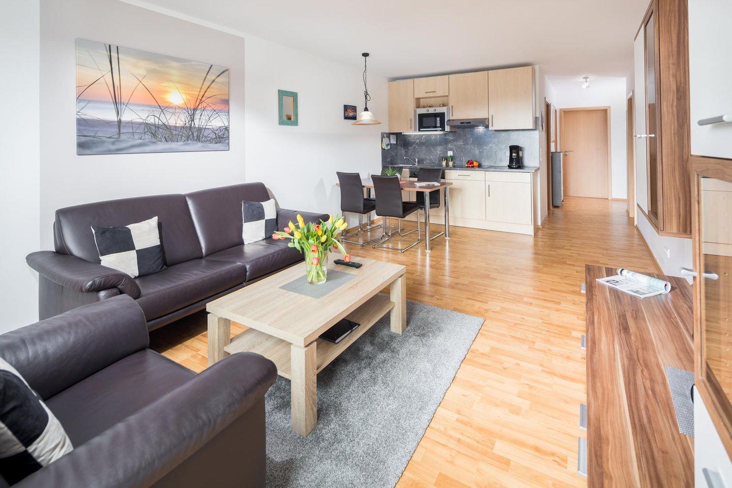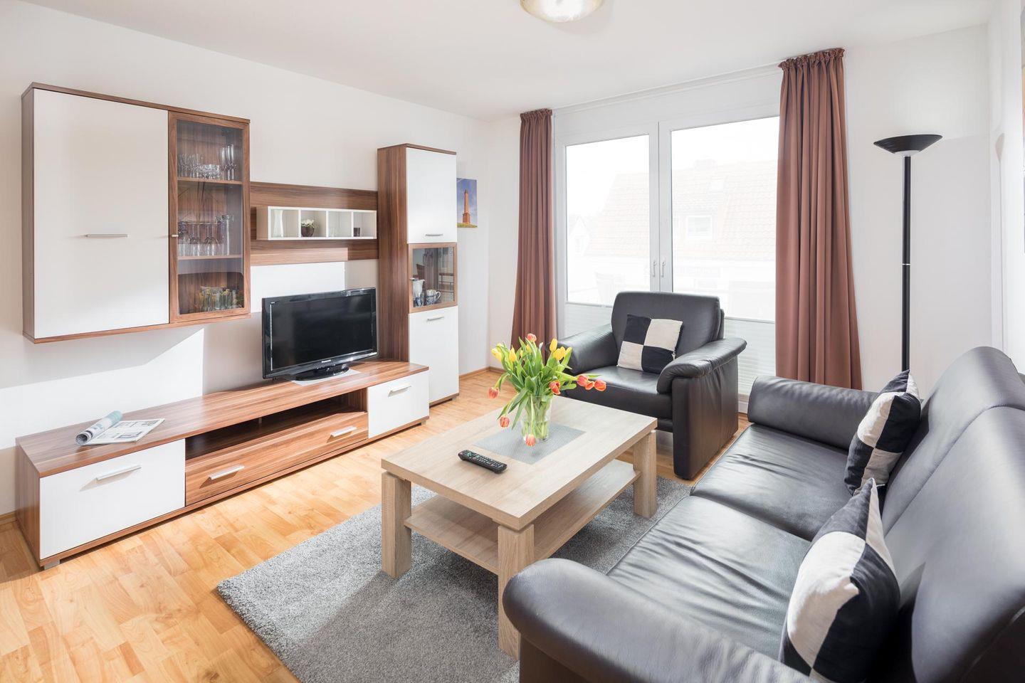 Die Wohnung besticht durch ihre gut ausgestattete Küchenzeile und ein komfortabel eingerichtetes Wohnzimmer mit zeitgemäßer Möblierung. Für die Unterhaltung stehen Kabelfernsehen sowie ein zweiter Fernseher im Schlafzimmer zur Verfügung. Insgesamt gibt es zwei Schlafzimmer, eines ist mit einem Doppelbett ausgestattet und das andere mit zwei Einzelbetten. Neben dem Badezimmer mit Dusche und WC steht auch ein Gäste-WC zur Verfügung. Ein besonderes Highlight ist der nach Süden ausgerichtete Balkon. Waschmaschine und Wäschetrockner befinden sich im Haus und stehen (für die gemeinschaftliche Nutzung gegen Münzeinwurf) zur Verfügung, was besonders für längere Aufenthalte von Vorteil ist. Hinter dem Haus steht den Bewohnern ein abschließbarer Fahrradraum zur Verfügung. Haustiere (Hunde) sind in dieser Ferienwohnung nicht erlaubt.