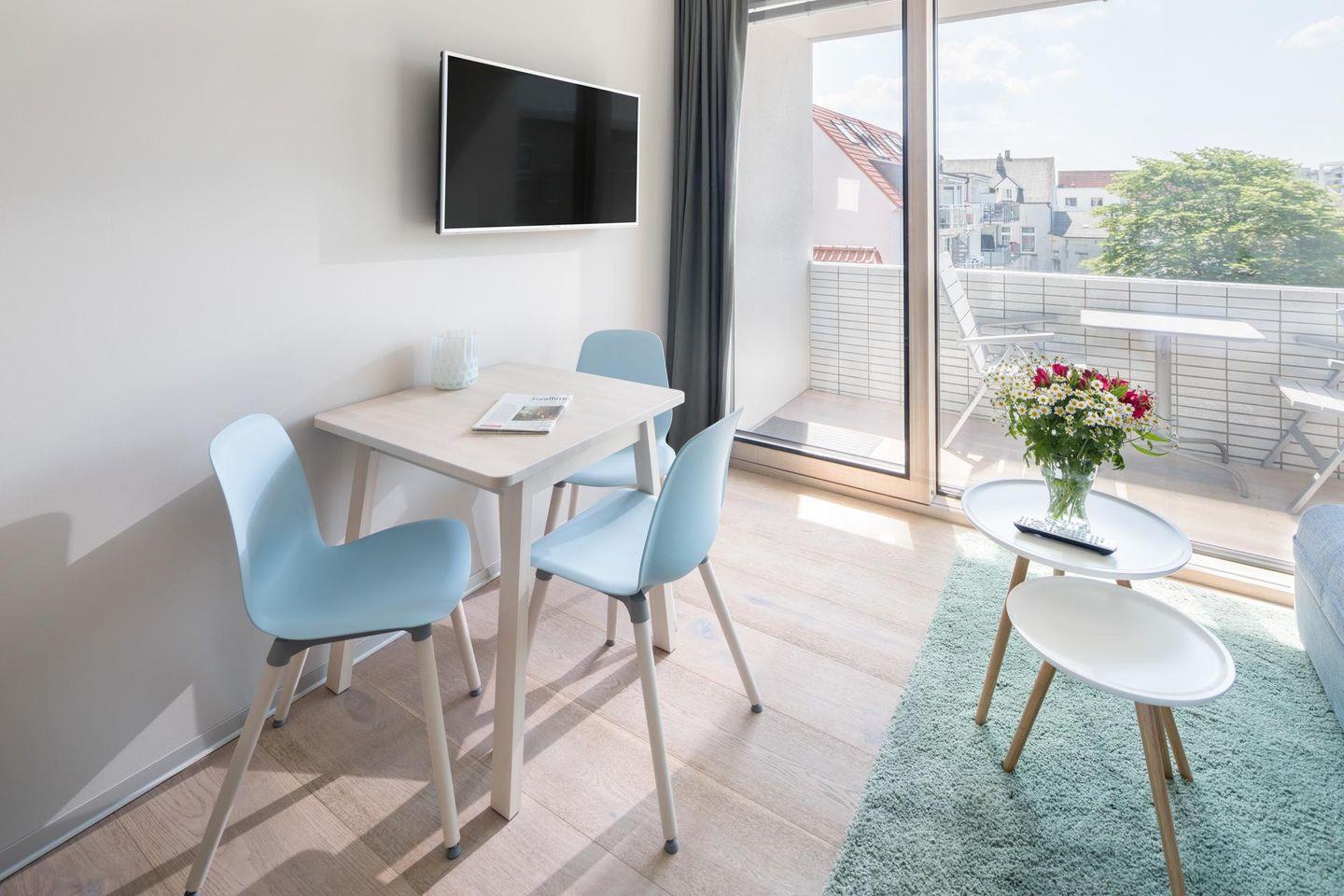 Das "Kleine Glück" ist eine helle, lichtdurchflutete 1-Raum-Wohnung, die durch ihr großes Panorama-Schiebefenster besticht. Die Wohnung wurde renoviert und mit hellen und natürlichen Farben eingerichtet. Der Boden ist mit schönen, massiven, weiß gebleichten Eichendielen ausgelegt. Der Wohn-Schlafraum ist mit einem Boxspringbett (1,60m x 2,00m) eingerichtet. Das moderne Badezimmer mit Dusche und WC ist funktional und modern gestaltet. Die maßgefertigte Küche ist gut ausgestattet. Ein Highlight der Wohnung "Kleines Glück" ist der 5,25 qm große Balkon, der nach Süd-Westen ausgerichtet ist. Haustiere sind hier nicht erlaubt.
