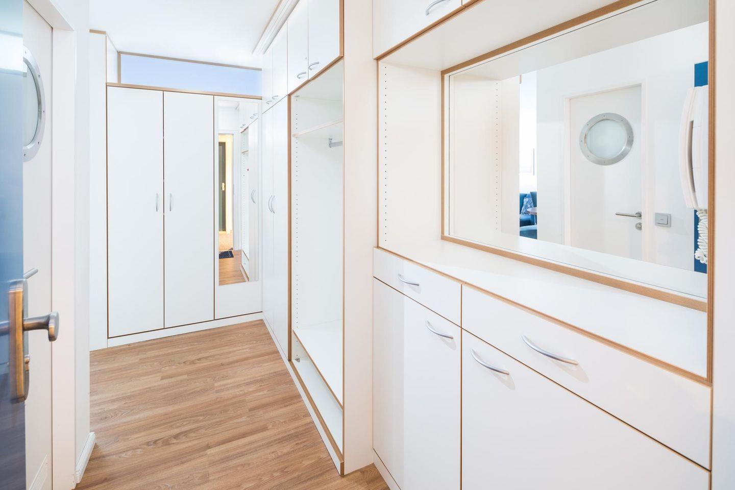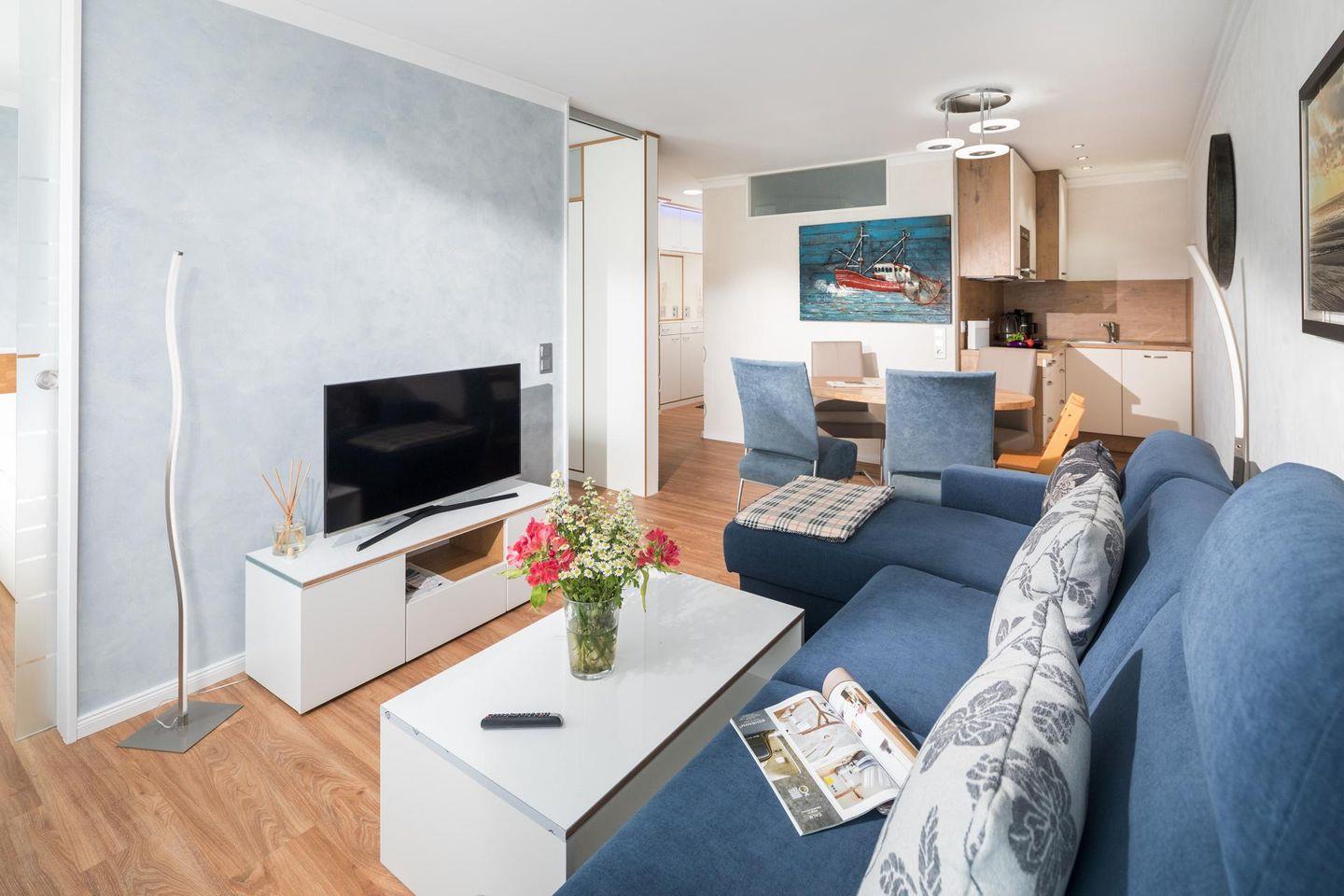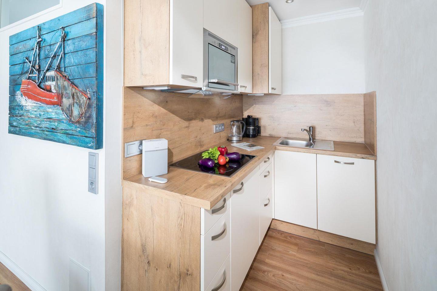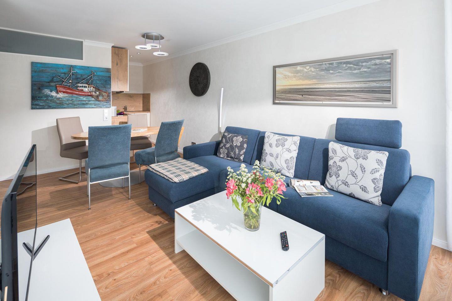 Die Wohnung Nr. 98 wurde kürzlich komplett erneuert und saniert. Die Möbel sind maßgeschneidert und bei der Einrichtung wurde Wert auf helle und maritime Farben gelegt. Das Wohn- und Schlafzimmer ist mit einem Doppelbett ausgestattet und die kleine Küchenecke ist sehr gut ausgestattet. Für eine dritte und gegebenenfalls vierte Person steht eine ausziehbare Schlafcouch mit einer Breite von 160 cm zur Verfügung. Der Balkon der Wohnung ist zur Landseite nach Osten ausgerichtet. Waschmaschine und Wäschetrockner befinden sich im Haus und stehen (für die gemeinschaftliche Nutzung gegen Münzeinwurf) zur Verfügung, was besonders für längere Aufenthalte von Vorteil ist. Hunde sind in dieser Ferienwohnung erlaubt. Erlaubt ist maximal 1 Hund (Höhe maximal kniehoch). Die Hundewiese befindet sich in der Nähe des Fährhafens (kein Leinenzwang).