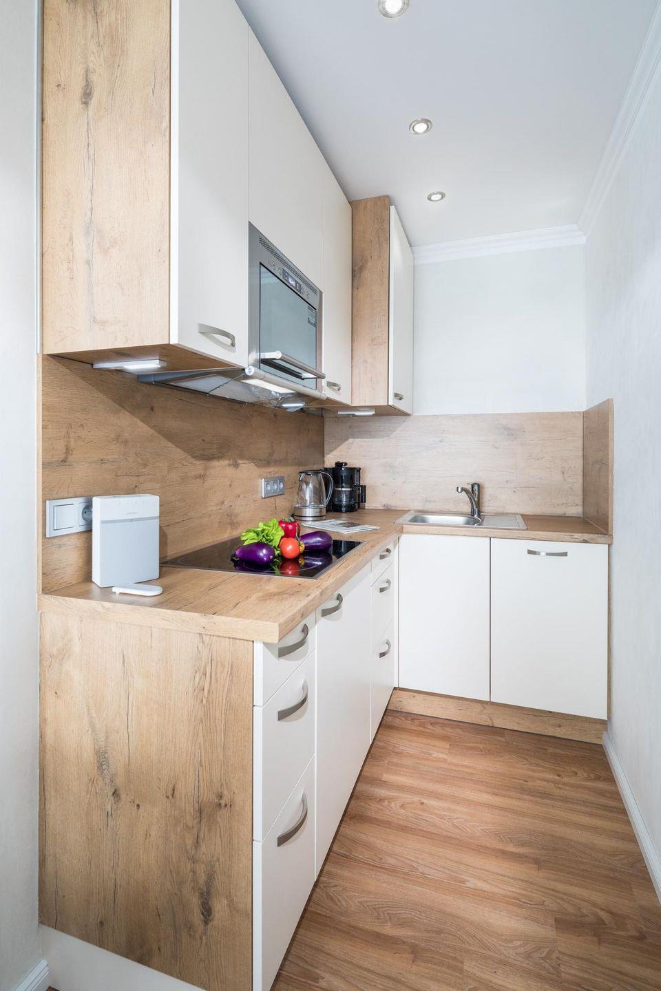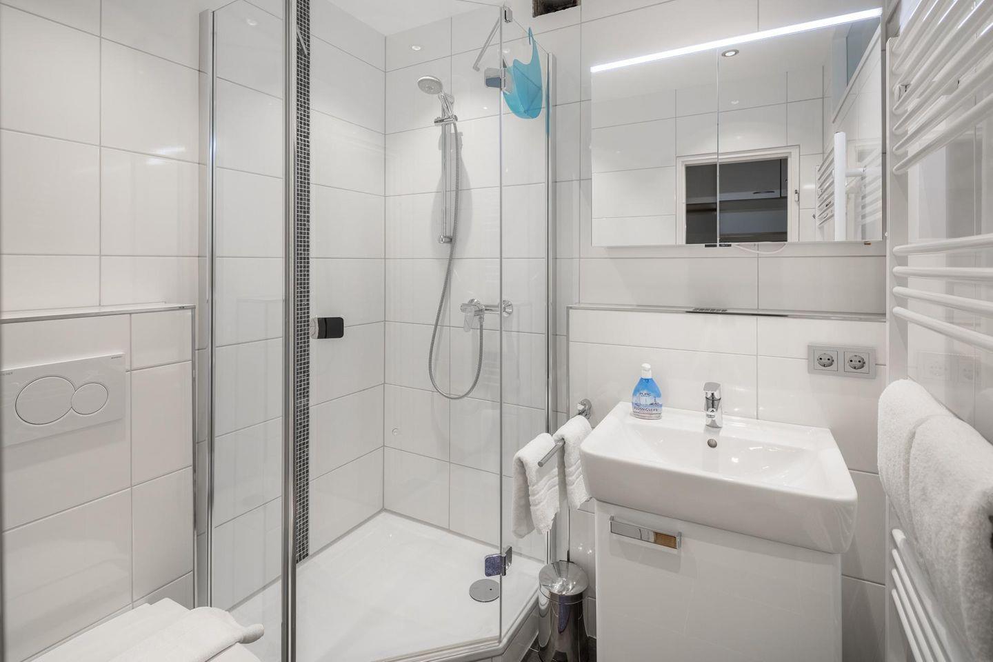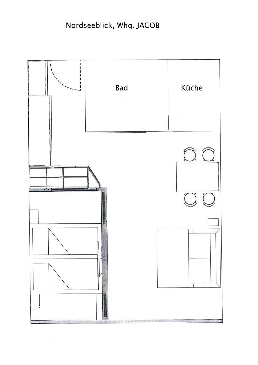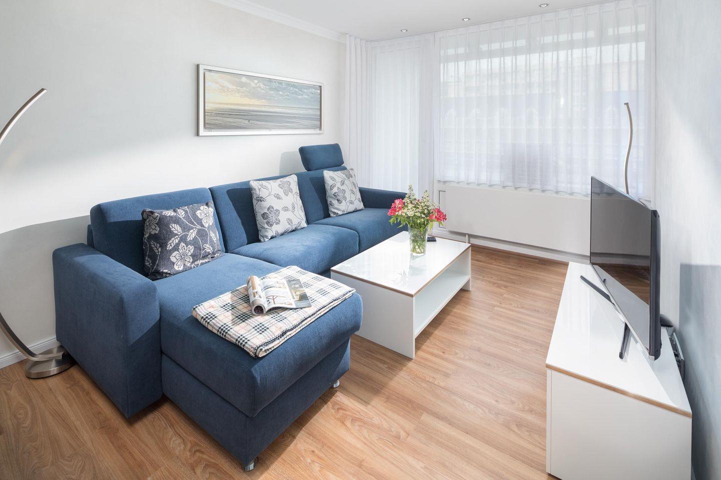 Die Wohnung Nr. 98 wurde kürzlich komplett erneuert und saniert. Die Möbel sind maßgeschneidert und bei der Einrichtung wurde Wert auf helle und maritime Farben gelegt. Das Wohn- und Schlafzimmer ist mit einem Doppelbett ausgestattet und die kleine Küchenecke ist sehr gut ausgestattet. Für eine dritte und gegebenenfalls vierte Person steht eine ausziehbare Schlafcouch mit einer Breite von 160 cm zur Verfügung. Der Balkon der Wohnung ist zur Landseite nach Osten ausgerichtet. Waschmaschine und Wäschetrockner befinden sich im Haus und stehen (für die gemeinschaftliche Nutzung gegen Münzeinwurf) zur Verfügung, was besonders für längere Aufenthalte von Vorteil ist. Hunde sind in dieser Ferienwohnung erlaubt. Erlaubt ist maximal 1 Hund (Höhe maximal kniehoch). Die Hundewiese befindet sich in der Nähe des Fährhafens (kein Leinenzwang).