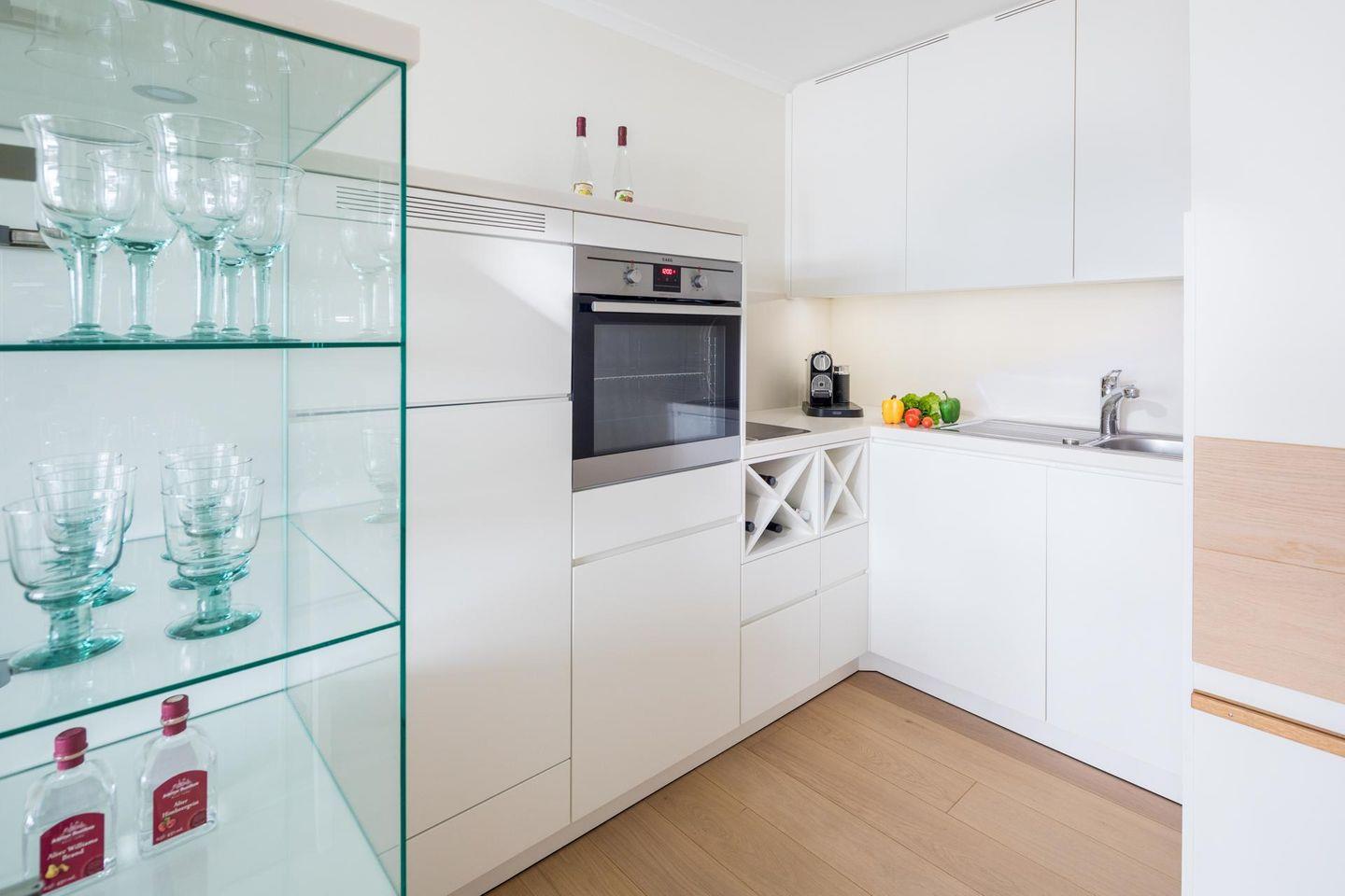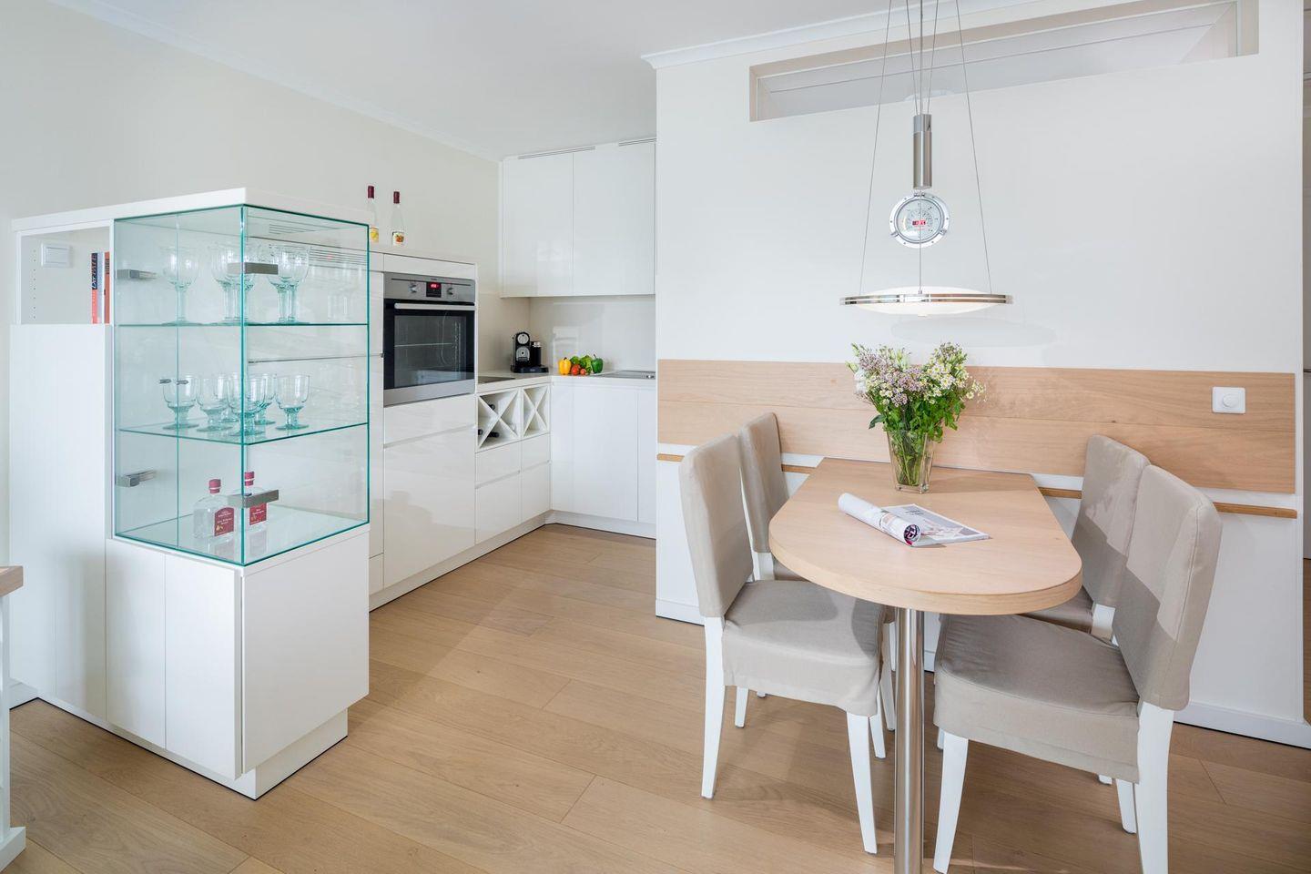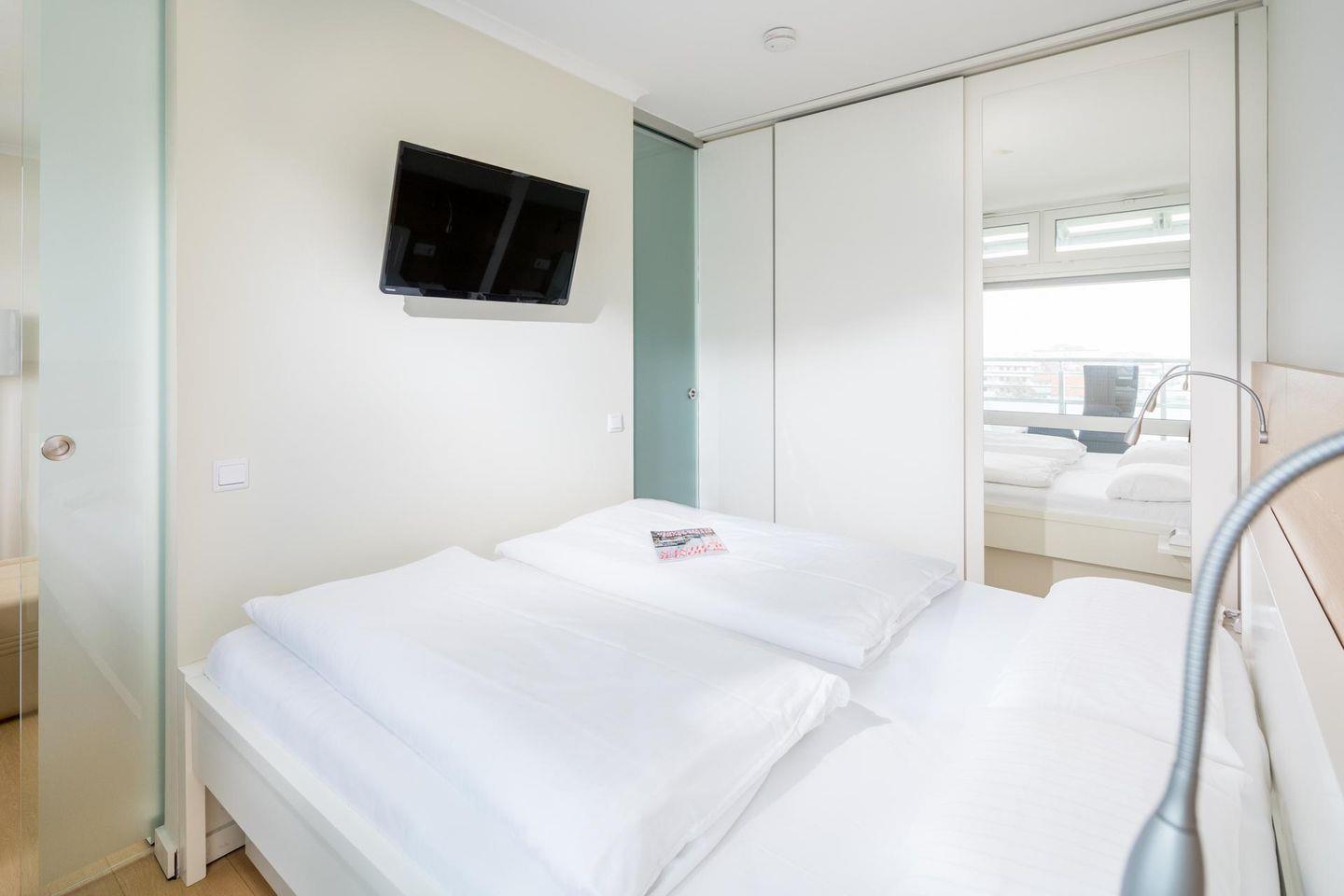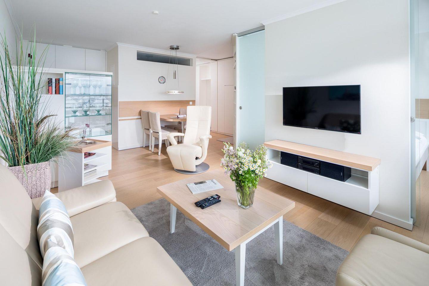 Die Wohnung ist mit einem separaten Schlafzimmer (Doppelbett) ausgestattet. Im Wohnzimmer wurde die Küchenzeile integriert. Das Badezimmer ist mit einer ebenerdigen Dusche und einem Handtuchtrockner ausgestattet. Ein zusätzliches drittes Bett befindet sich im Schrank im Flur, was die Wohnung ideal für kleine Familien oder Gruppen macht. Die Wohnung bietet einen Balkon. Die Wohnung wird seit dem 01.01.2023 ohne Parkplatz angeboten. Waschmaschine und Wäschetrockner befinden sich im Haus und stehen (für die gemeinschaftliche Nutzung gegen Münzeinwurf) zur Verfügung, was besonders für längere Aufenthalte von Vorteil ist. Hunde sind in dieser Wohnung nicht erlaubt.
