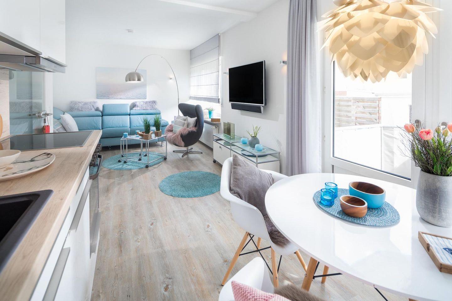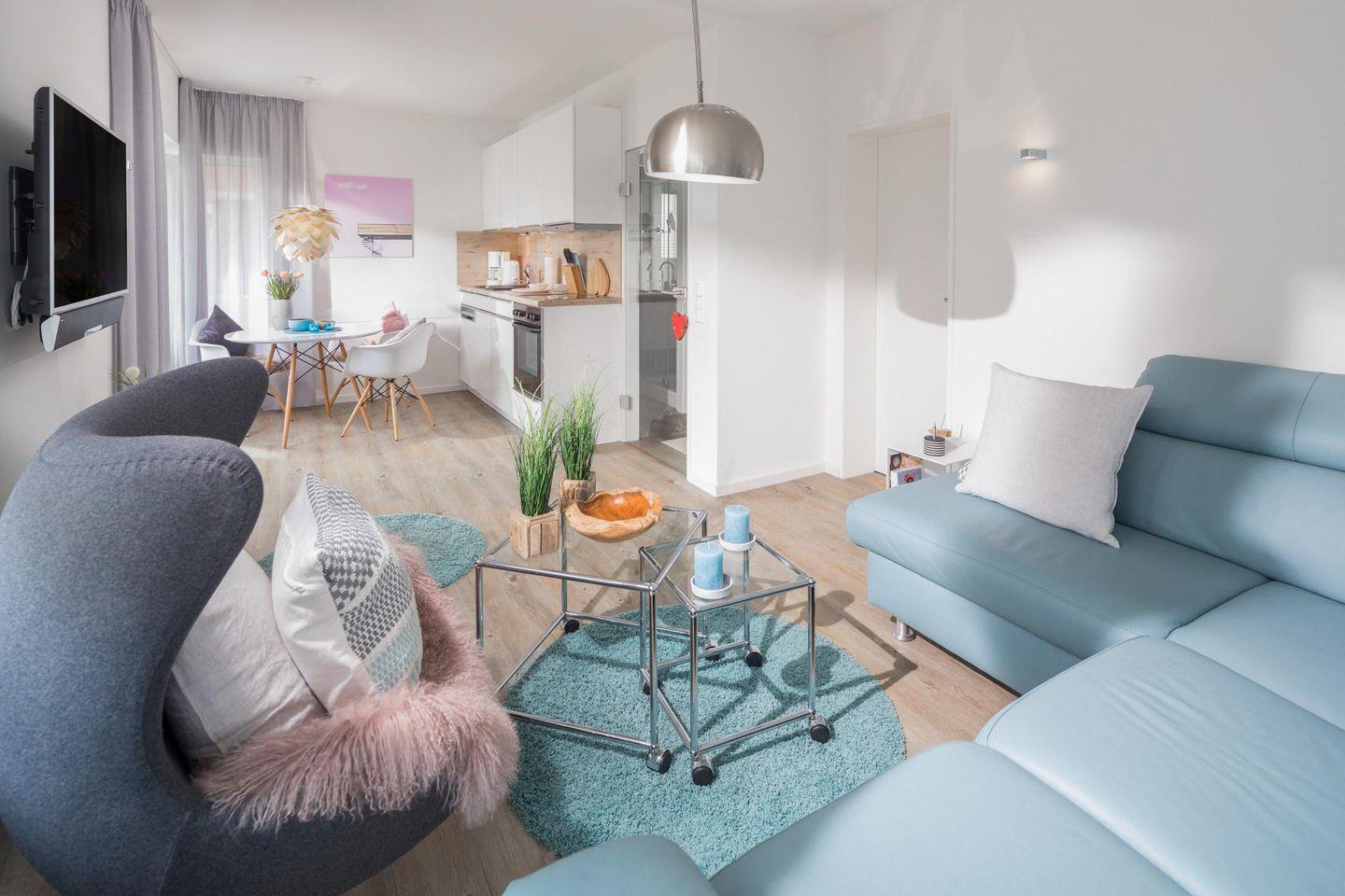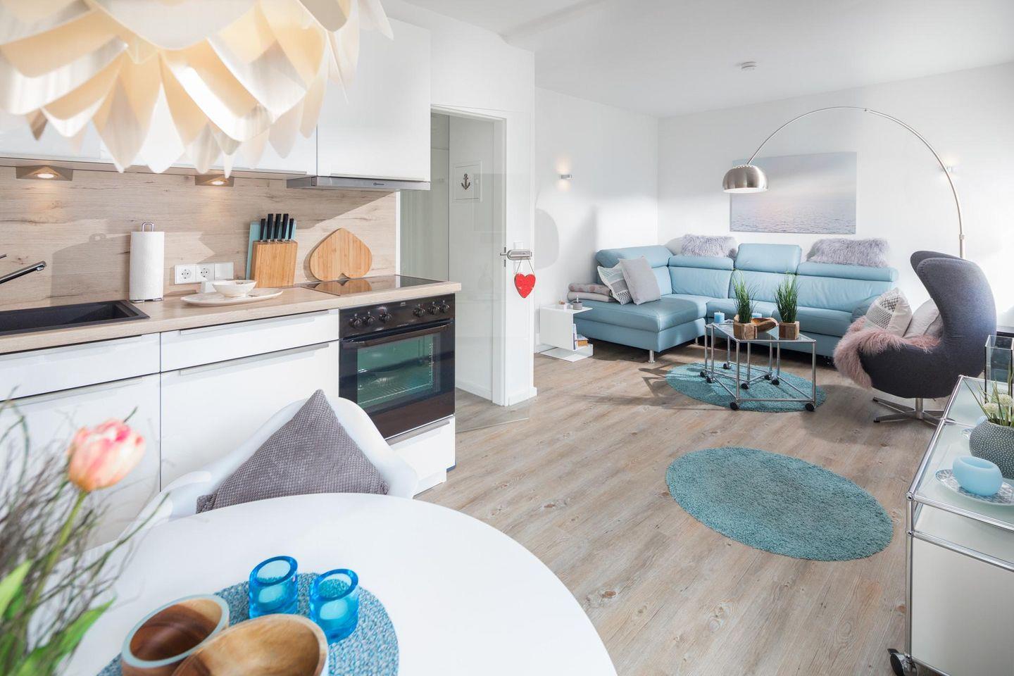 Bei der Innenausstattung wurde auf ein helles Design geachtet. Die 2-Zimmer-Wohnung wurde im Schlafzimmer mit einem Doppelbett (180m x 200m) ausgestattet. Das kleine Badezimmer verfügt über eine Dusche und einen Haartrockner. In der vollausgestatteten Küchenzeile ist eine Spülmaschine vorhanden.