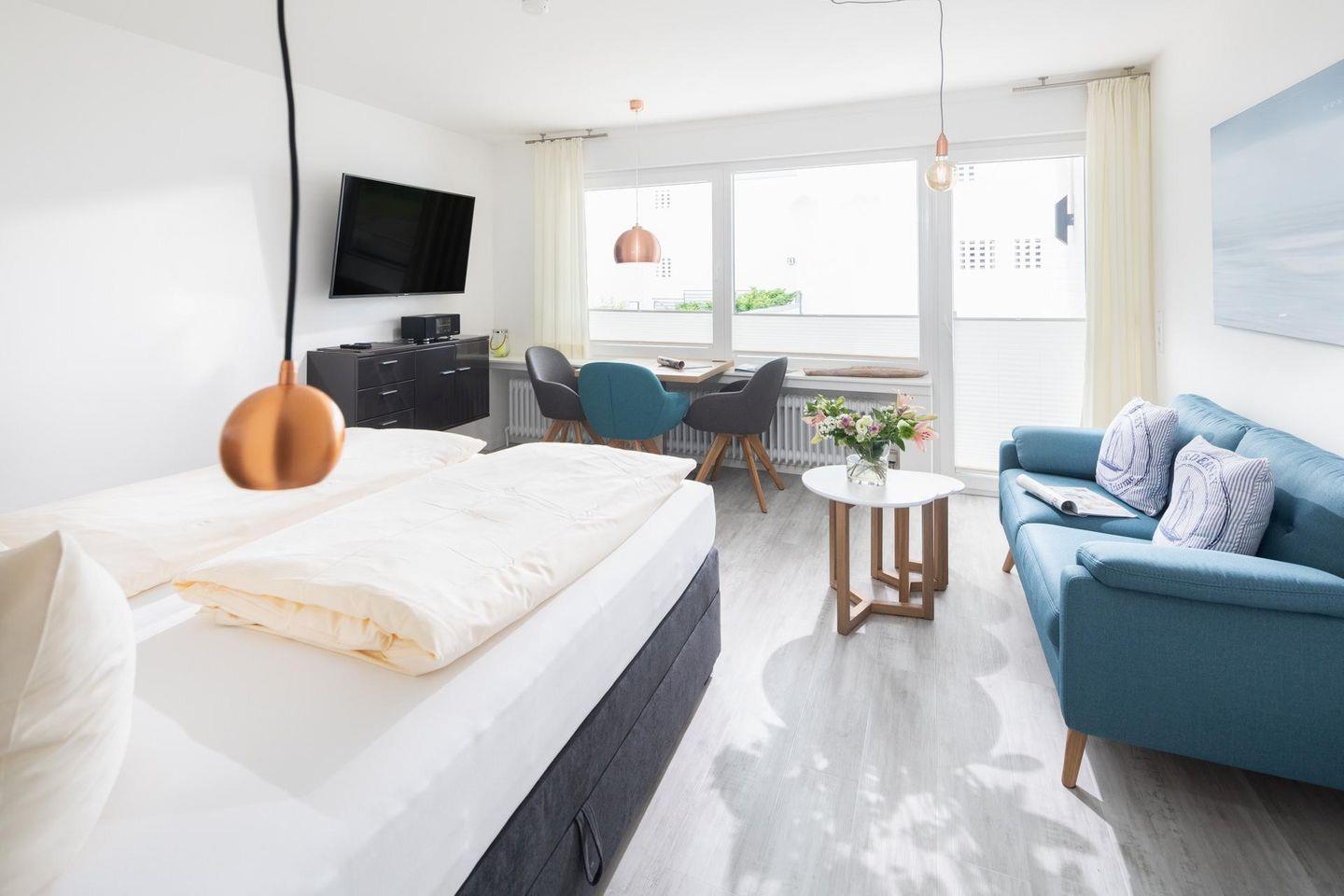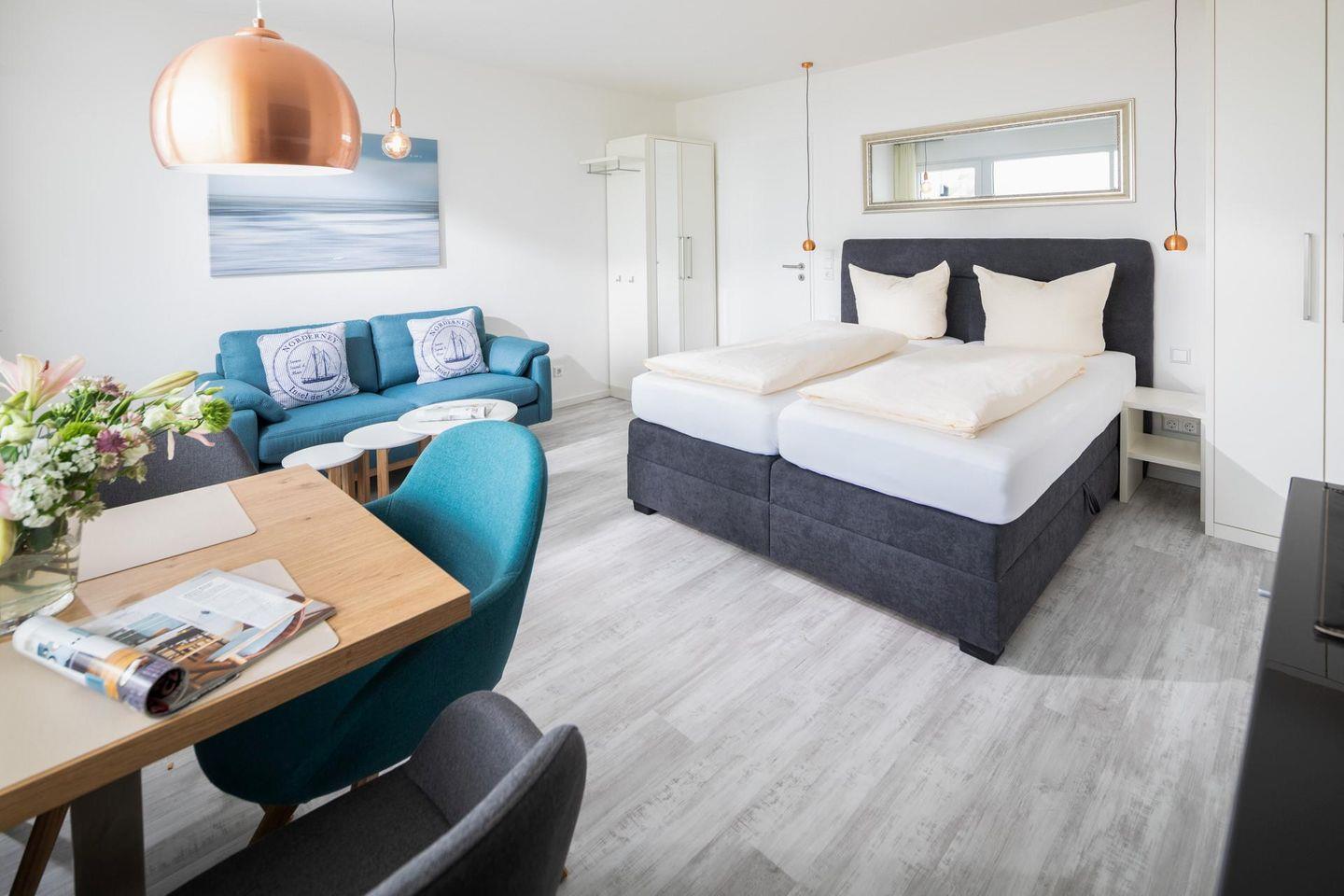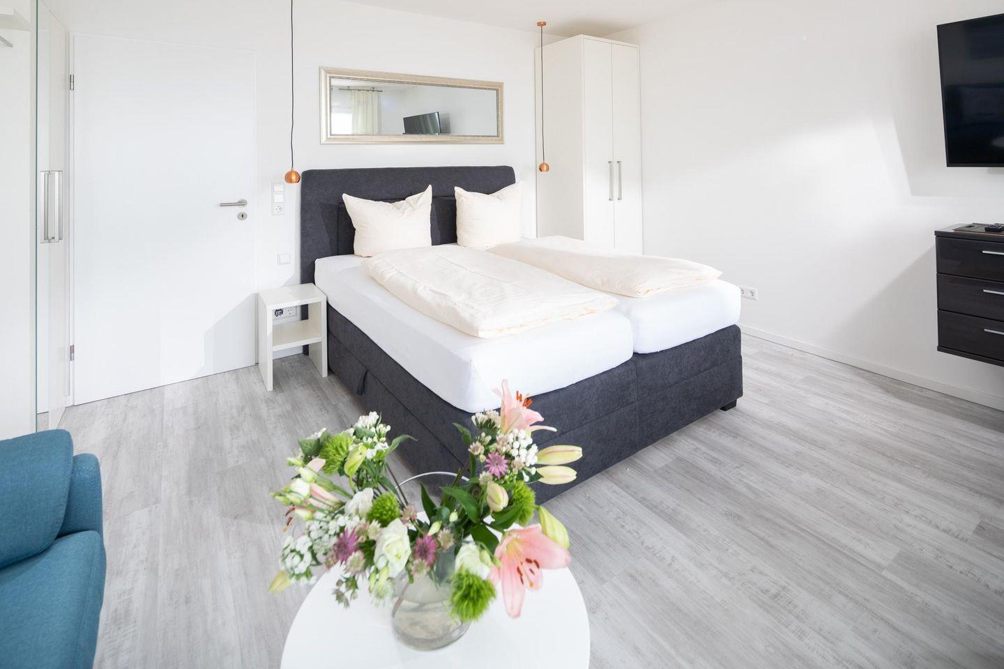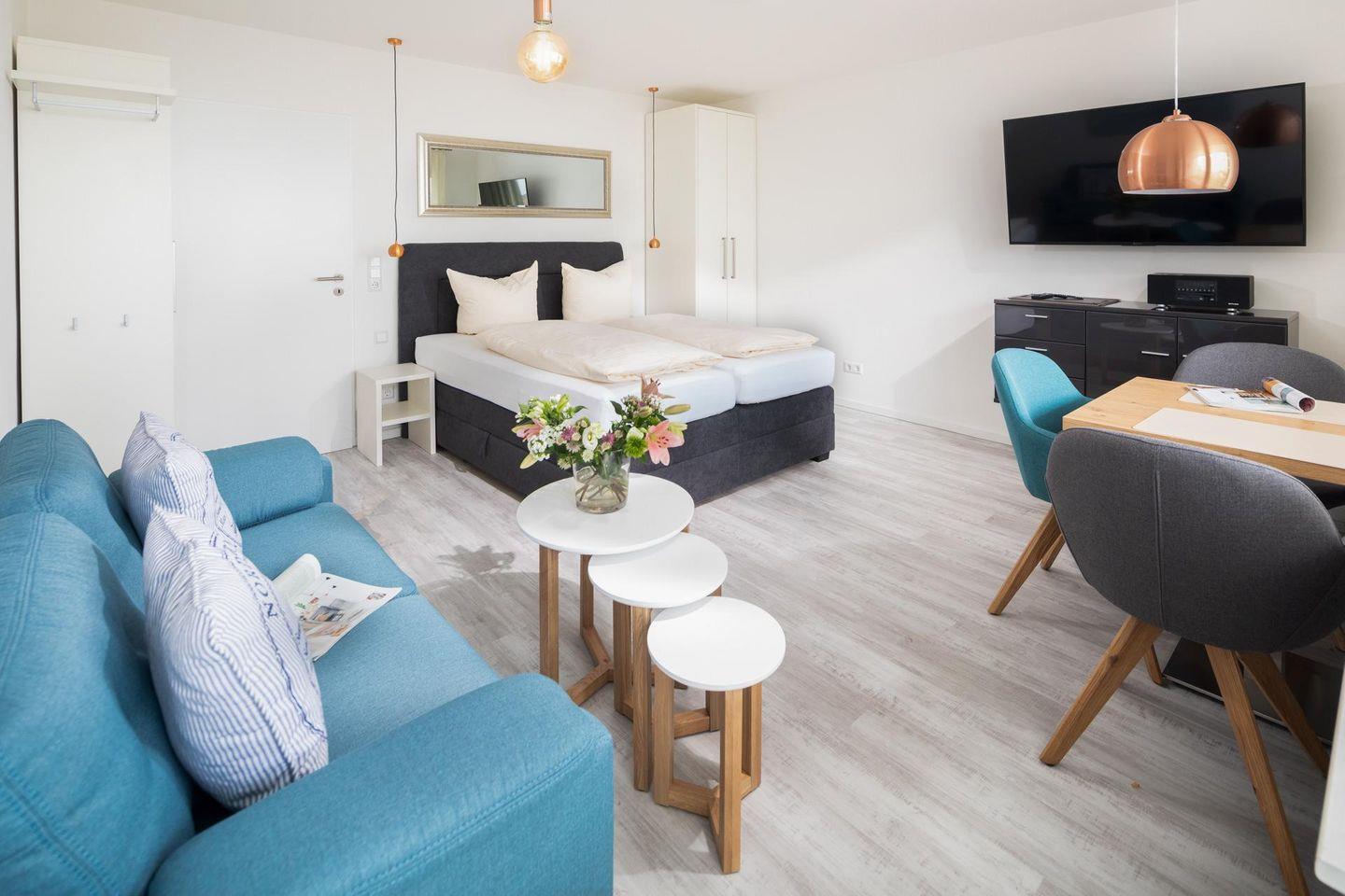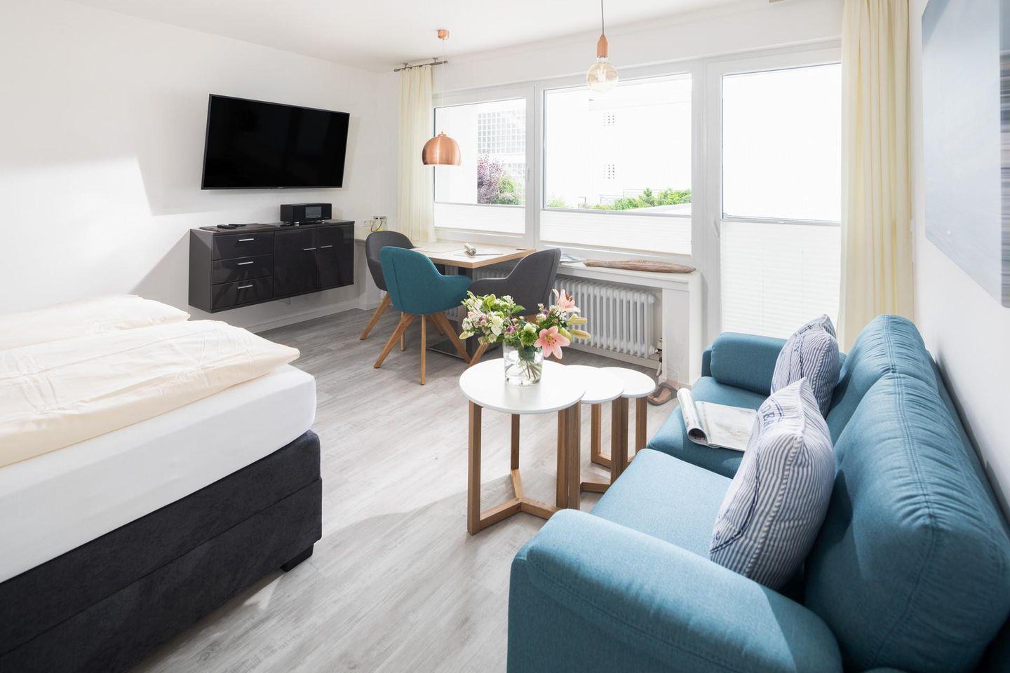 Beim Design der Wohnung wurde auf hochwertige Möbel Wert gelegt. Zudem hat die Wohnung einen ca. 10 qm grossen Südbalkon. Das Grillen ist auf dem Balkon nicht gestattet. Das Einzimmerapartment ist mit einem Doppel-Boxspringbett ausgestattet.