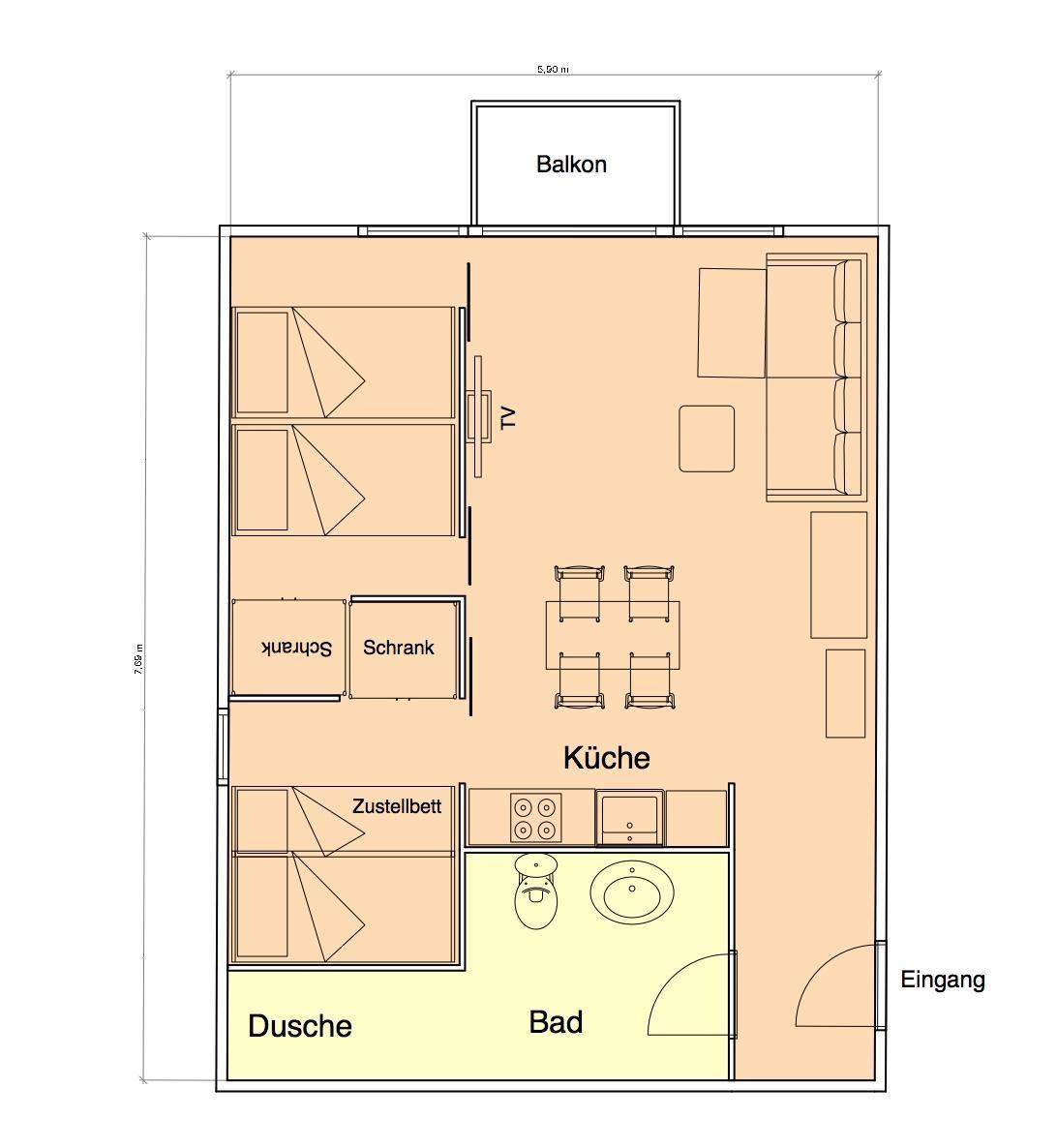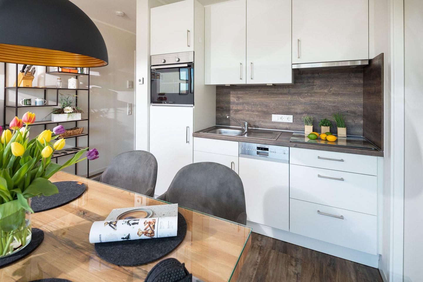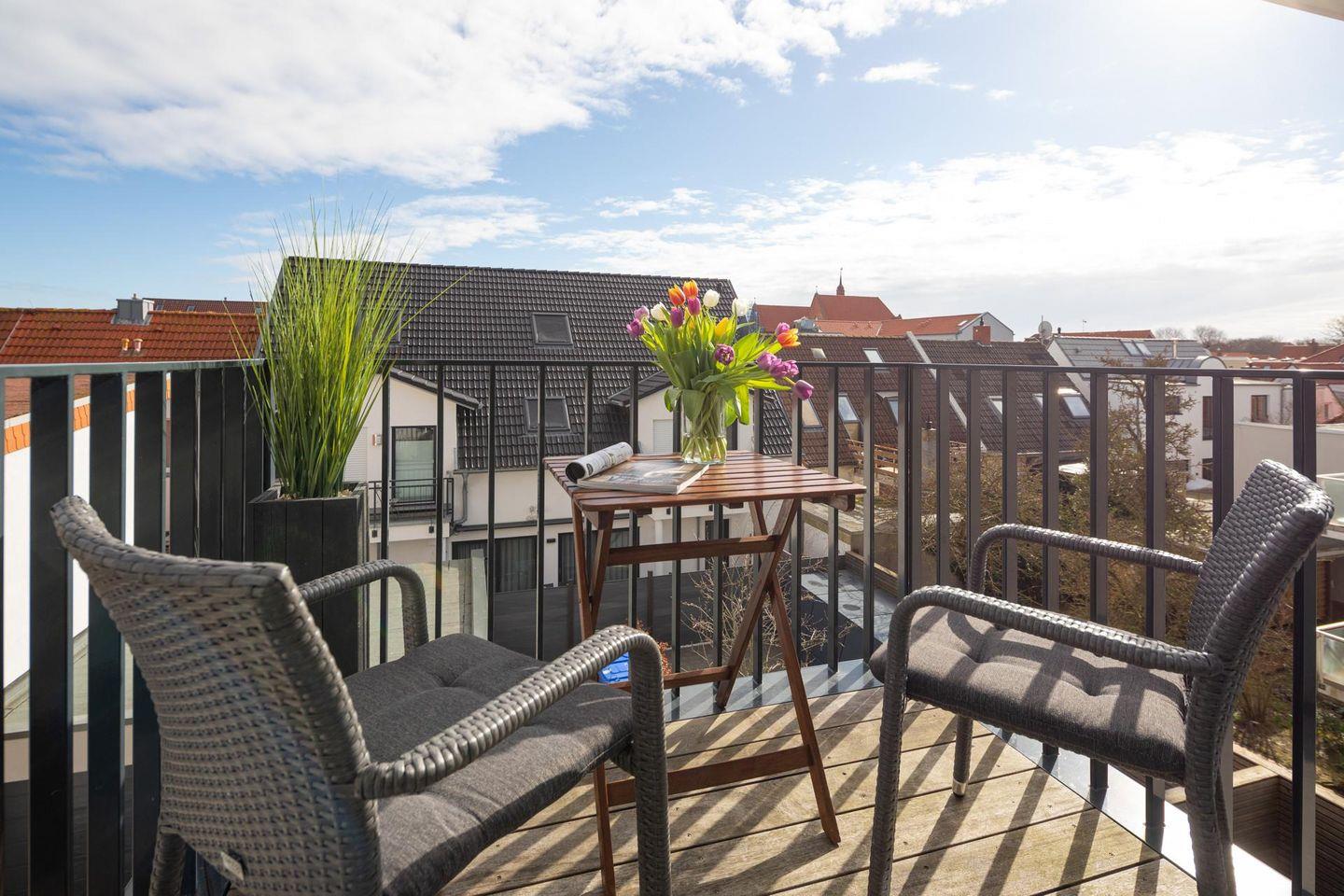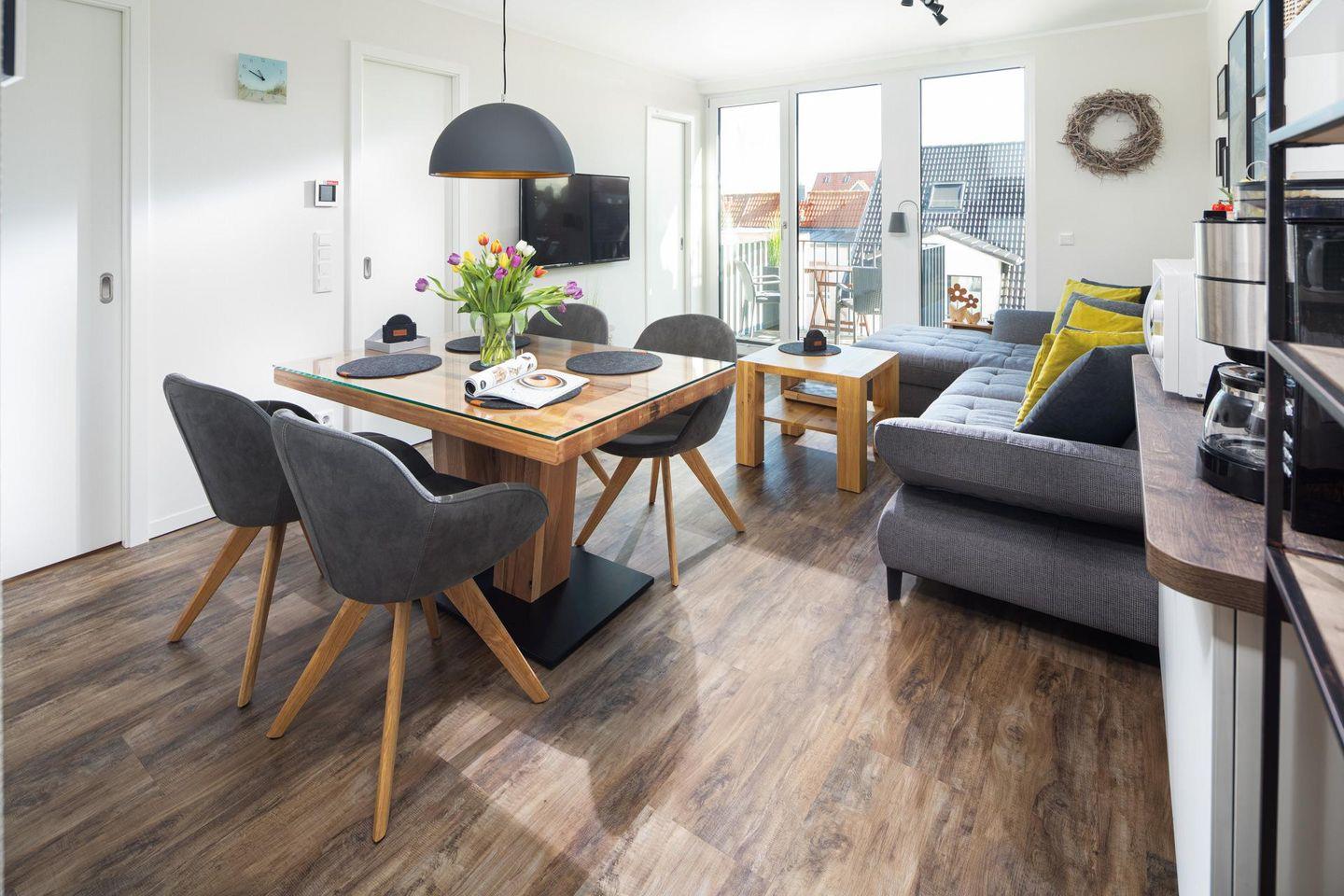Bei der Gestaltung der Wohnung wurde Wert auf eine moderne und hochwertige Einrichtung gelegt. Die Wohnung bietet ein Schlafzimmer mit einem Doppelbett (1,60m x 1,90m), und ein Schlafzimmer mit einem Einzelbett (ausziehbar zum Doppelbett) mit je 0,80m x 2,00m einzelnen Matratzen. Der Wohnbereich besteht aus einer Sofaecke, einem Esstisch und einer offenen Küche. Neben WLAN und Flachbildfernseher, steht den Gästen auch Netflix zur Verfügung. Ein Highlight der Wohnung ist der kleine Balkon, der nach Osten ausgerichtet ist. Im Hof des Hauses gibt es Abstellmöglichkeiten für Fahrräder. Eine Waschmaschine und ein Wäschetrockner stehen im Haus zur gemeinschaftlichen Nutzung zur Verfügung (Münzeinwurf). Haustiere sind in dieser Wohnung nicht erlaubt.