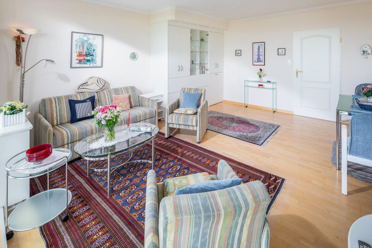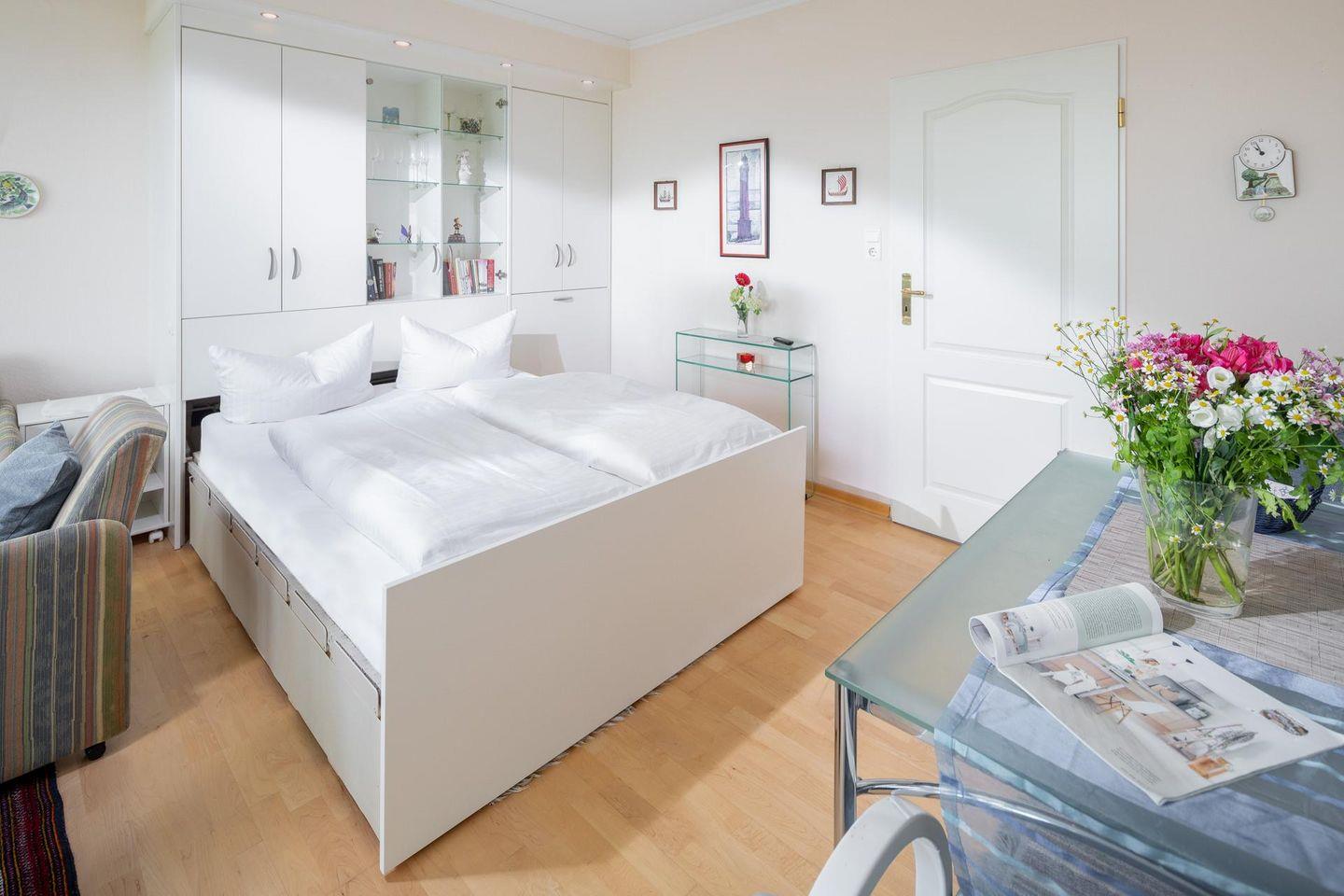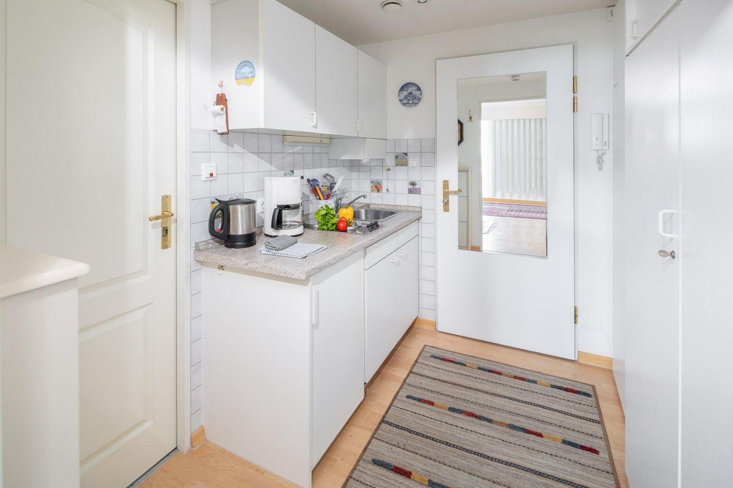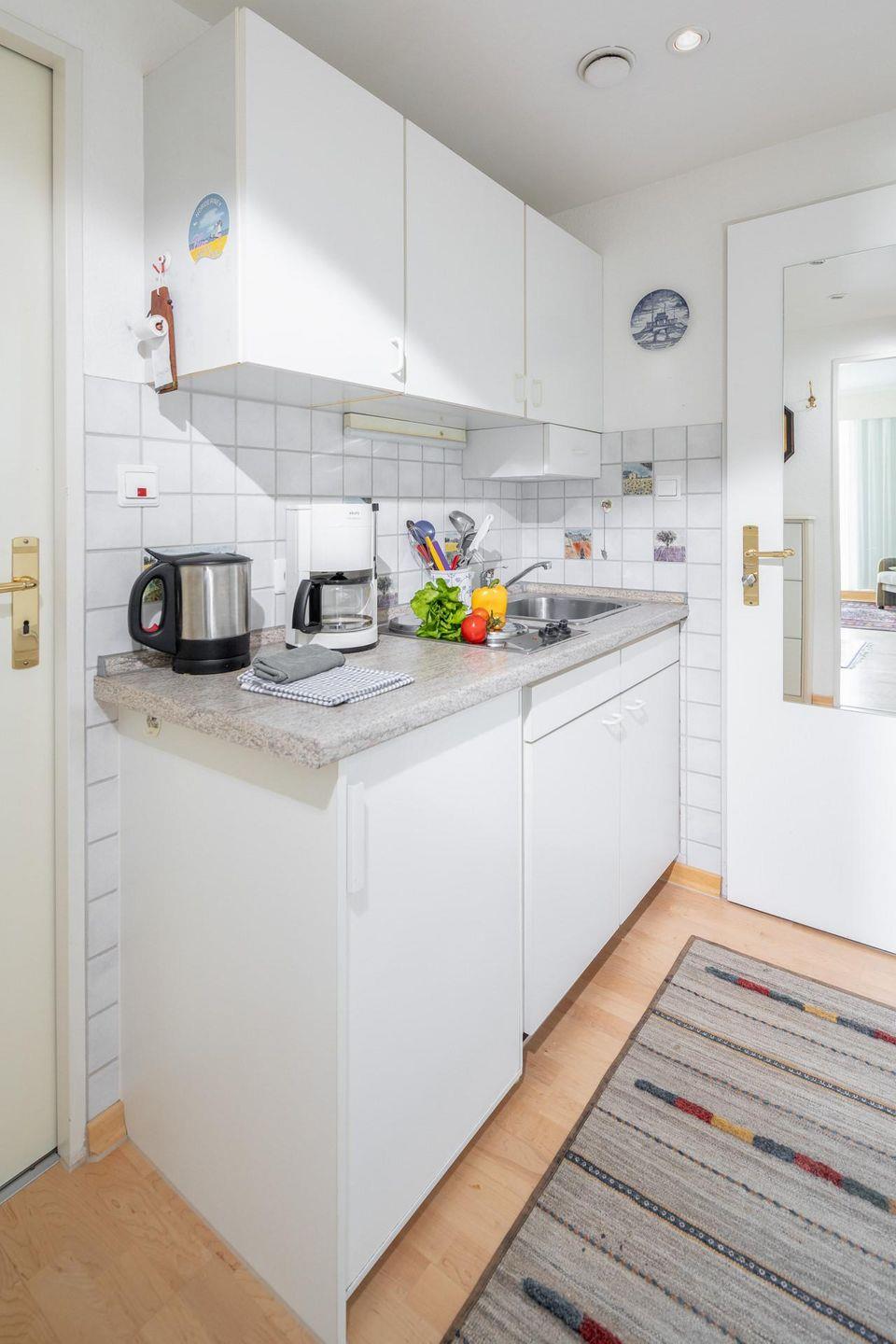 Das Wohn-/Schlafzimmer ist mit einem ausfahrbaren Doppelbett (Bettbreite 150 cm) und einer zusätzlichen Schlafcouch ausgestattet. Zudem gibt es einen Esstisch mit Stühlen. Im Flur der Wohnung befindet sich eine kleine Pantryküche. Sie ist mit allem Nötigen ausgestattet. Das Badezimmer der Wohnung ist mit einer Dusche, einem WC und einem Handwaschbecken ausgestattet. Im Apartmenthaus "Kaiserhof" stehen den Bewohnern eine Waschmaschine und ein Wäschetrockner (beide mit Münzeinwurf) zur Verfügung. Zusätzlich steht eine Sauna bereit, die ebenfalls gegen Münzeinwurf nutzbar ist. Es ist zu beachten, dass das Schwimmbad aufgrund eines technischen Defektes geschlossen ist. Fahrräder können vor dem Haus (Nordseite) oder im Fahrradraum abgestellt werden. Hunde sind in dieser Wohnung nicht erlaubt.