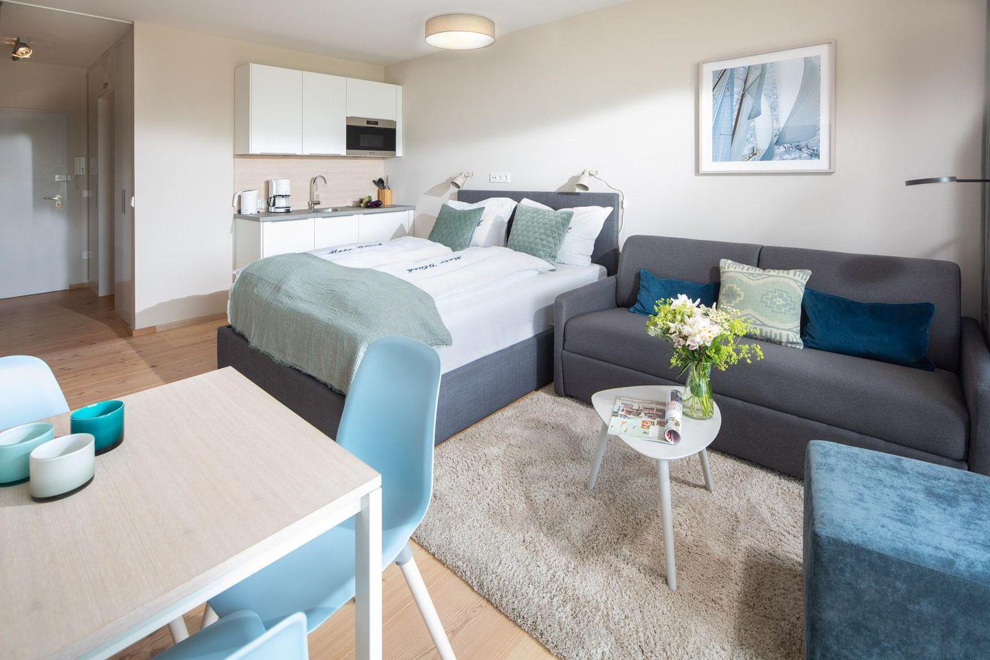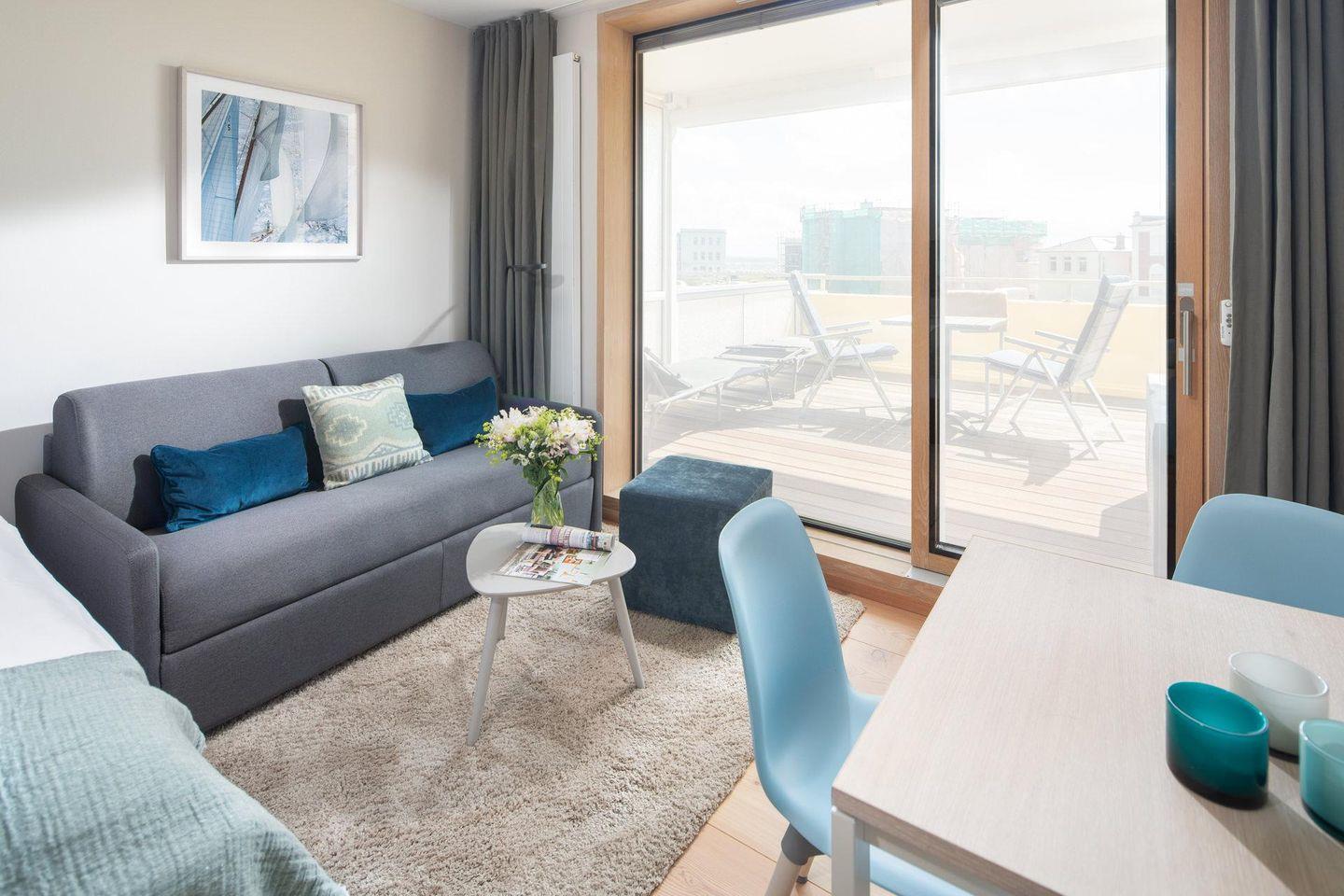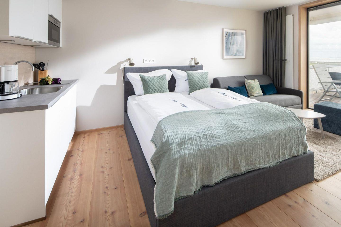 Es wurde Wert auf eine hochwertige Ausstattung (u. a. massiv, weiß gebleichte Lärchendielen, maßgefertigte Möbel) gelegt. Die bodentiefen Schiebetüren lassen viel Tageslicht ins Innere. Der Wohn-Ess- und Küchenbereich ist mit einer Küchenzeile und einem Doppelbett (1,70m x 2,10m) ausgestattet. Das moderne Badezimmer ist mit einer ebenerdigen Dusche ausgestattet. Von der Dachterrasse, die windgeschützt und nach Süd-Westen ausgerichtet ist, hat man einen direkten Blick auf das Meer. Waschmaschine und Wäschetrockner befinden sich im Haus und stehen (für die gemeinschaftliche Nutzung gegen Münzeinwurf) zur Verfügung, was besonders für längere Aufenthalte von Vorteil ist. Haustiere sind in der Wohnung nicht erlaubt.