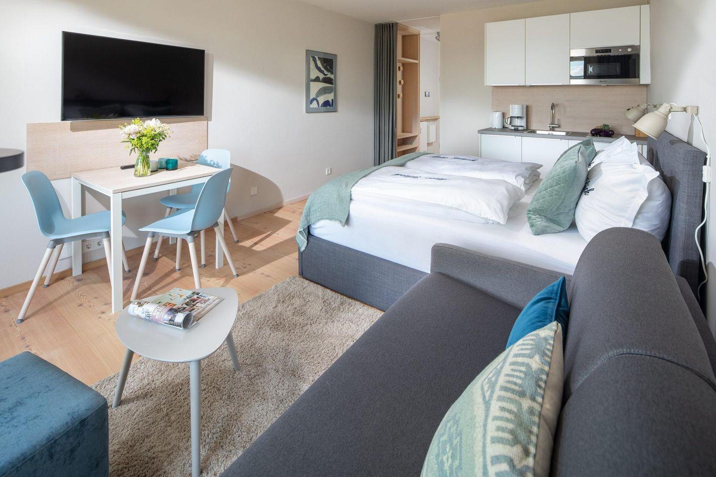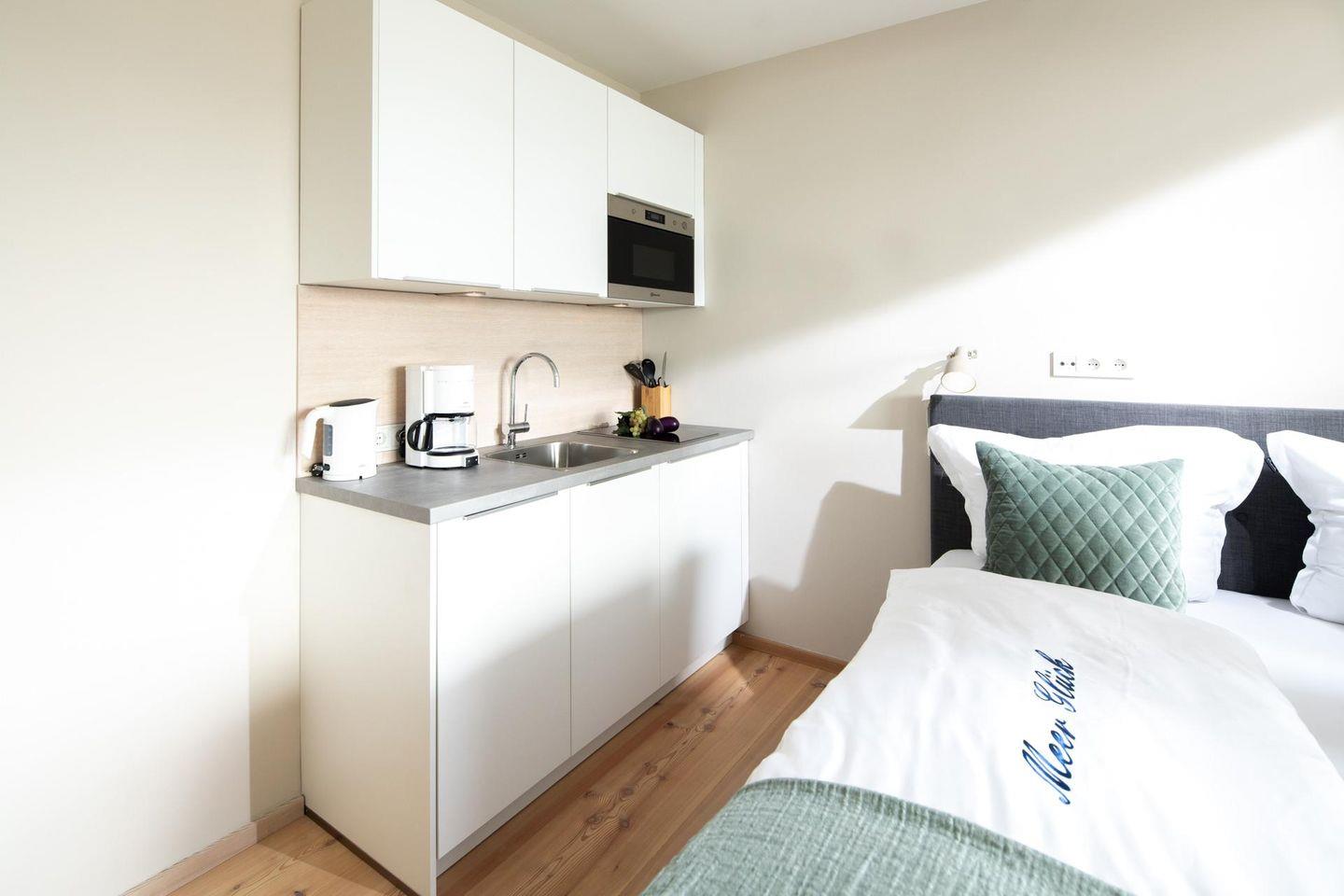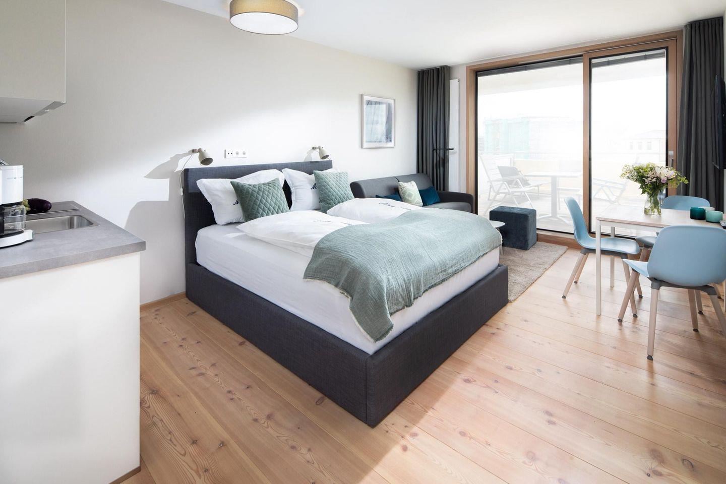 Es wurde Wert auf eine hochwertige Ausstattung (u. a. massiv, weiß gebleichte Lärchendielen, maßgefertigte Möbel) gelegt. Die bodentiefen Schiebetüren lassen viel Tageslicht ins Innere. Der Wohn-Ess- und Küchenbereich ist mit einer Küchenzeile und einem Doppelbett (1,70m x 2,10m) ausgestattet. Das moderne Badezimmer ist mit einer ebenerdigen Dusche ausgestattet. Von der Dachterrasse, die windgeschützt und nach Süd-Westen ausgerichtet ist, hat man einen direkten Blick auf das Meer. Waschmaschine und Wäschetrockner befinden sich im Haus und stehen (für die gemeinschaftliche Nutzung gegen Münzeinwurf) zur Verfügung, was besonders für längere Aufenthalte von Vorteil ist. Haustiere sind in der Wohnung nicht erlaubt.