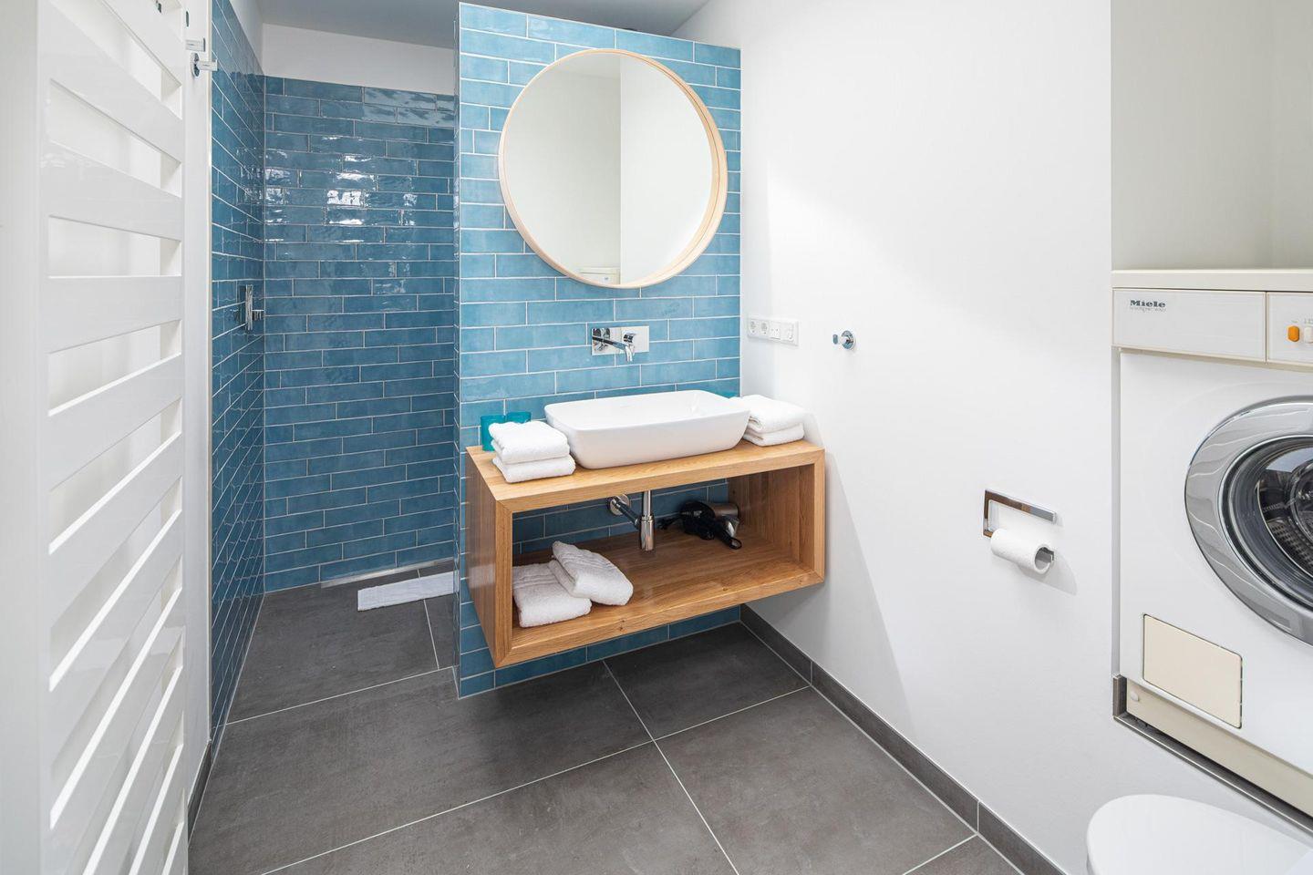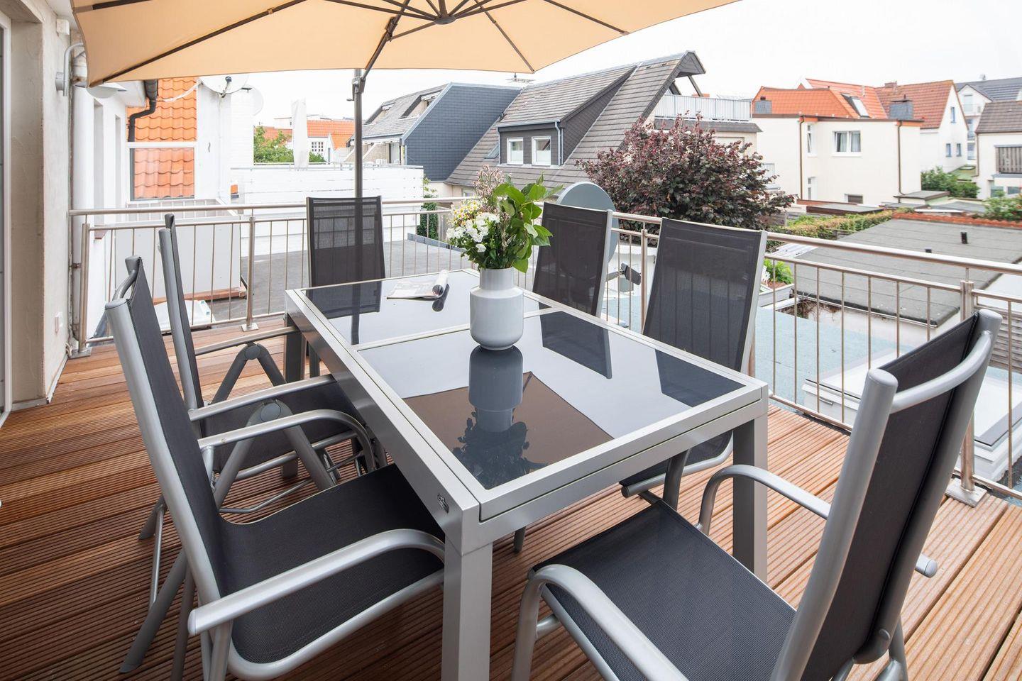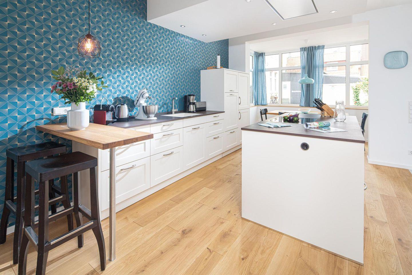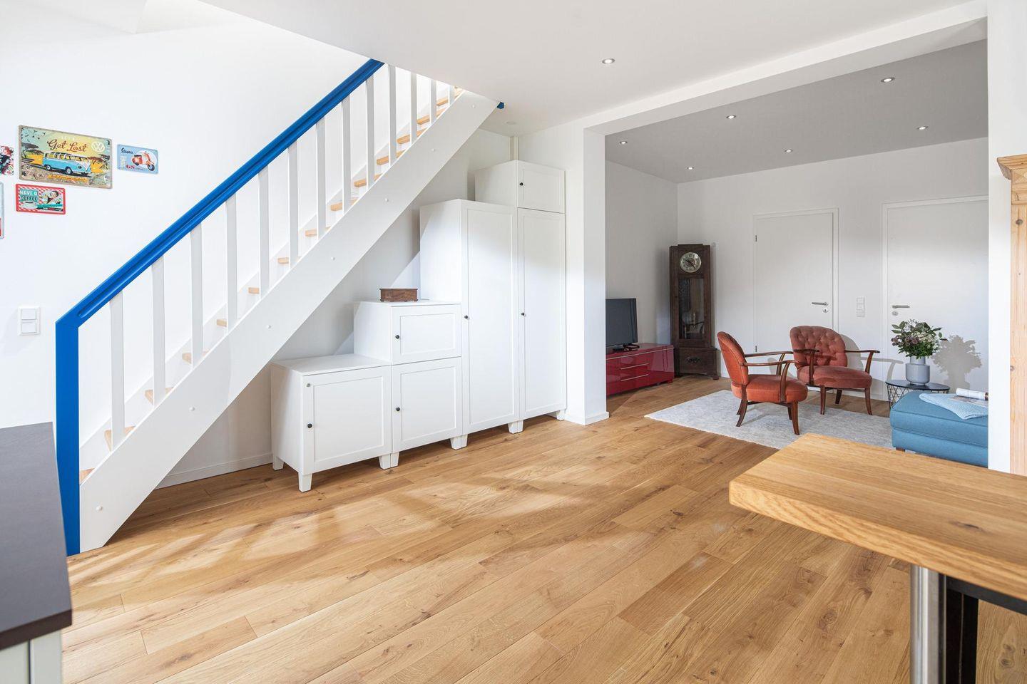 Das Ferienhaus verfügt über insgesamt drei Schlafzimmer, jedes ausgestattet mit einem komfortablen Doppelbett (Maße: 1,60m x 2,00m, offen an der Rückseite). Ein Schlafzimmer befindet sich im Erdgeschoss, während die beiden anderen im Dachgeschoss untergebracht sind. Vom Flur des Dachgeschosses aus gelangt man auf die Dachterrasse, die in östlicher Ausrichtung liegt. Hier steht ein großer Tisch mit 6 Stühlen. Der moderne Küchenbereich des Hauses ist mit einer Kochinsel ausgestattet. Hier finden sich auch Extras wie eine Kitchen Aid oder eine Nespressomaschine. Die Badezimmer des Hauses sind hell und tageslichtdurchflutet. Das Hauptbadezimmer ist mit einer Dusche, einem Handwaschbecken und einem WC ausgestattet. Zudem steht eine Waschmaschine zur Verfügung. Es ist wichtig anzumerken, dass die WC-Installation im Hauptbadezimmer lediglich 4-8 cm von der Seitenwand entfernt installiert ist – eine Besonderheit, auf die vorsorglich hingewiesen wird. Zusätzlich befindet sich im Erdgeschoss ein zweites Badezimmer mit Dusche, WC und Waschbecken. Hunde sind in diesem Ferienhaus nicht erlaubt.
