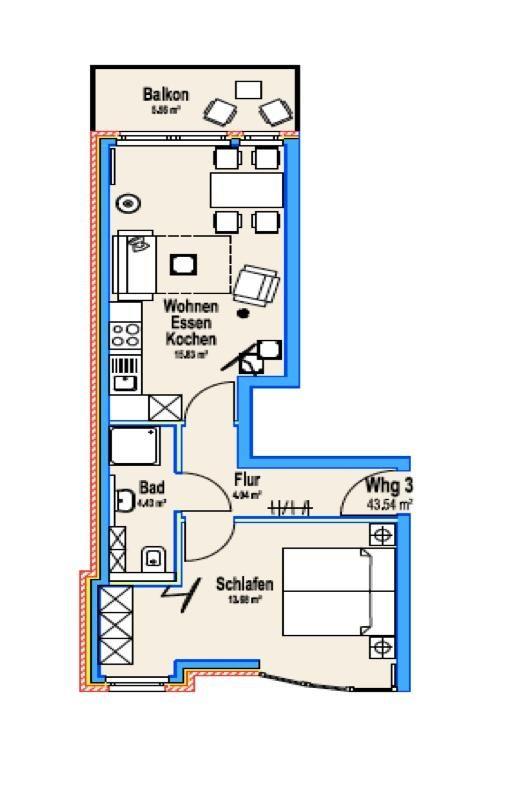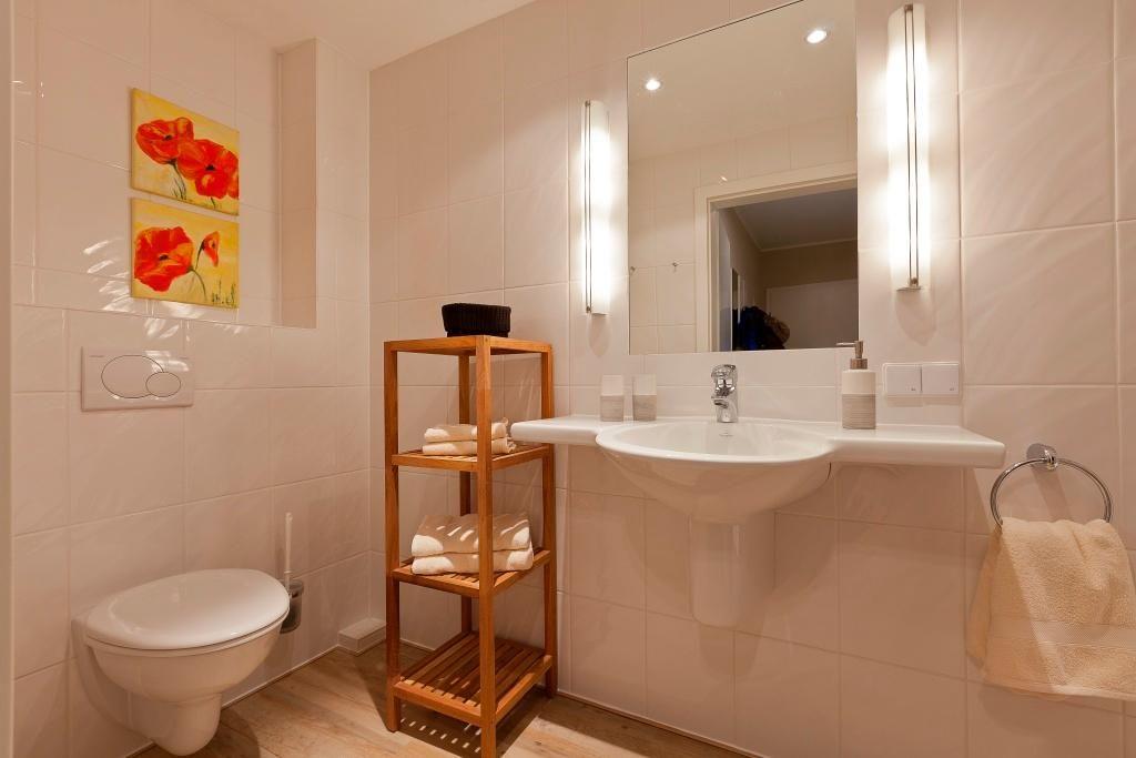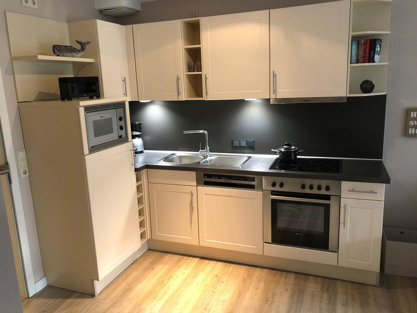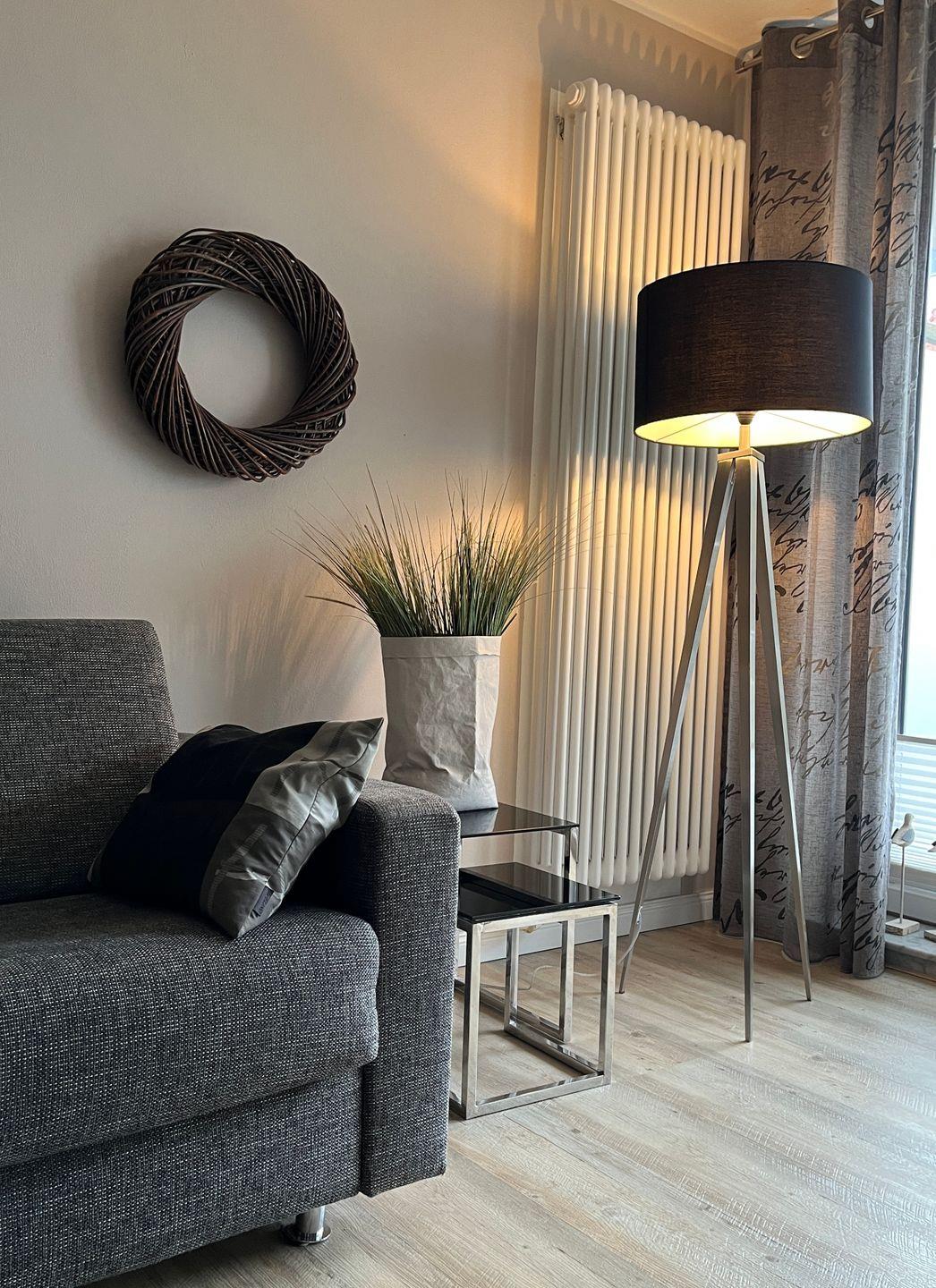 Die Wohnung ist modern ausgestattet. Das Schlafzimmer bietet mit einem Doppelbett Platz für bis zu zwei Personen. Zusätzlich können bis zu zwei weitere Gäste auf der Schlafcouch im Wohnzimmer übernachten. Der Wohnbereich verfügt über einen Smart-TV und die Kleiderschränke sind mit einer Innenbeleuchtung ausgestattet. Ein Highlight der Wohnung ist der ca. 7 qm große Balkon. Er liegt straßenabgewandt nach Süden. Zusätzlich steht eine Sauna bereit, die gegen Münzeinwurf (gemeinschaftlich) nutzbar ist. Ebenso erfordern die gemeinschaftlich nutzbare Waschmaschine und der Wäschetrockner den Einwurf von Münzen. Haustiere sind in dieser Ferienwohnung nicht erlaubt.