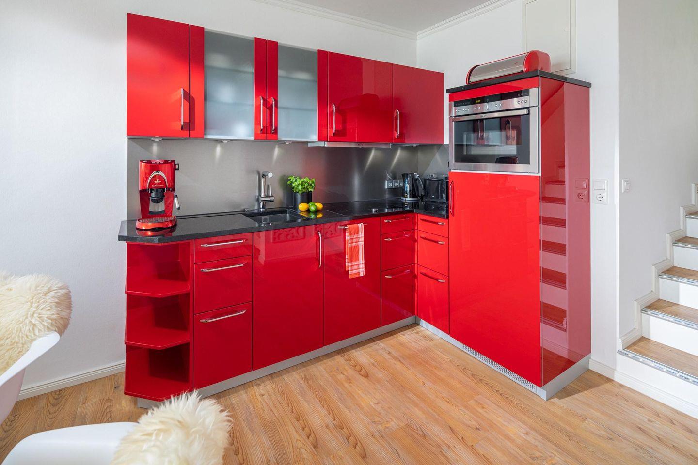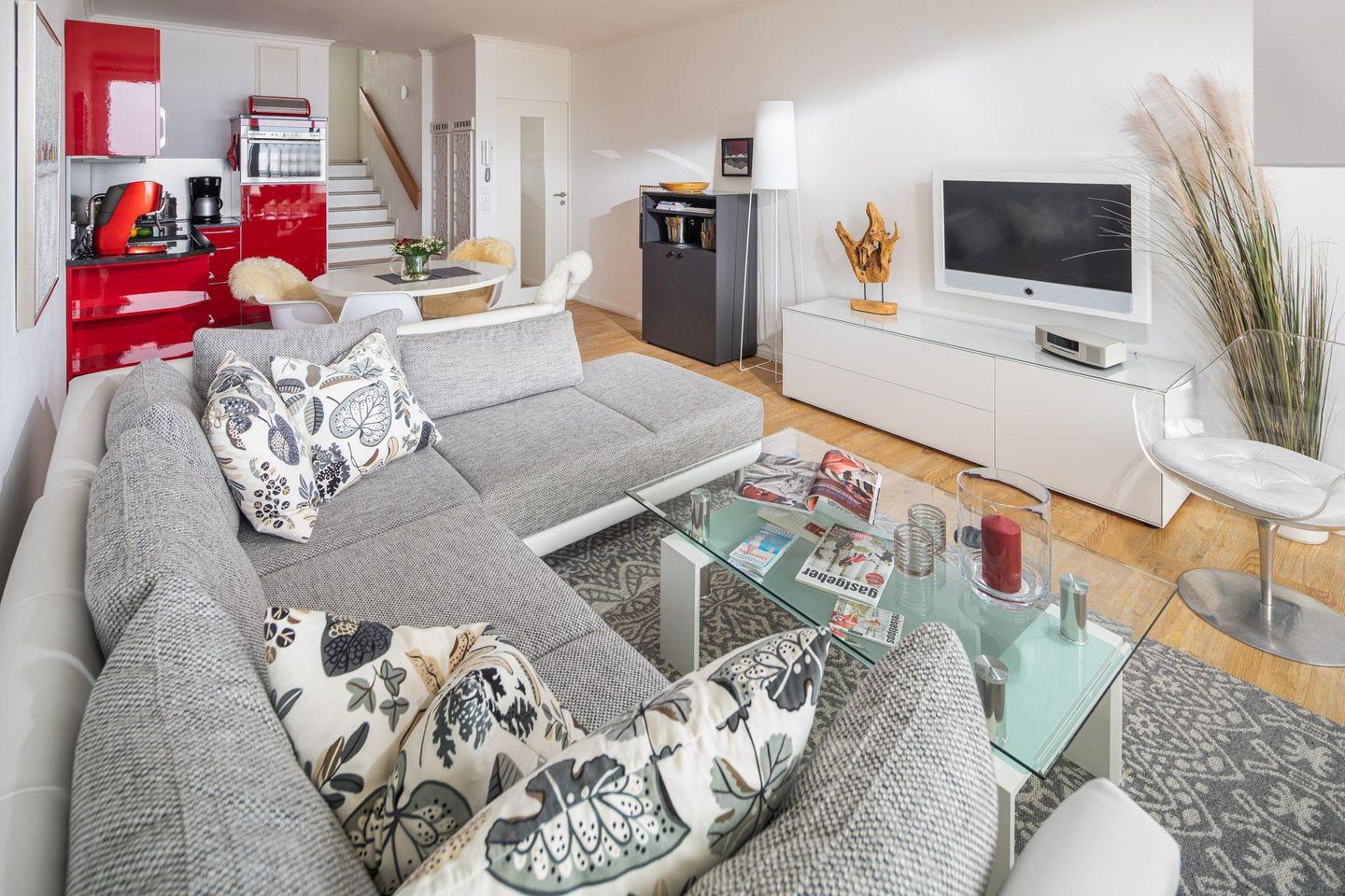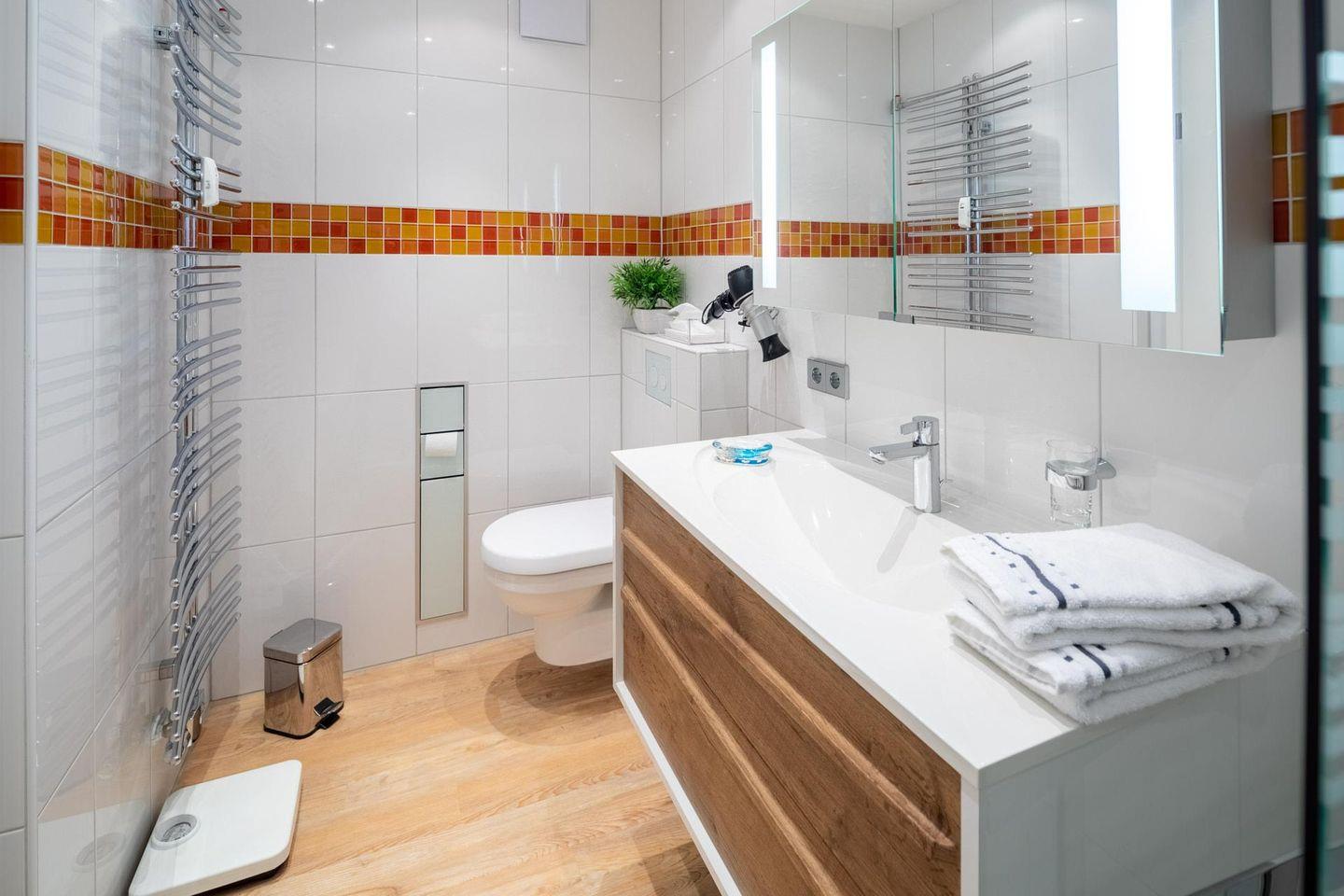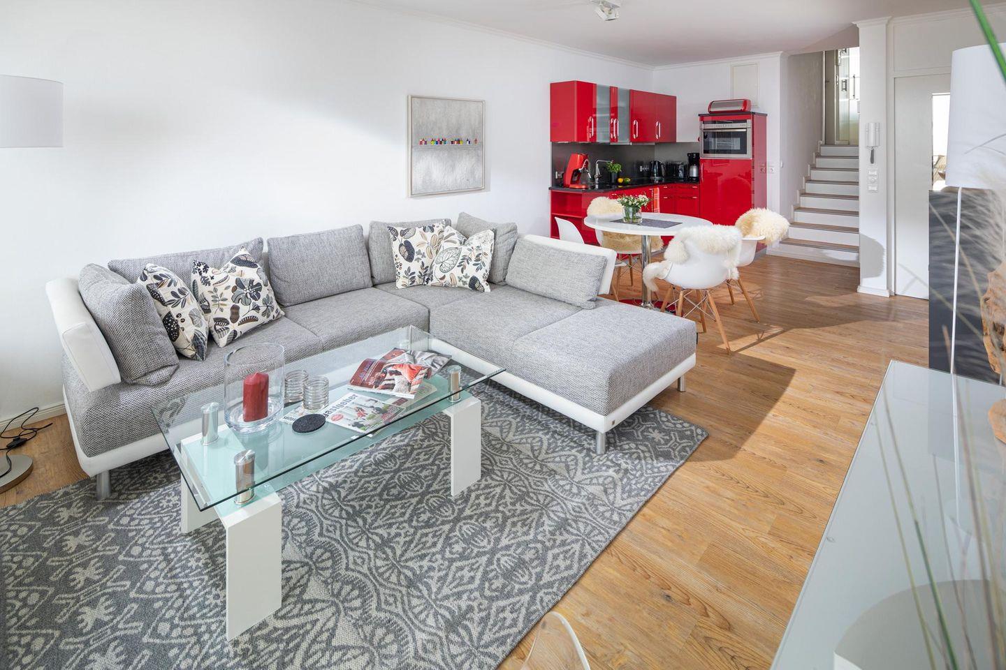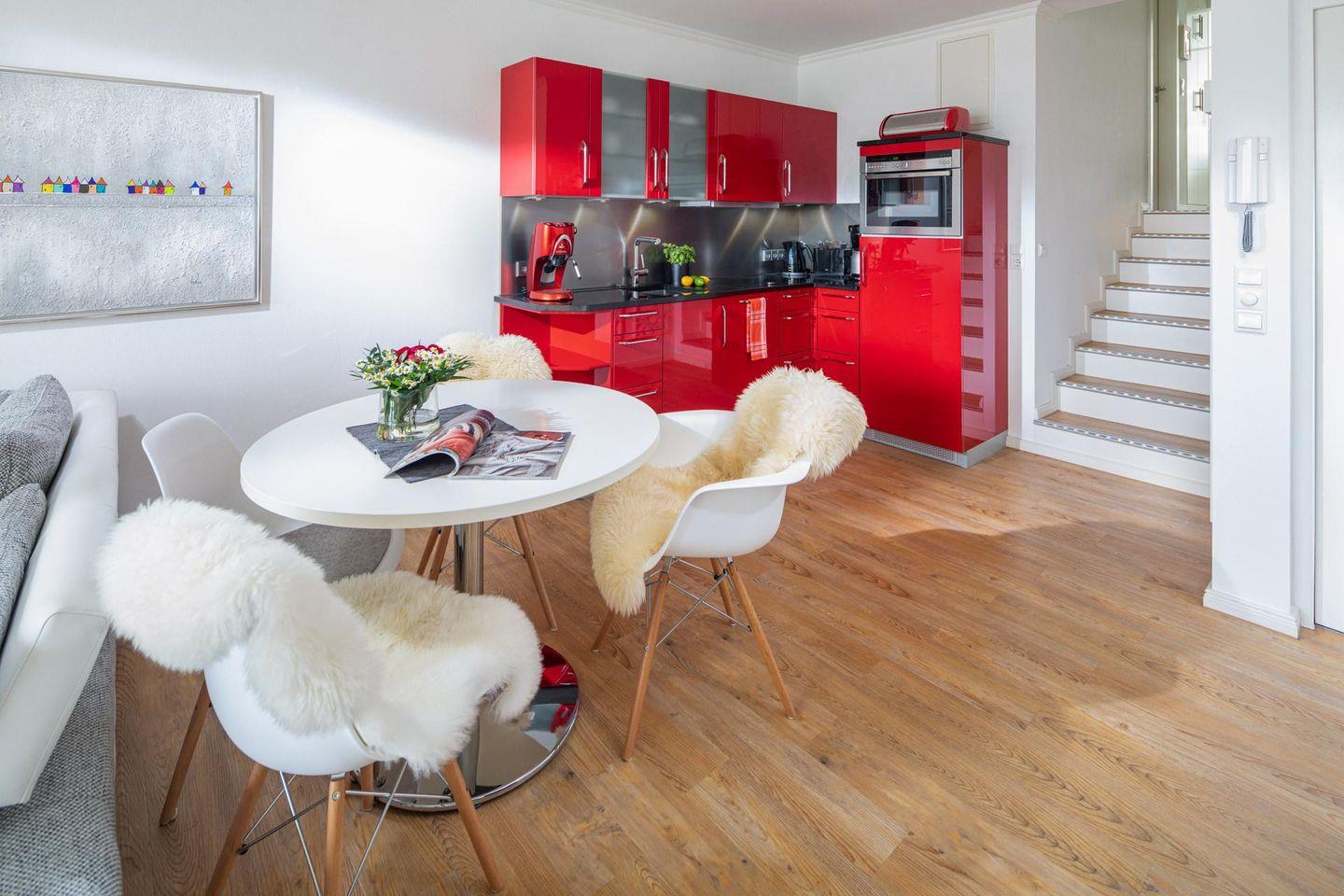 Bei der Einrichtung der Wohnung wurde Wert auf hochwertige Materialien und helle Farben gelegt. Sie verfügt über Außenjalousien und elektrische Innenjalousien im Schlafzimmer, eine Fußbodenheizung im Bad und einen Handtuchwärmer. Die zur Meerseite hin ausgerichtete Loggia bietet einen windgeschützten Platz mit Blick auf das Meer. Der zweite Balkon ist zur Land- und damit Südseite ausgerichtet. Es muss beachtet werden, dass die Balkone der Wohnung nicht kindersicher sind. Daher sind in der Wohnung nur Kinder ab 14 Jahren zugelassen (Abstand der Sprossen des Balkongeländers). Im Hof des Hauses können Fahrräder abgestellt werden. Eine Waschmaschine und ein Wäschetrockner stehen zur gemeinschaftlichen Nutzung im Haus zur Verfügung (Münzeinwurf). Haustiere sind in dieser Unterkunft nicht erlaubt.