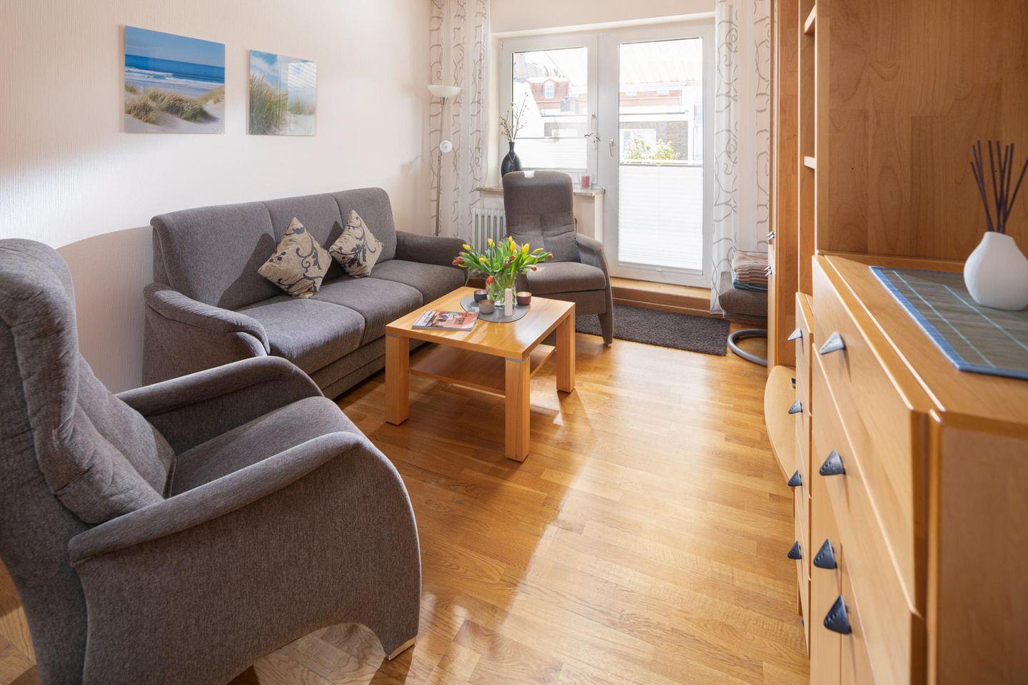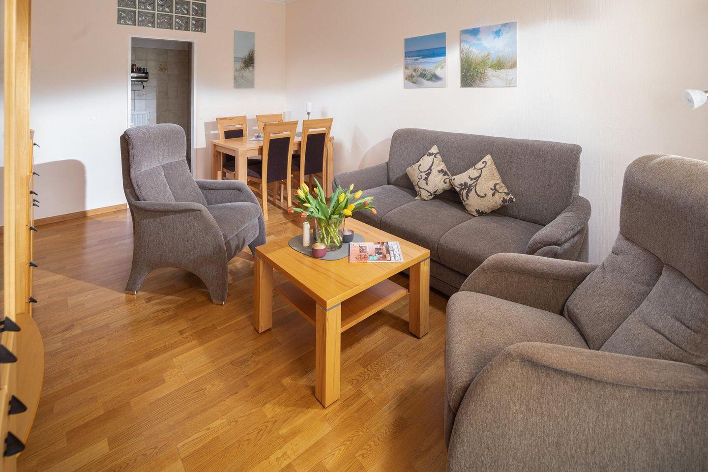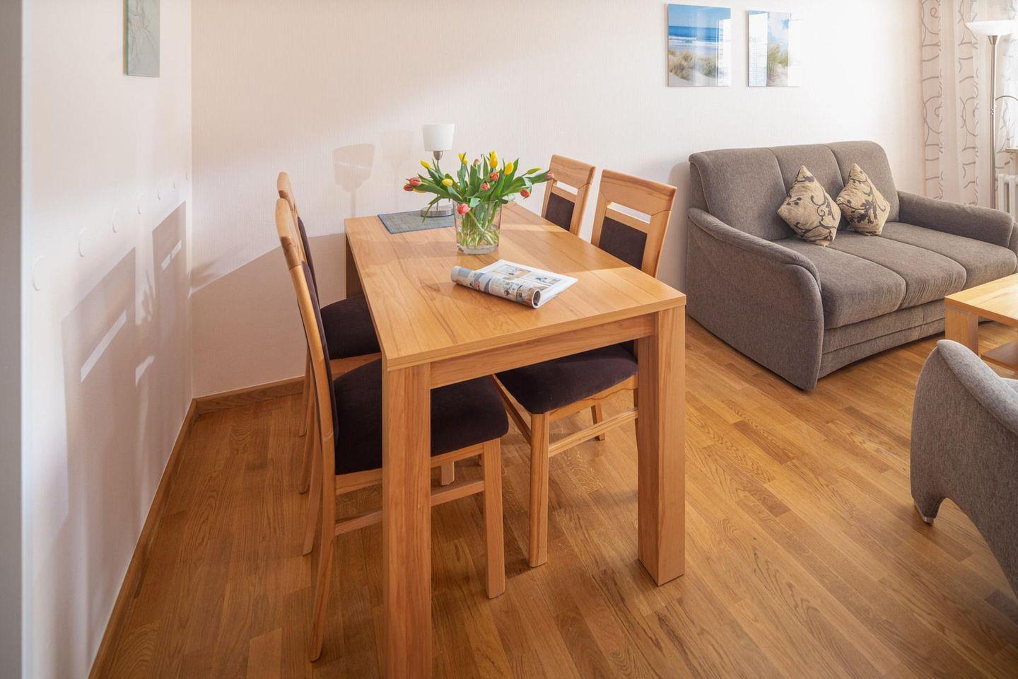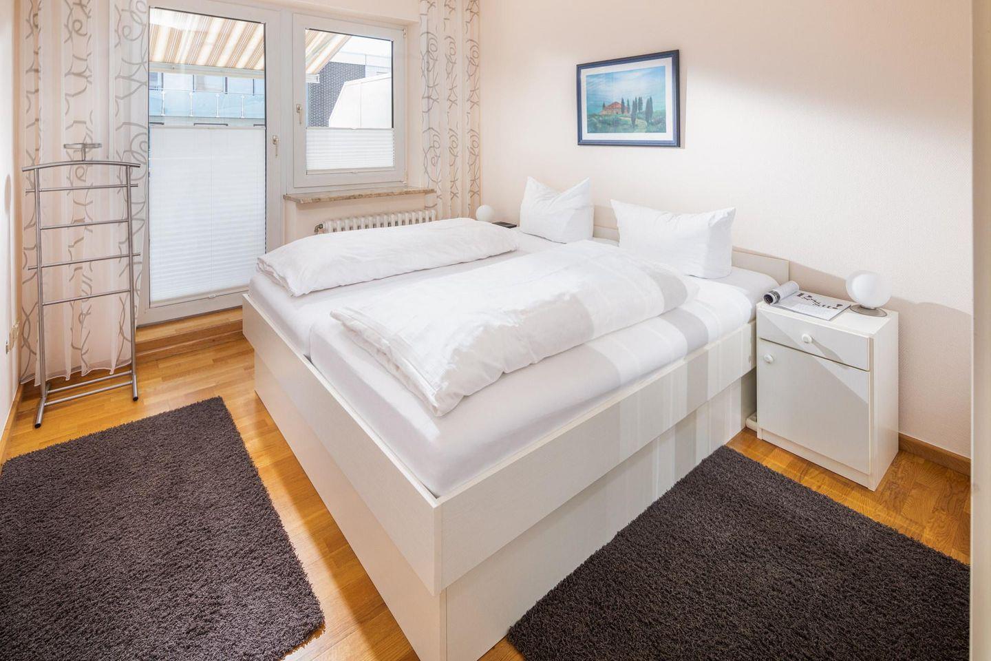 Die Wohnung verfügt über ein Schlafzimmer mit Doppelbett. Durch das Wohnzimmer gelangt man zur separaten Küche. Das moderne Badezimmer ist mit einer Dusche und einem Handtuchtrockner ausgestattet. Ein Highlight ist der Balkon zur (straßenabgewandten) Südseite. Waschmaschine und Wäschetrockner befinden sich im Keller und stehen (gegen Münzeinwurf) zur Verfügung, was besonders für längere Aufenthalte von Vorteil ist. Hier darf auch der vierbeinige Freund mitkommen, denn die Ferienwohnung heißt auch Hunde herzlich willkommen. Erlaubt ist maximal 1 kleiner Hund. Die Hundewiese befindet sich in der Nähe des Fährhafens (kein Leinenzwang).