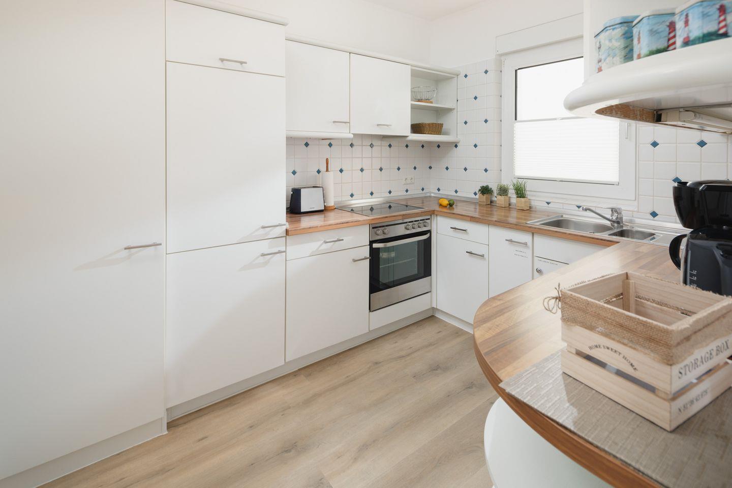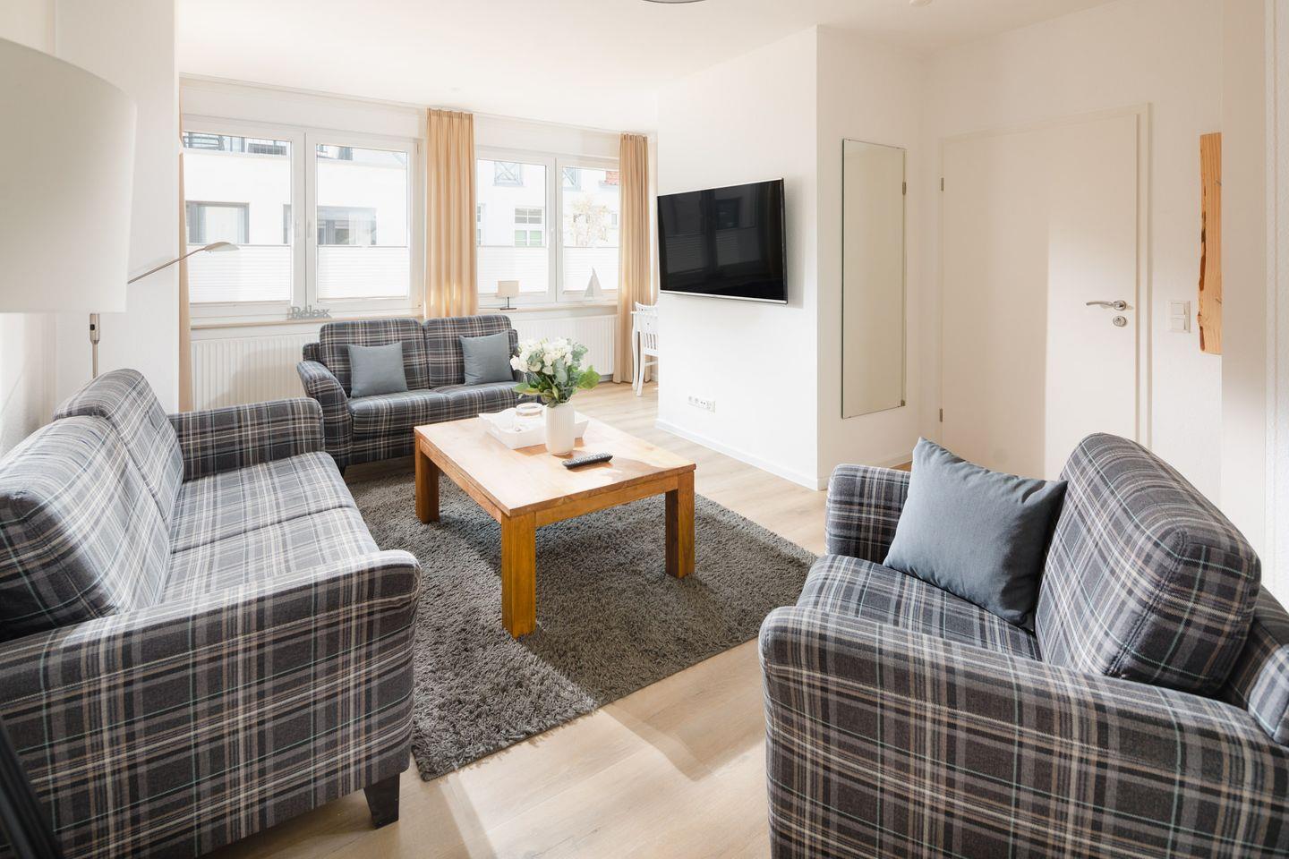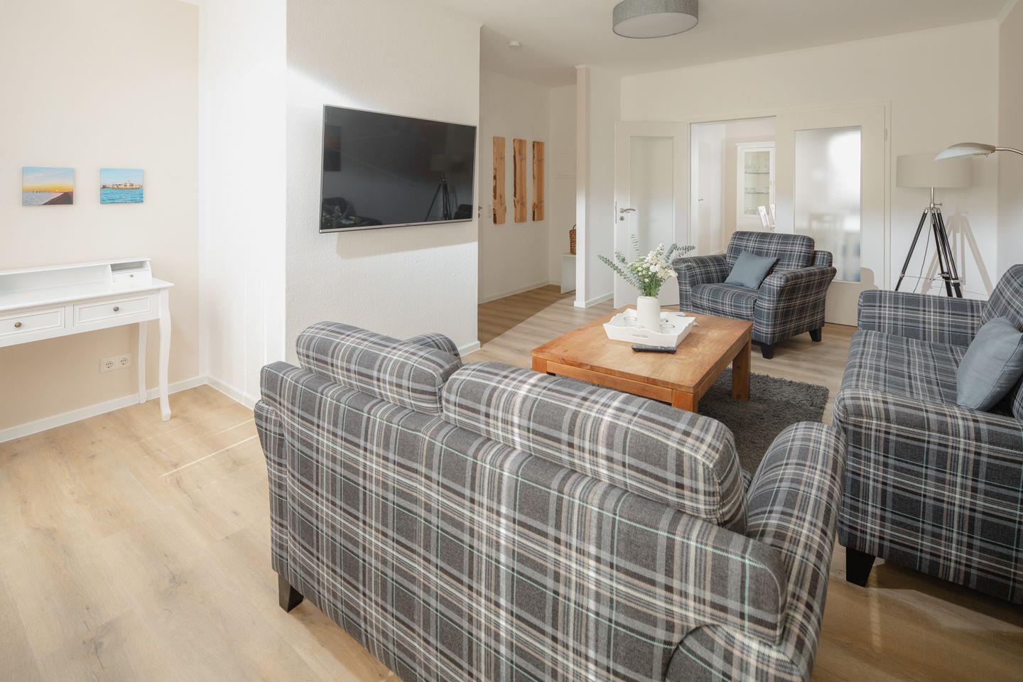 Die Wohnung verfügt über zwei Schlafzimmer, eines mit einem Doppelbett und das andere mit einem Etagenbett und einem Einzelbett. Das Badezimmer, eine separate, sehr gut ausgestattete Küche sowie ein Wohnzimmer mit separatem Esszimmer schließen das Raumangebot ab. Ein Highlight der Wohnung ist die Terrasse. Dank der Erdgeschosslage ist alles stufenlos erreichbar, was komfortabel ist. Haustiere sind in dieser Wohnung nicht erlaubt.