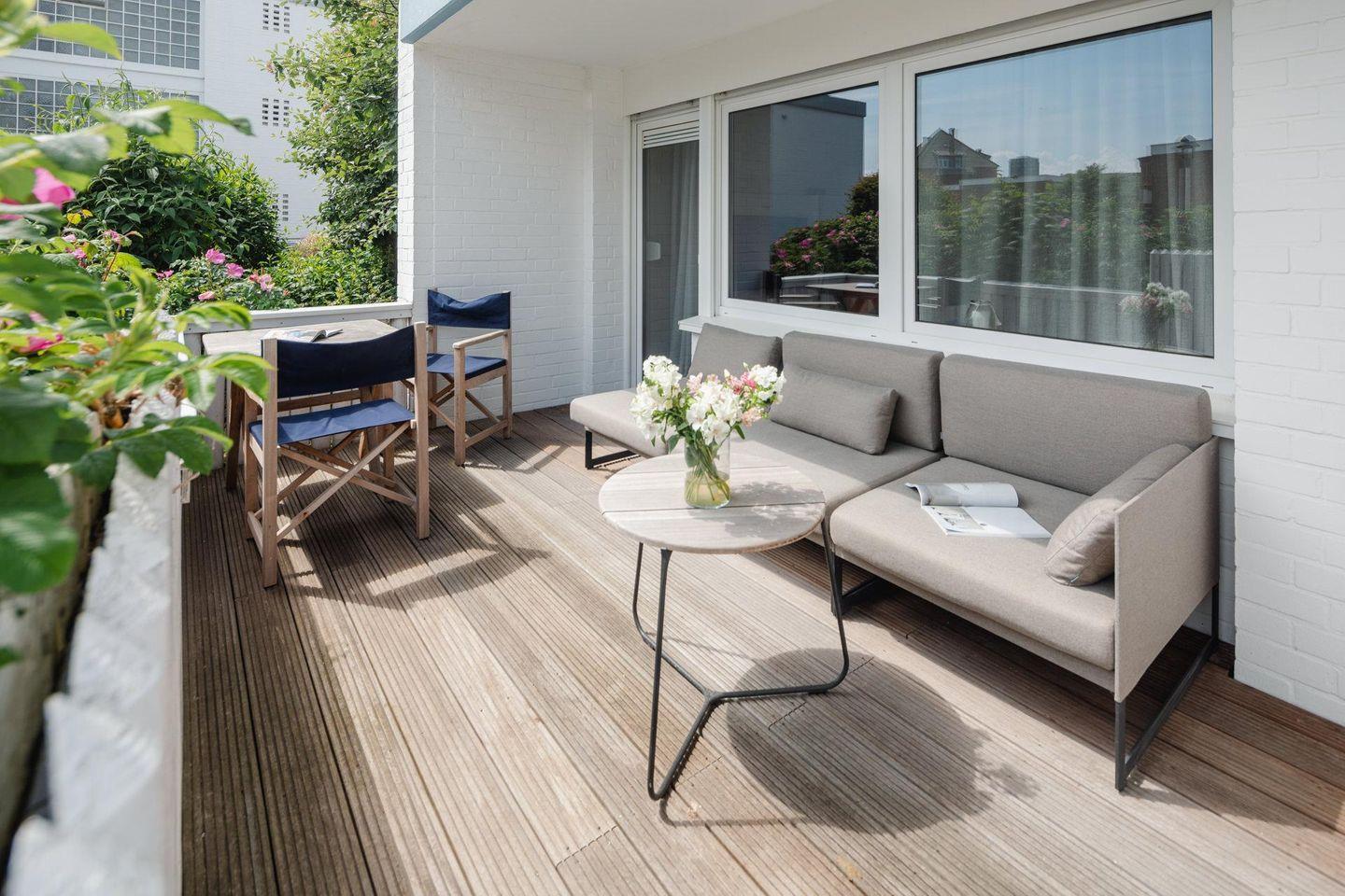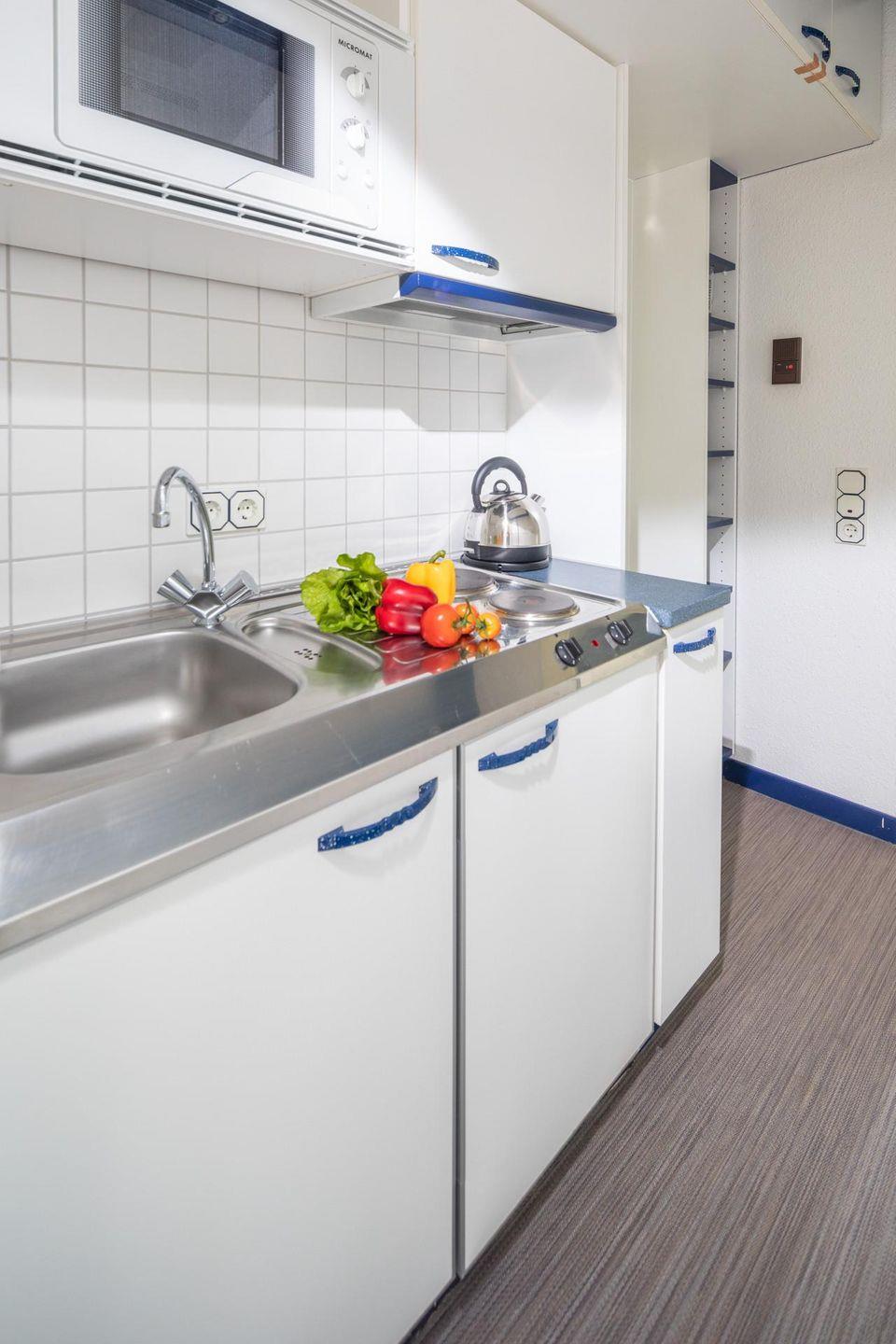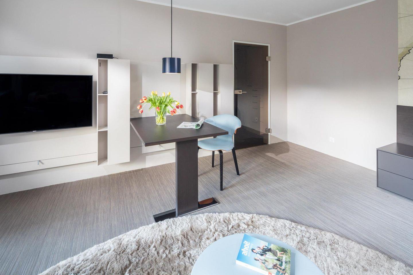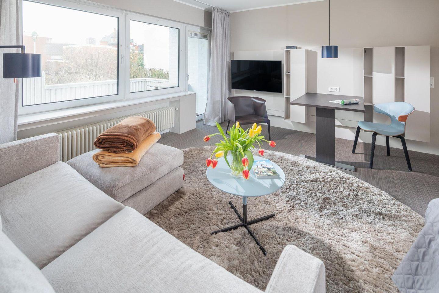 Bei der Inneneinrichtung wurde auf hochwertige Möbel Wert gelegt. Die Wohnung verfügt über ein Doppelbett (1,80 m breit). Das Bad ist mit einer Dusche ausgestattet. Zusätzlich gibt es einen knapp 10 Quadratmeter großen Balkon mit Süd-Ost-Ausrichtung. Für zusätzlichen Komfort stehen im Haus eine Gemeinschafts-Waschmaschine und ein Wäschetrockner zur Verfügung, die beide über Münzeinwurf bedient werden. Ein besonderes Highlight der Wohnanlage ist das hauseigene Schwimmbad, das den Bewohnern kostenfrei zur Verfügung steht. Es befindet sich im Untergeschoss des Gebäudes. Des Weiteren gibt es eine Sauna, die nach Einwurf von Münzen genutzt werden kann. Hunde sind in dieser Wohnung nicht erlaubt.