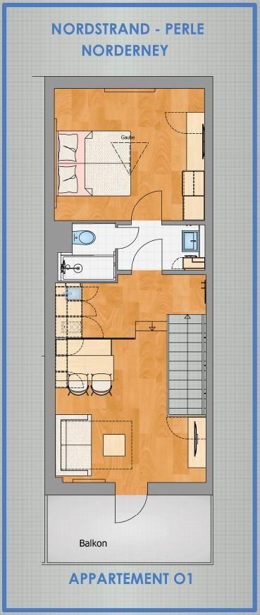 Die Wohnung O1 liegt im ersten Obergeschoss und verfügt über einen Balkon, der nach Süd-Westen ausgerichtet ist. In der Küchenzeile ist ein 2-Platten-Herd vorhanden. Ein Schlafzimmer ist mit einem Doppelbett ausgestattet. Eine weitere Schlafmöglichkeit bietet das Sofa im Wohnbereich. Fahrräder der Hausgäste können im Innenhof abgestellt werden. Waschmaschine und Wäschetrockner befinden sich im Haus (Untergeschoss) und stehen (für die gemeinschaftliche Nutzung gegen Gebühr) zur Verfügung, was besonders für längere Aufenthalte von Vorteil ist. Haustiere sind in dieser Wohnung nicht erlaubt.
