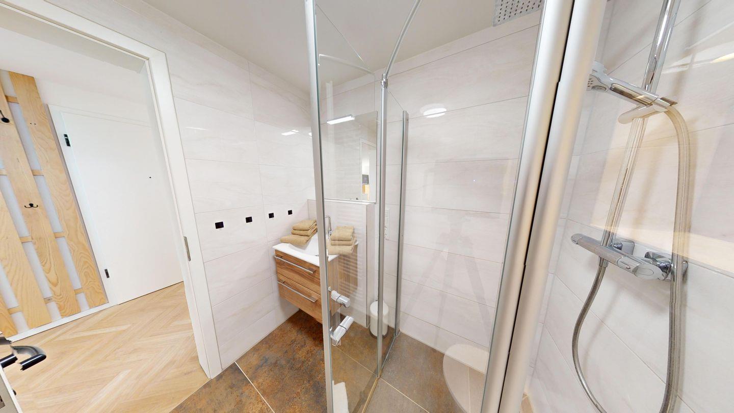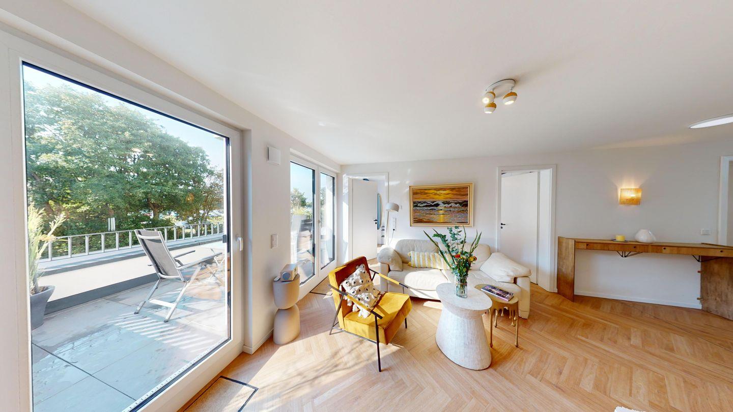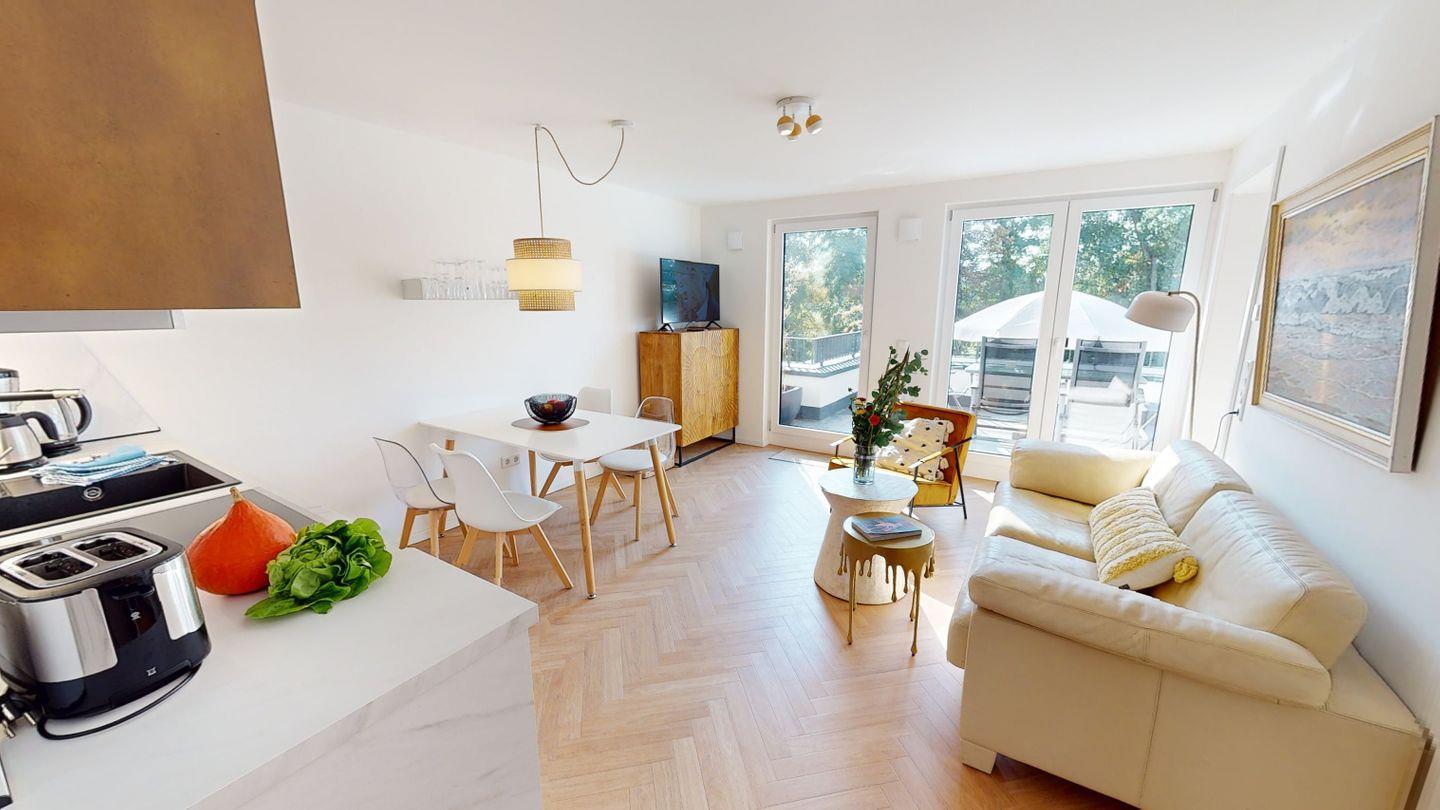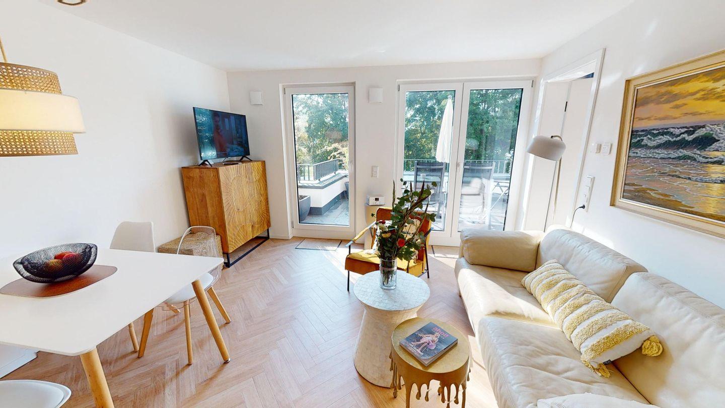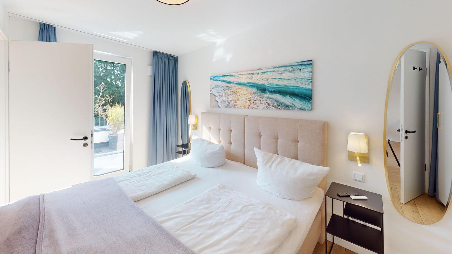 Die Wohnung verfügt über zwei Schlafzimmer, die beide mit einem Doppelbett ausgestattet sind. Das Wohnzimmer inklusive Küchenzeile und Essbereich bietet einen Zugang zur Dachterrasse. Das Badezimmer ist mit einer ebenerdigen Dusche eingerichtet.