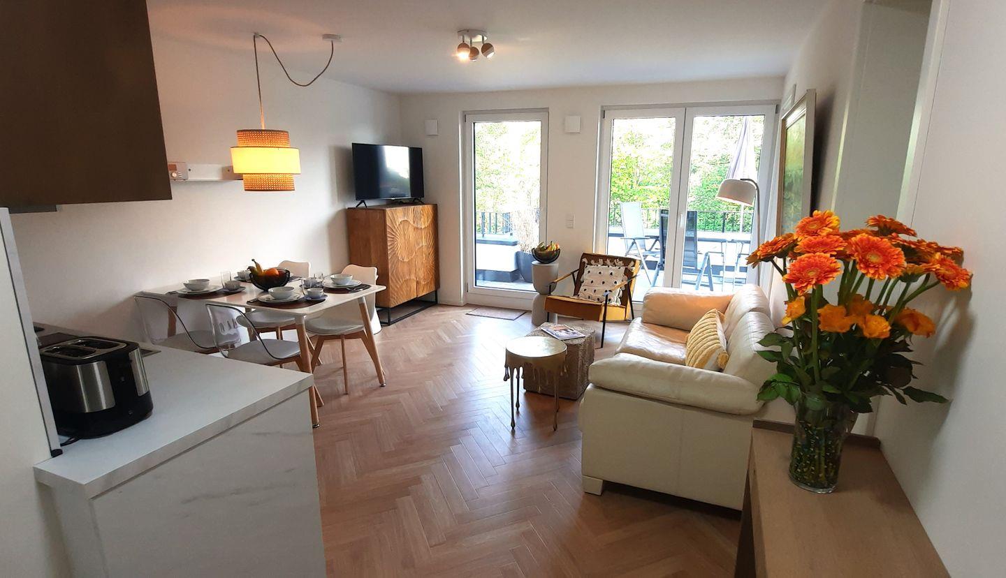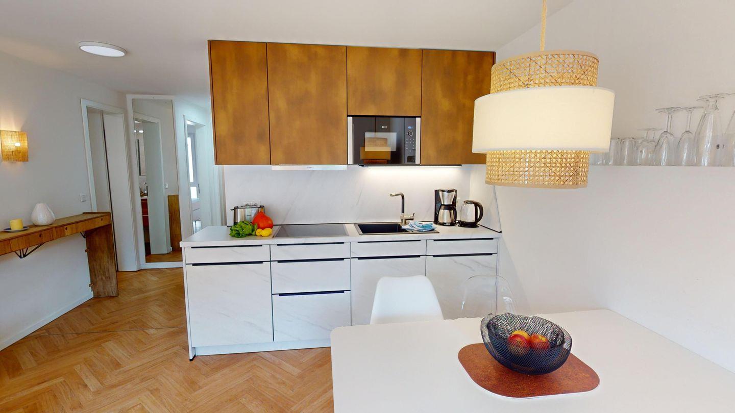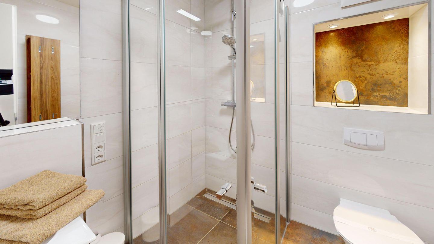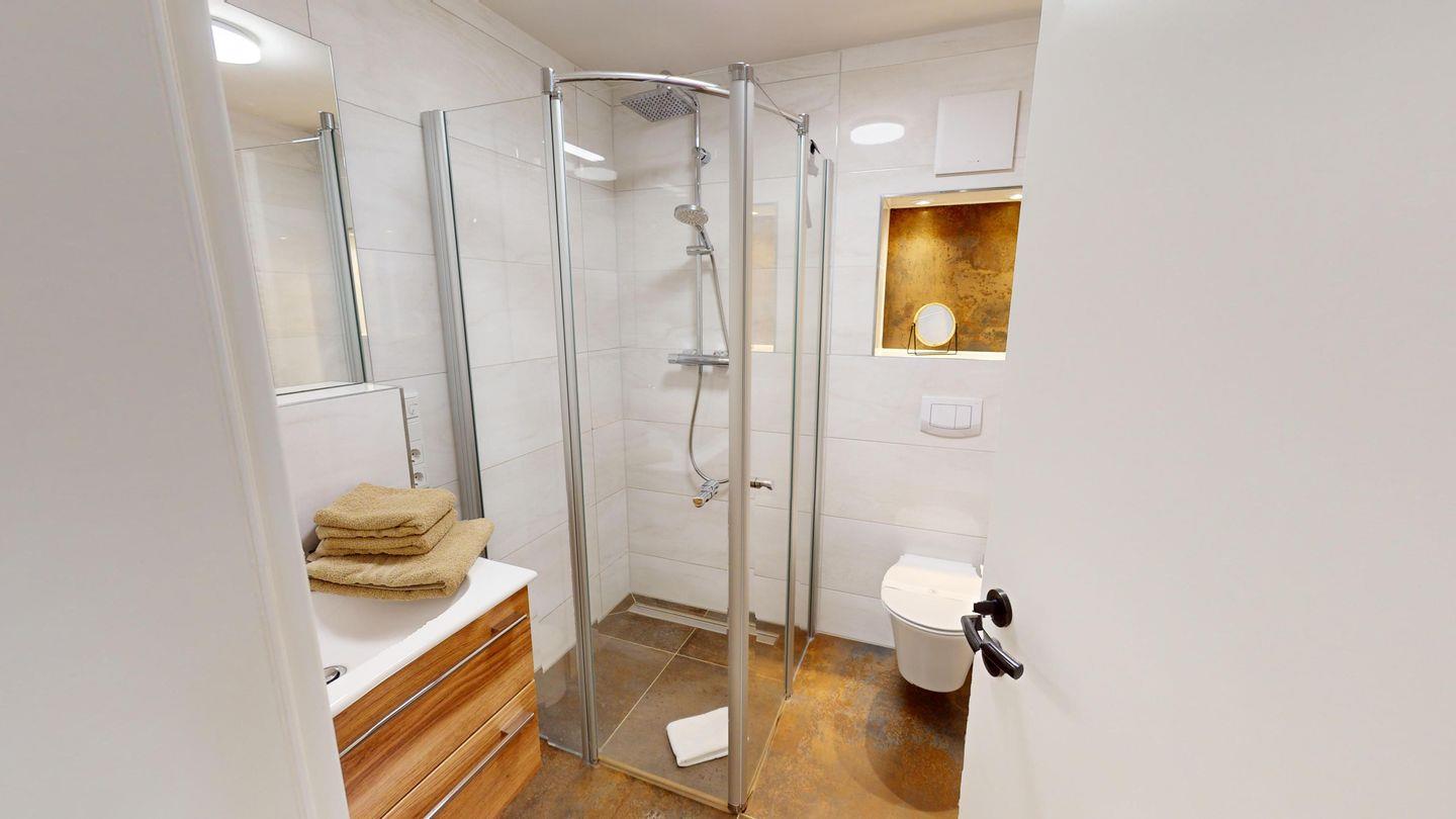 Die Wohnung verfügt über zwei Schlafzimmer, die beide mit einem Doppelbett ausgestattet sind. Das Wohnzimmer inklusive Küchenzeile und Essbereich bietet einen Zugang zur Dachterrasse. Das Badezimmer ist mit einer ebenerdigen Dusche eingerichtet.
