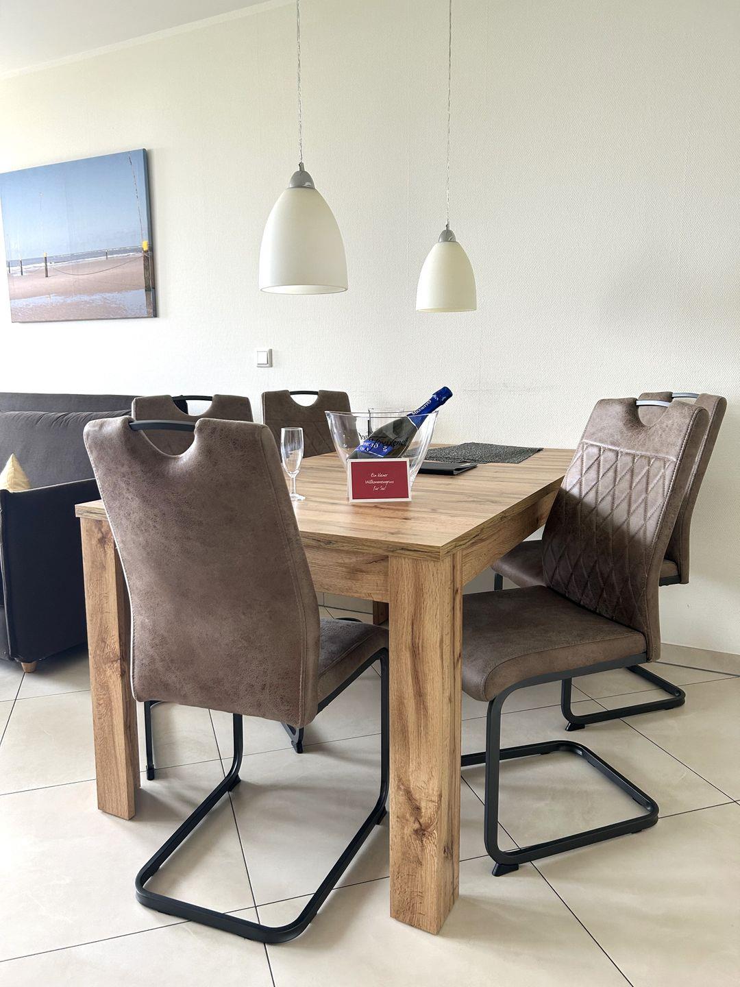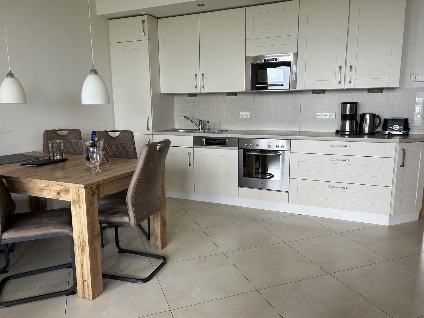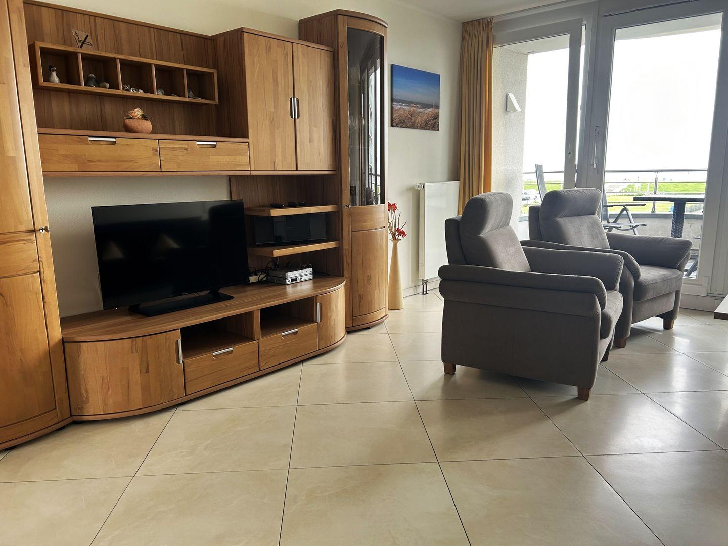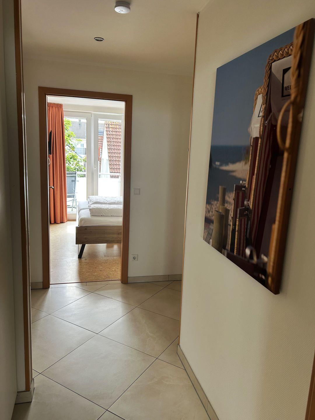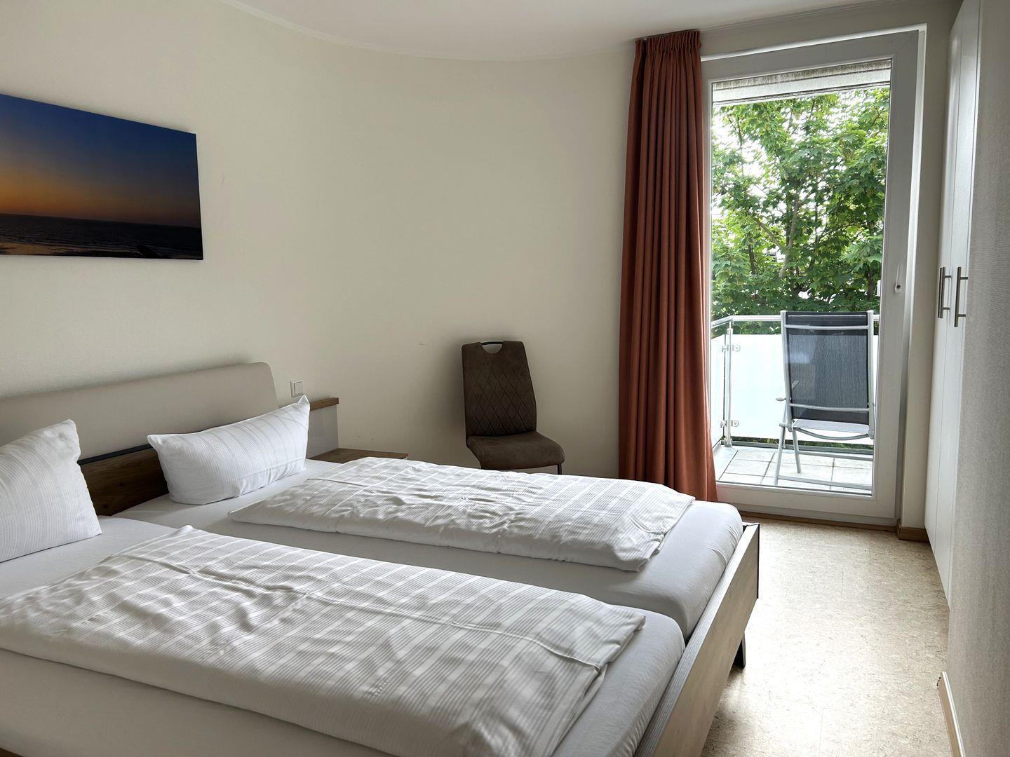 Das schöne Appartement in der 1. Etage verfügt über zwei separate Schlafzimmer mit je einem Doppelbett (TV), Gäste-WC, Wohn-Schlafraum (Schlafsofa) mit Küchenzeile (4-Plattenherd, Spülmaschine, Backofen), Essecke, Diele, Dusche/WC, Kabel-TV und Telefon. Beide Schlafzimmer haben einen Zugang zum Balkon Richtung Hof.