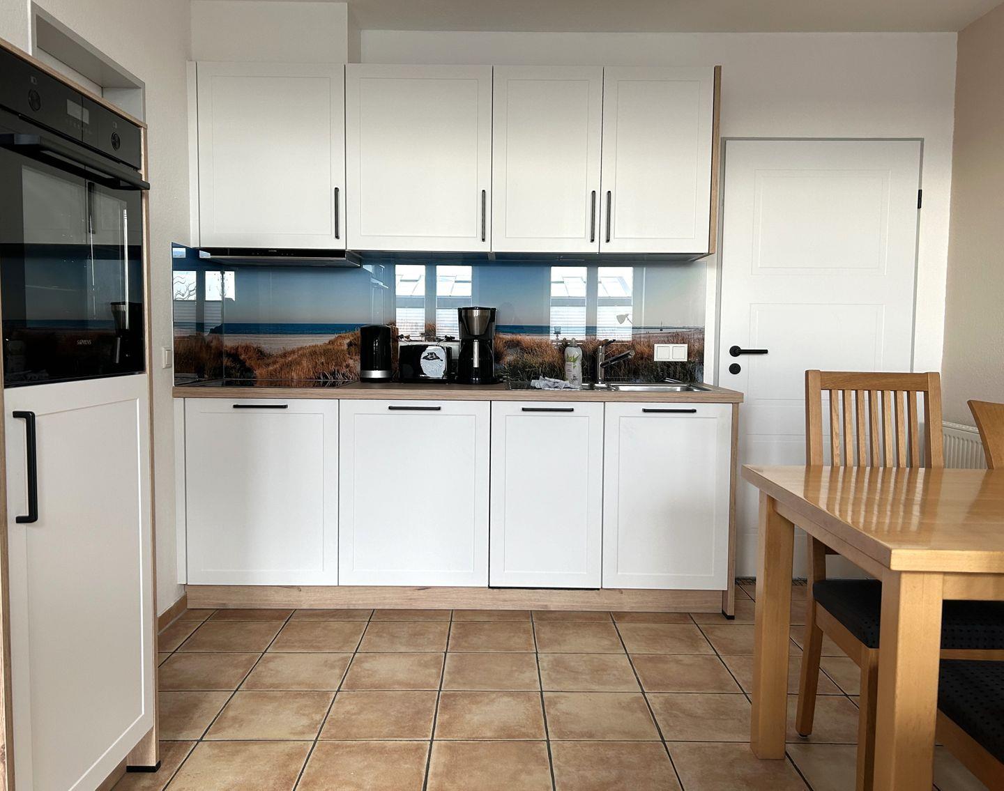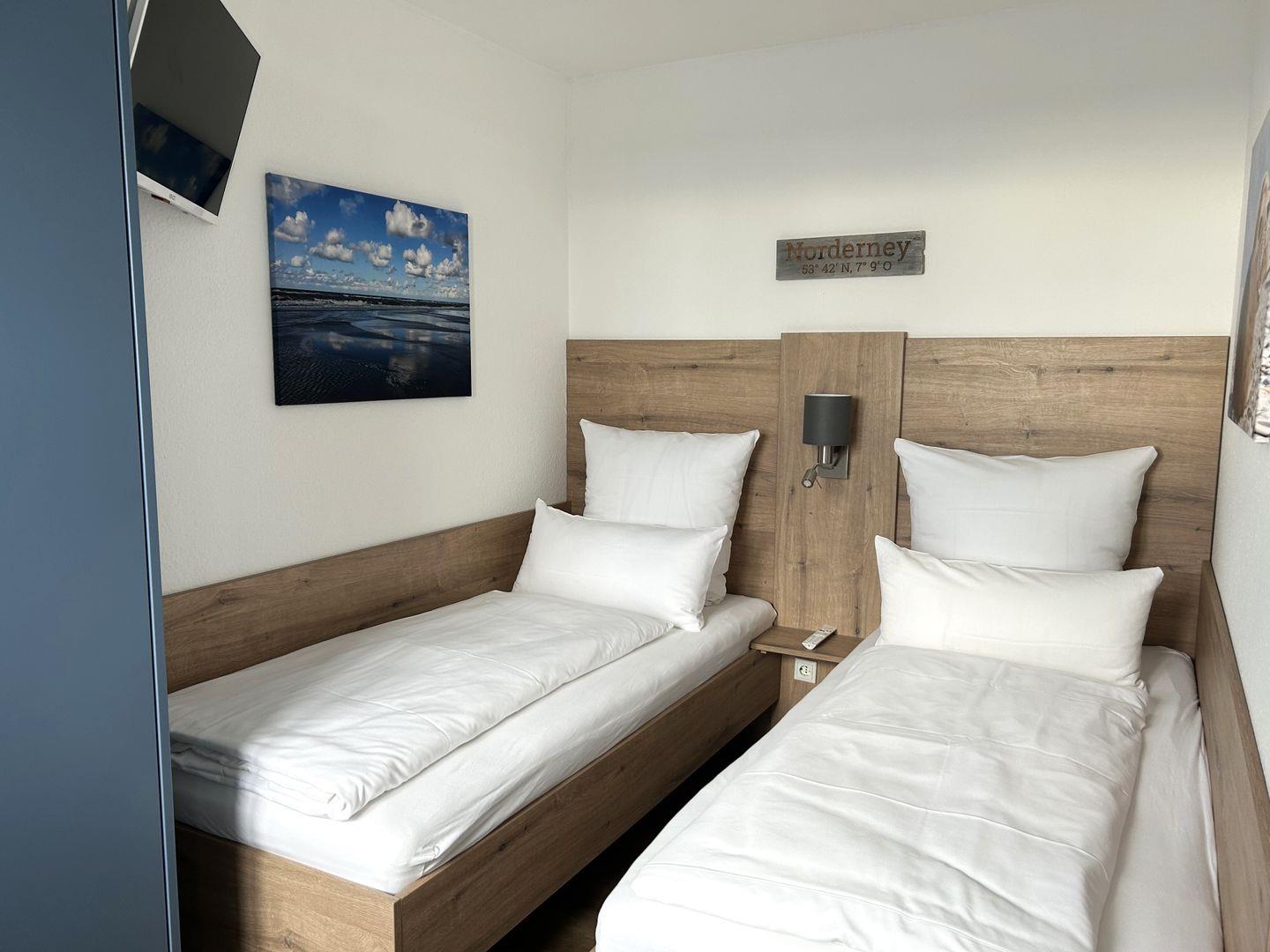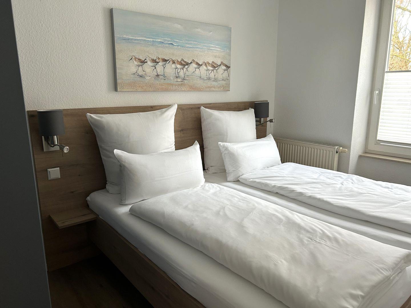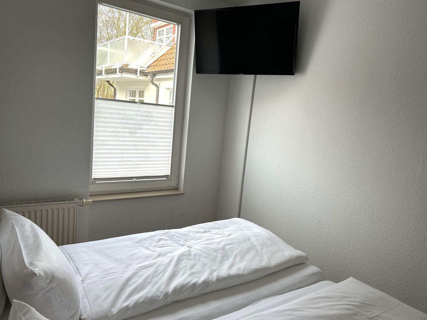 Das Appartement in der 1. Etage verfügt über ein separates Schlafzimmer mit Doppelbett, ein separates Schlafzimmer mit zwei Einzelbetten (TV),Wohn-Schlafraum (Schlafsofa) mit Küchenzeile, Balkon, Diele, Dusche/WC und Kabel-TV.