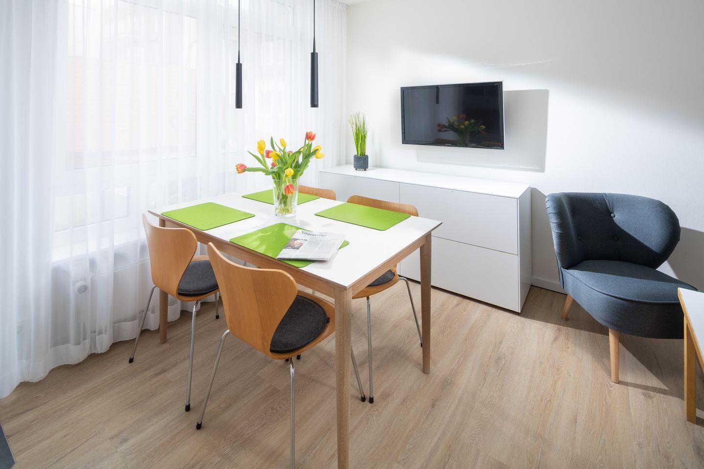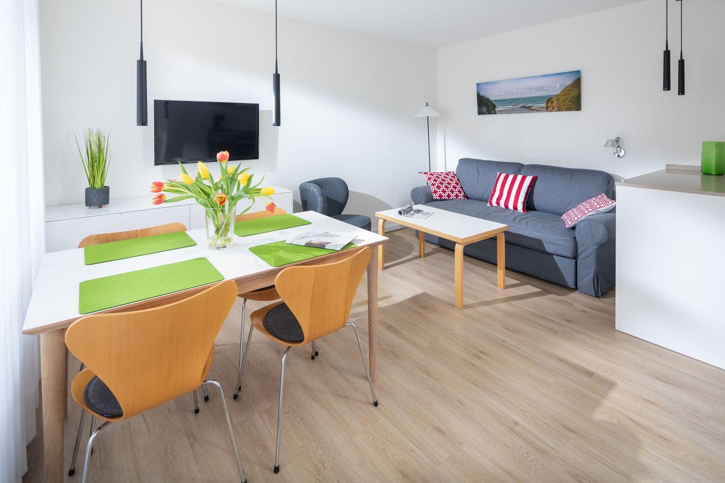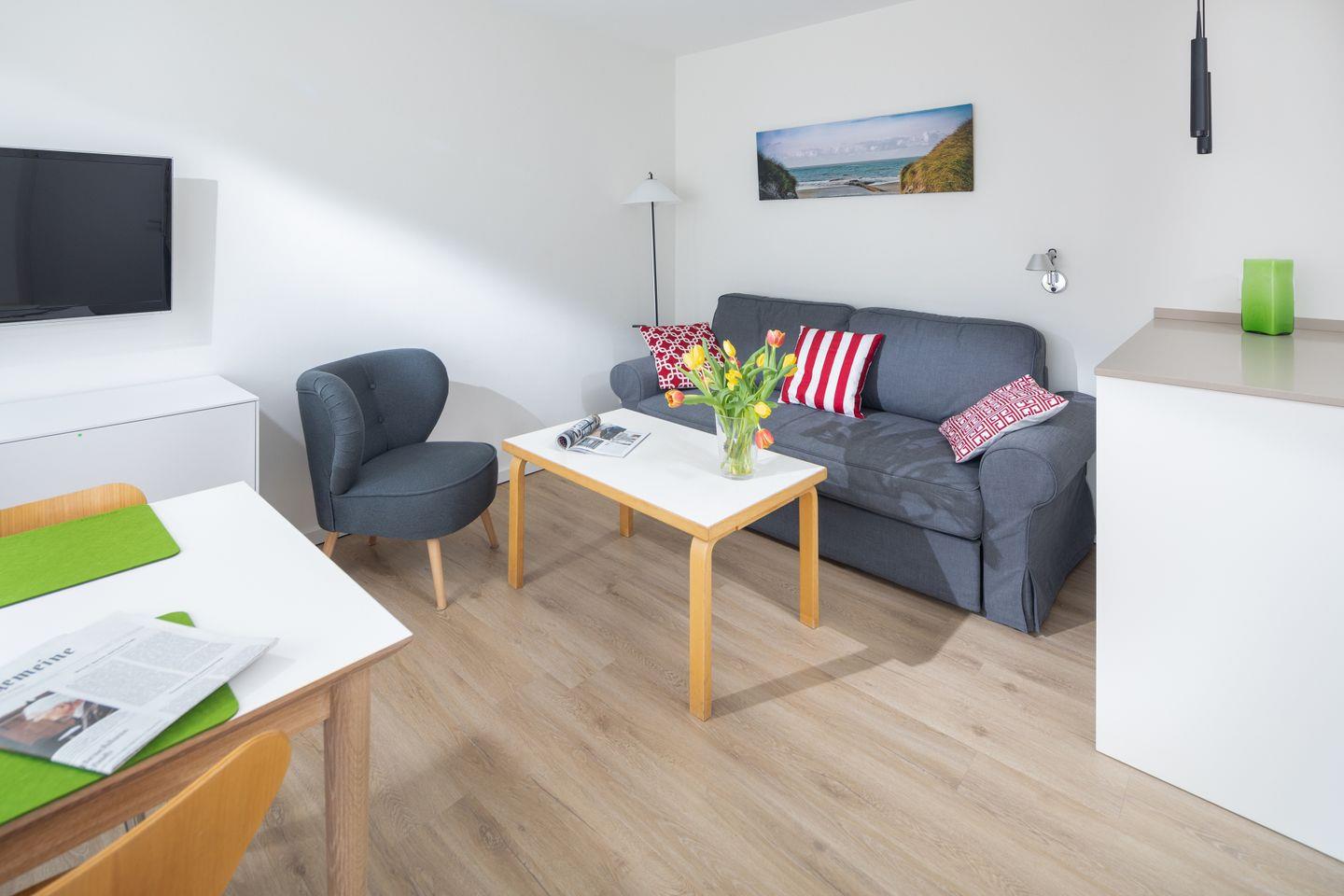 Das im Frühjahr 2019 renovierte und komplett neu möblierte Appartement in der 1. Etage verfügt über ein separates Schlafzimmer mit Doppelbett und TV, einen Wohn-Schlafraum (Schlafsofa, TV) mit Küchenzeile (Geschirrspülmaschine, Backofen, 4-Platten-Herd), einen Balkon, eine Diele und ein Duschbad mit WC.