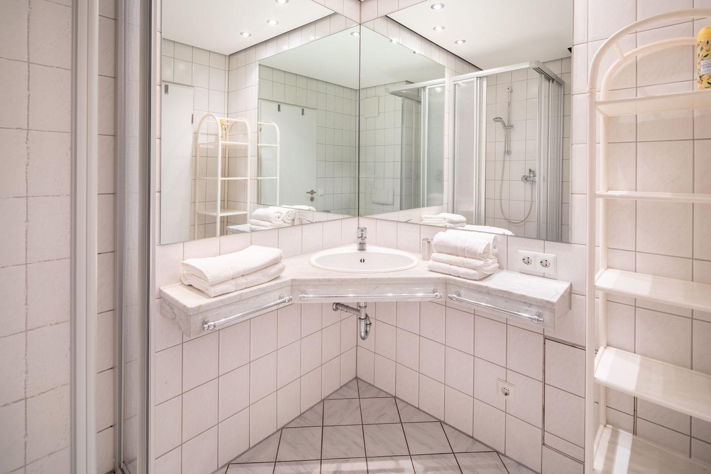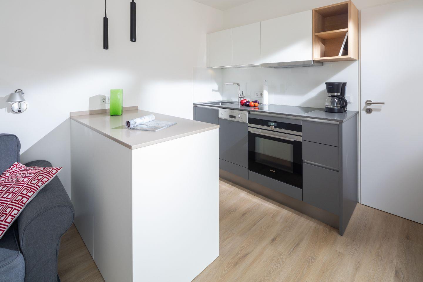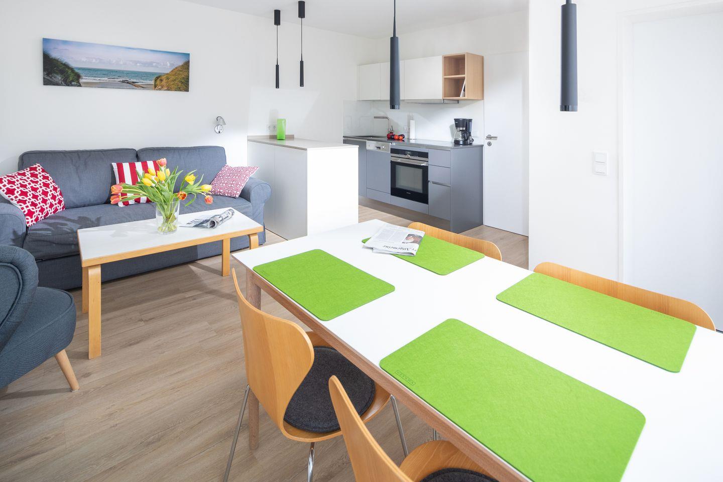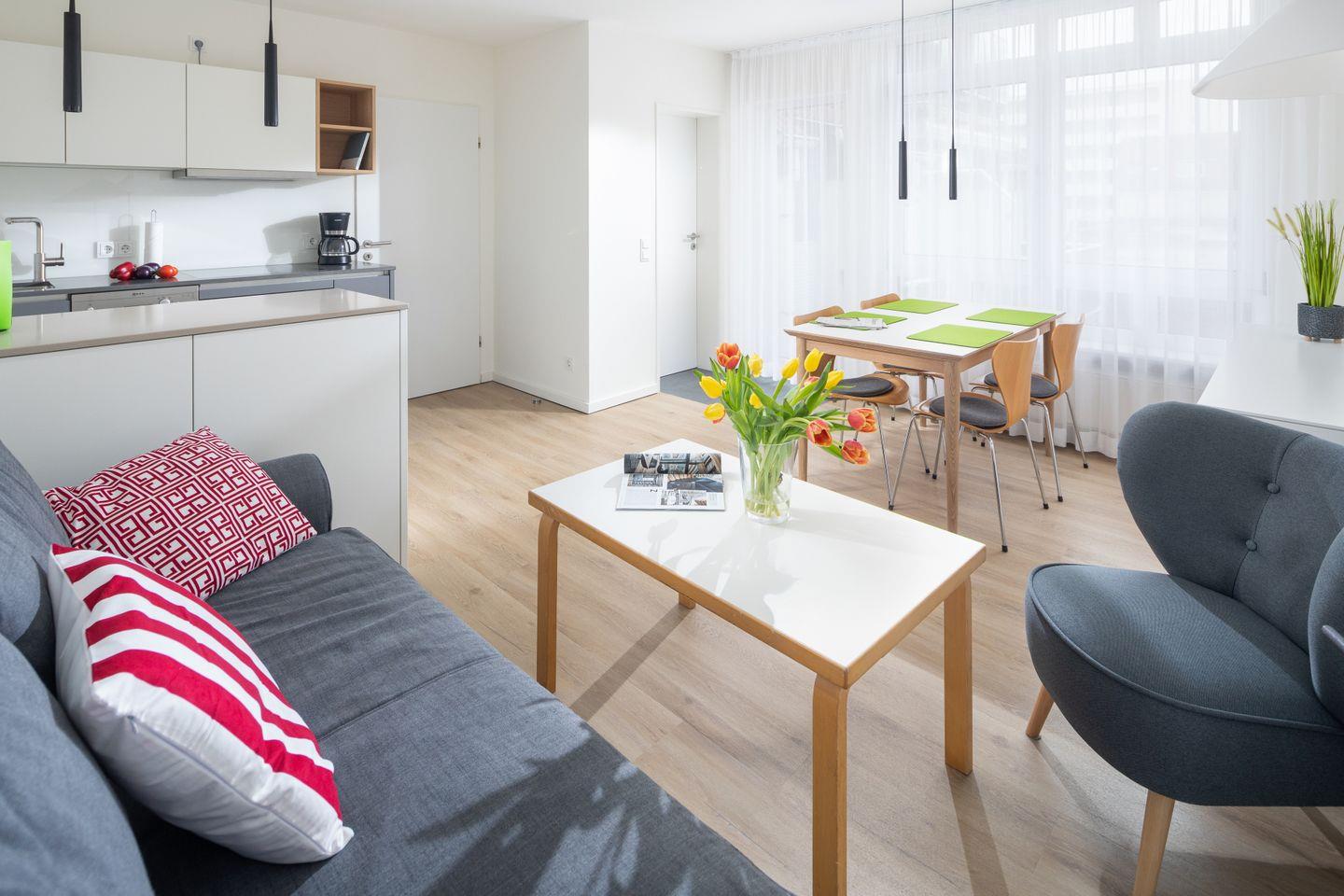 Das im Frühjahr 2019 renovierte und komplett neu möblierte Appartement in der 1. Etage verfügt über ein separates Schlafzimmer mit Doppelbett und TV, einen Wohn-Schlafraum (Schlafsofa, TV) mit Küchenzeile (Geschirrspülmaschine, Backofen, 4-Platten-Herd), einen Balkon, eine Diele und ein Duschbad mit WC.