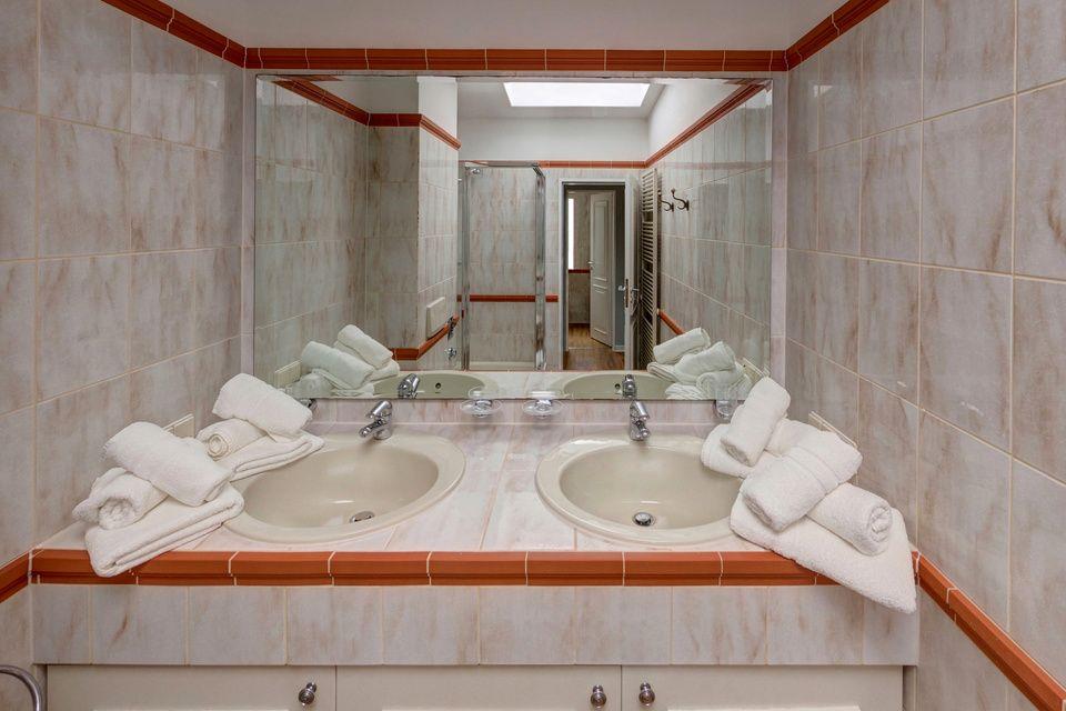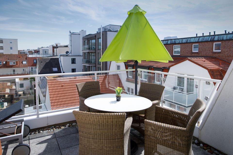 Das Appartement im Dachgeschoss verfügt über ein Schlafzimmer mit Doppelbett, ein weiteres separates Schlafzimmer mit Etagenbett und TV, einen Wohn-Schlafraum (Schlafsofa) mit Küchenzeile (Mikrowelle) und TV, eine Diele, ein Badezimmer mit Doppelwaschbecken, Dusche/WC, ein Gäste-WC und eine großzügige Sonnen-Dachterrasse.