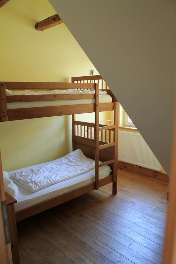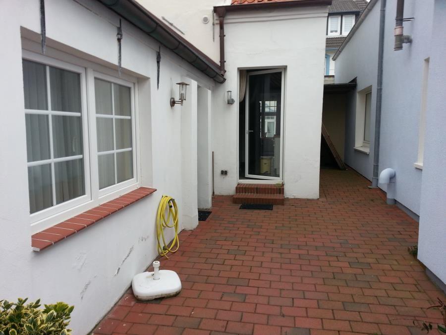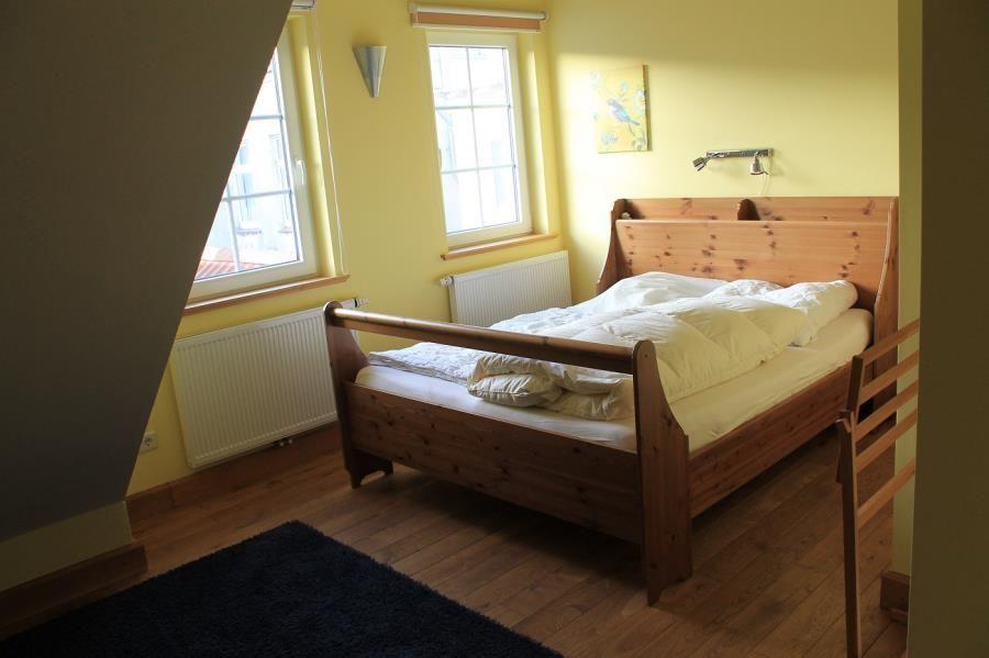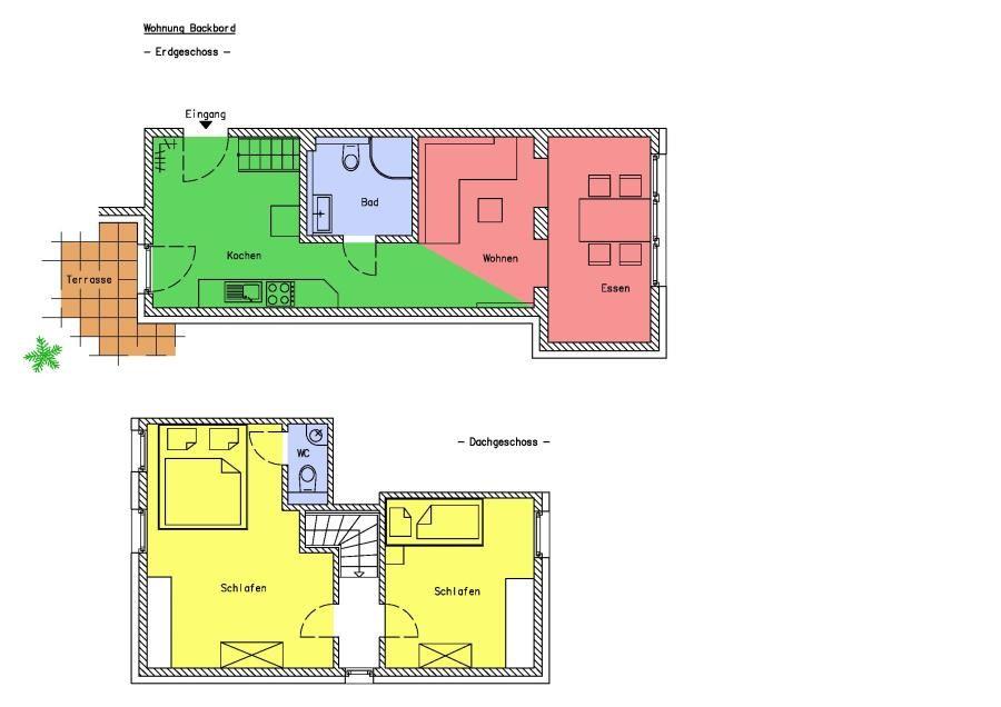 Das Appartement verfügt in der 1. Etage über ein separates Schlafzimmer mit Doppelbett und Gäste-WC sowie ein weiteres separates Schlafzimmer mit Etagenbett. Im Erdgeschoß befinden sich das Badezimmer mit Dusche/WC, der offene Wohnraum mit Küchenzeile, Essecke, Kabel-TV und Außensitzplatz im Hof.