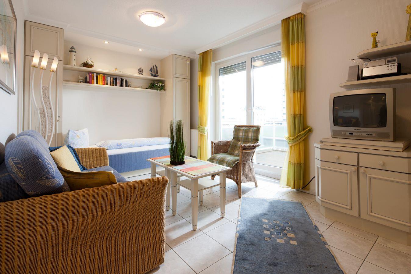 Das Appartement in der 1. Etage verfügt über einen Wohn/Schlafraum mit feststehendem Einzelbett, Küchenzeile, Essecke, Kabel-TV, (kein Telefon), Dusche/WC, Balkon mit seitlicher Seesicht (Nichtraucherwohnung, ohne Tiere).