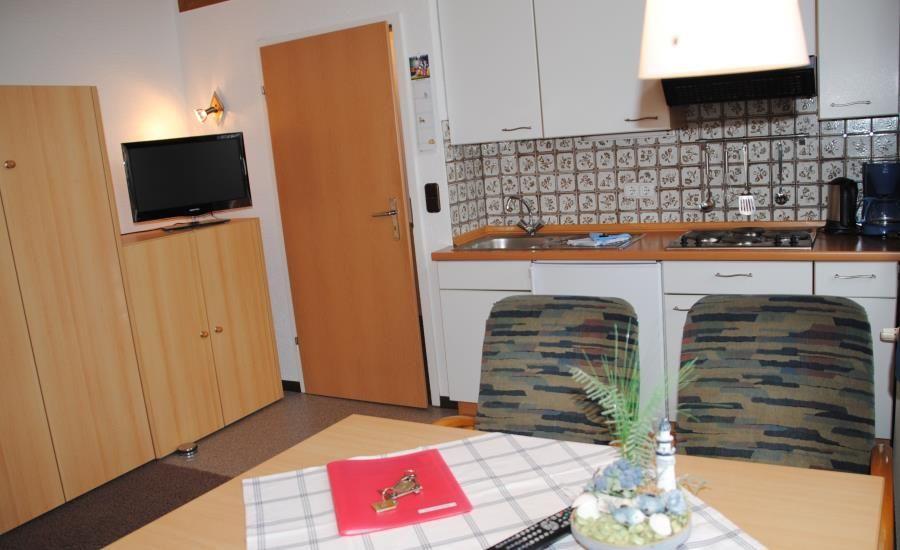 Das Appartement in der 1. Etage verfügt über ein separates Schlafzimmer mit Doppelbett, Wohn-Schlafraum (Doppelschrankbett) mit Küchenzeile. Zur Ausstattung gehören ebenfalls Dusche/WC, Kabel-TV (kein Telefon). NICHTRAUCHERWOHNUNG!!!