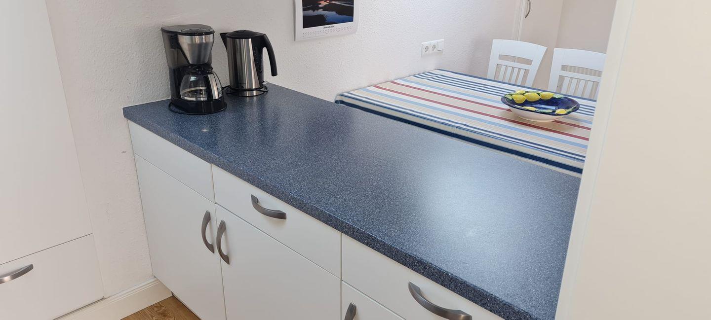 Doppelbett, ein separates Schlafzimmer mit zwei Einzelbetten (ein Gästebett kann auf Wunsch bereitgestellt werden), Küchenzeile (4-Platten-Herd, Backofen, Mikrowelle, Spülmaschine), Diele, Badezimmer mit Dusche/WC und zwei Waschbecken, Wohnraum mit Kabel-TV und Essecke. NICHTRAUCHERWOHNUNG !