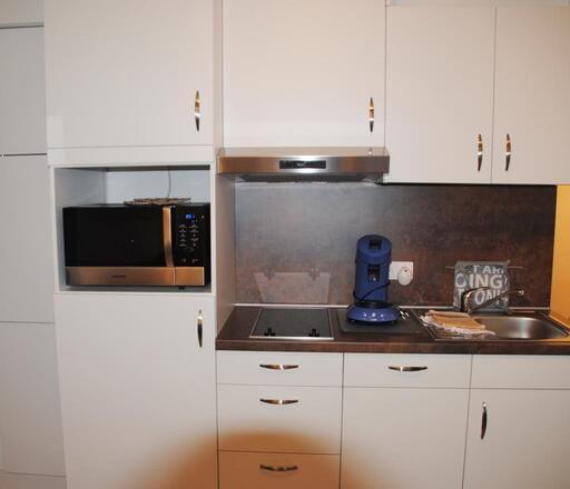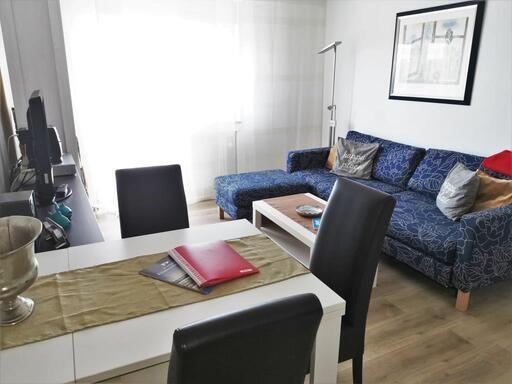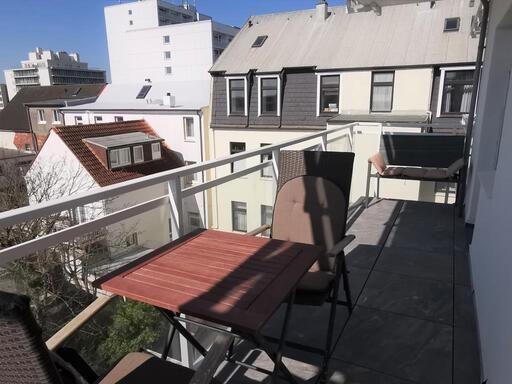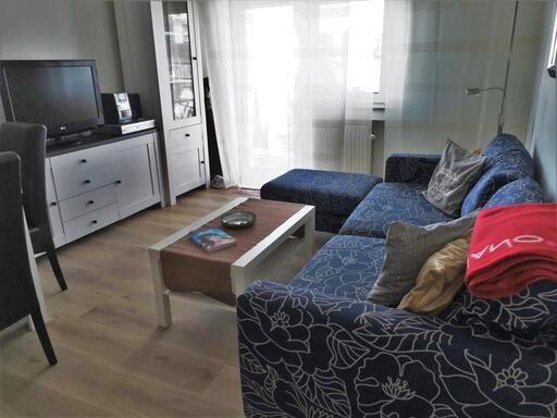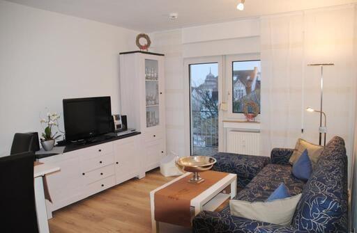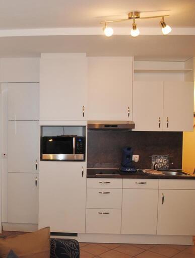 Das Appartement in der 3. Etage verfügt über ein separates Schlafzimmer mit Doppelbett (Boxspringbett, TV), Wohn-Schlafraum (Schlafsofa) mit Küchenzeile (2-Platten-Herd, Spülmaschine, Nespresso-Maschine, Mikrowelle) und TV, Diele, Dusche/WC. Vom Wohn- und Schlafraum haben Sie Zugang zum möblierten West-Balkon.