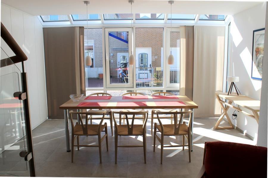 Das Ferienhaus über 2 Etagen verfügt im Erdgeschoss über einen Wohnraum (Kabel-TV und Hifi-Anlage), Schlafzimmer mit Doppelbett (TV), eine offene Küche (Backofen, Spülmaschine, Mikrowelle, 4-PLatten-Induktionsherd) und Essbereich, Bad mit Dusche, Gäste-WC, TV und Terrasse. In der 1. Etage/Dachgeschoss befindet sich ein offener Wohnbereich, zwei Schlafräume (einmal mit Doppelbett in Überlänge (2,10m) & einmal Doppelbett/TV sowie ein Badezimmer mit Dusche/WC. Keine Partys erlaubt!