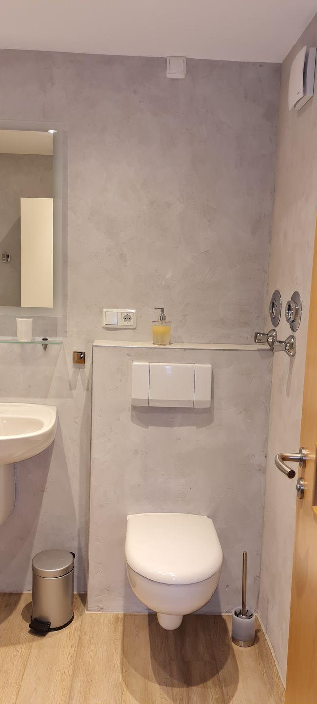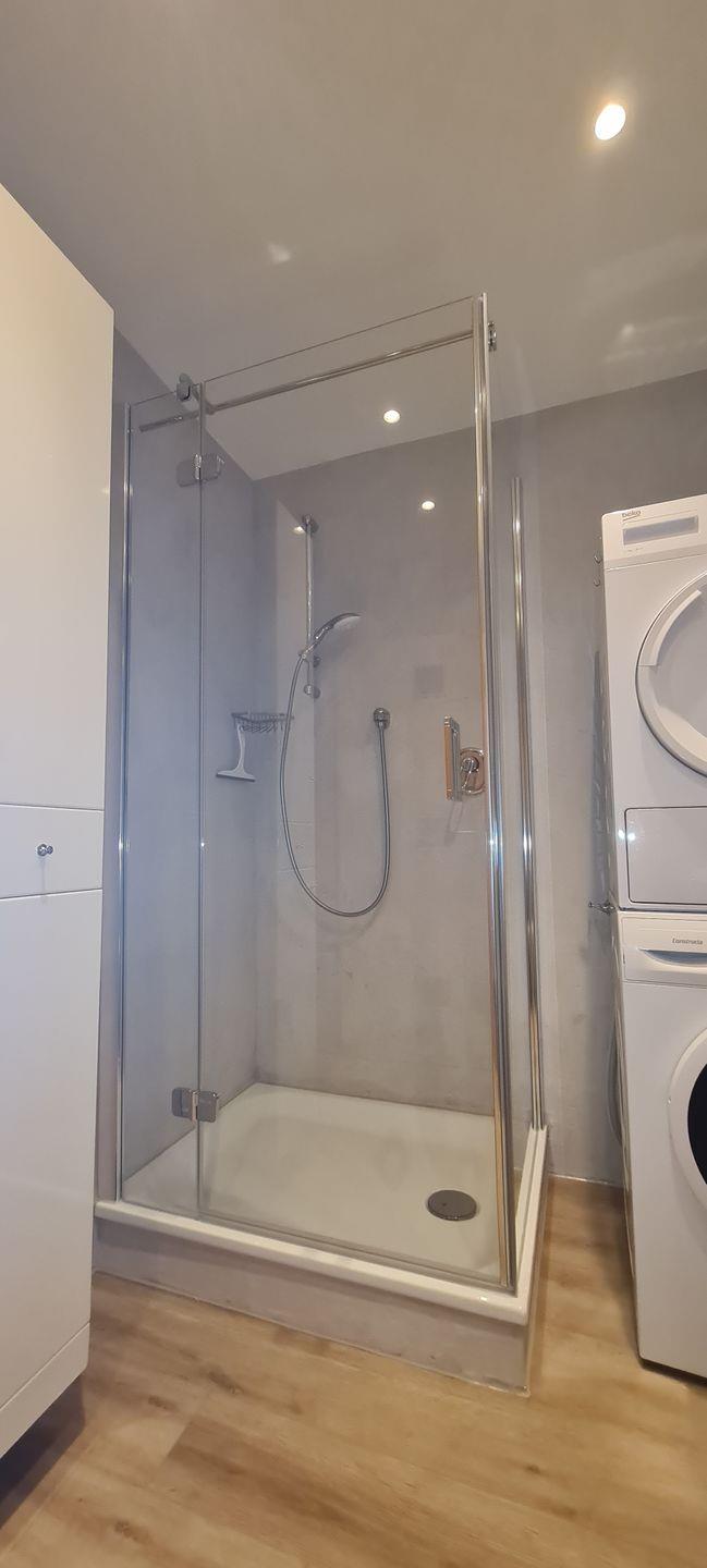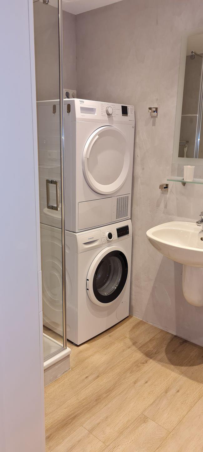 Das Badezimmer verfügt über eine geräumige Dusche sowie eine Waschmaschine und einen Trockner. Die Ferienwohnung mit drei Zimmern befindet sich in einer zentralen, aber ruhigen Seitenstraße.