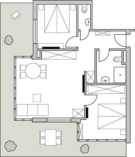 Das exklusive 3-Raum Appartement in der 1. Etage ist zentral gelegen und verfügt über einen Wohnbereich mit Eichenparkett, einen Küchenbereich (Geschirrspülmaschine, Induktionsherd, Backofen), zwei Schlafräume mit Doppelbetten (je Flachbild TV) sowie einen Balkon der die Wohnung umsäumt (mit