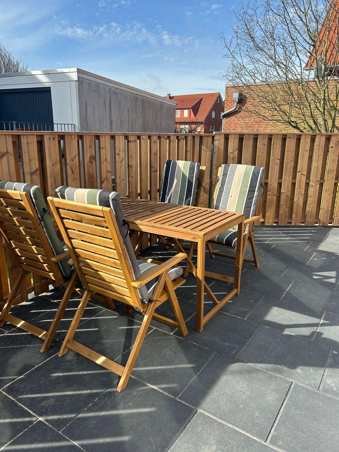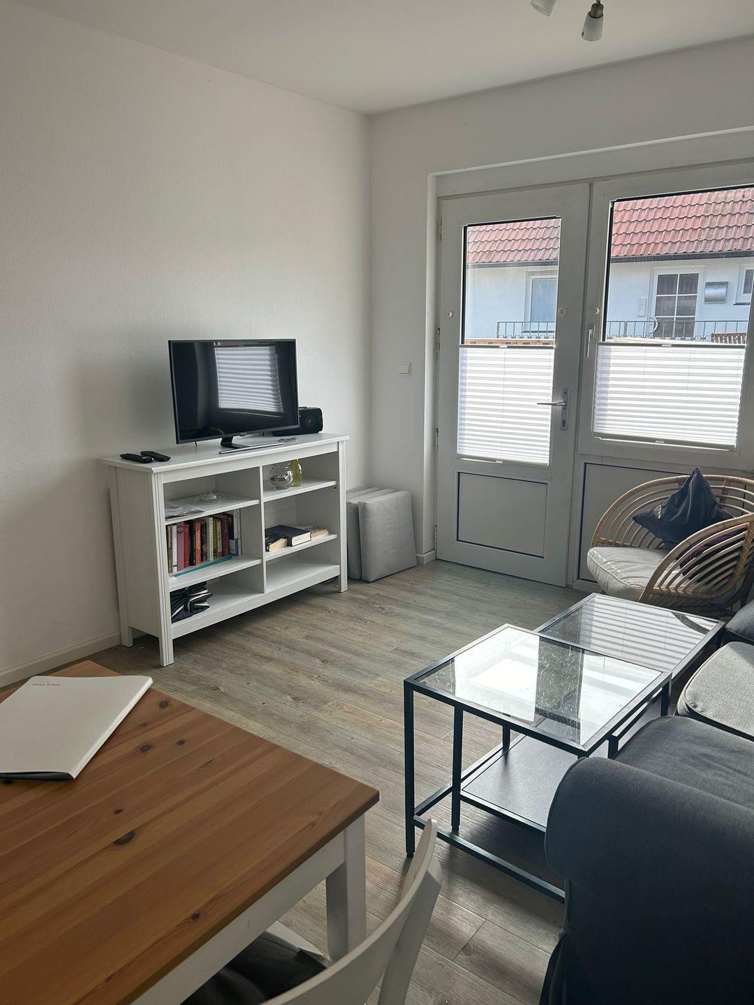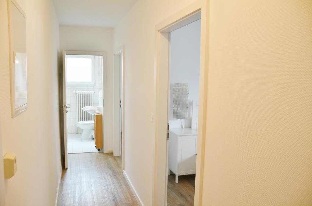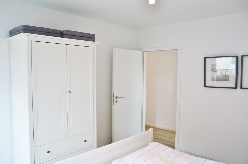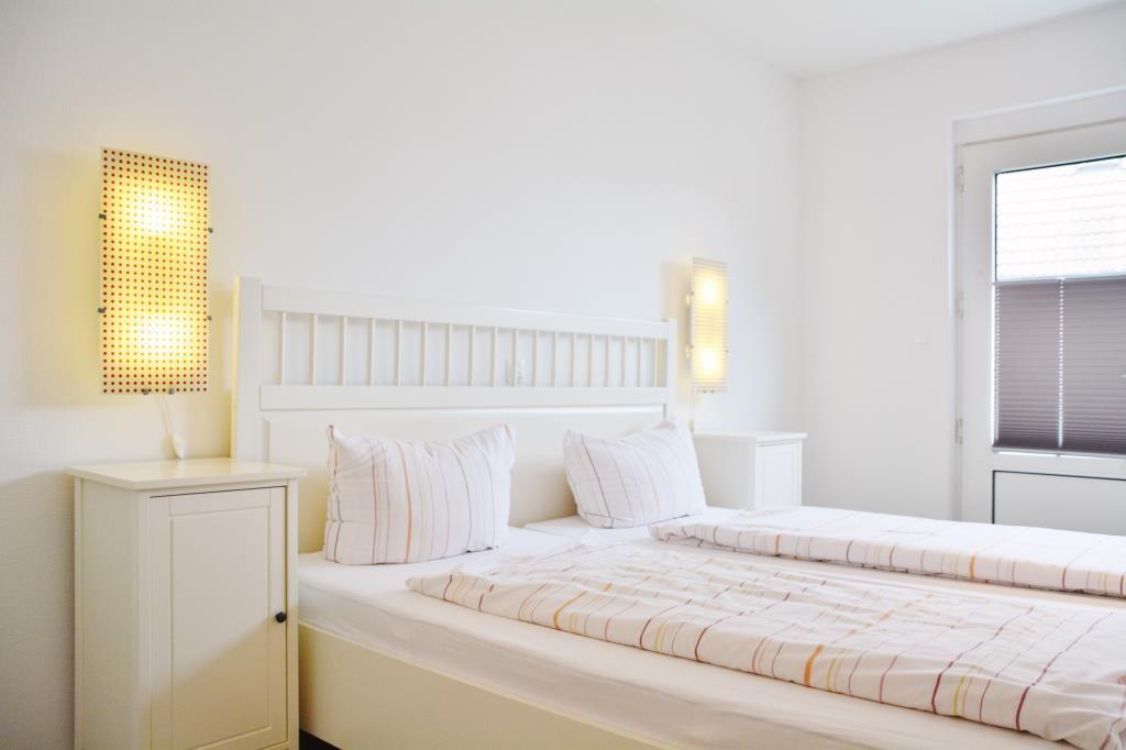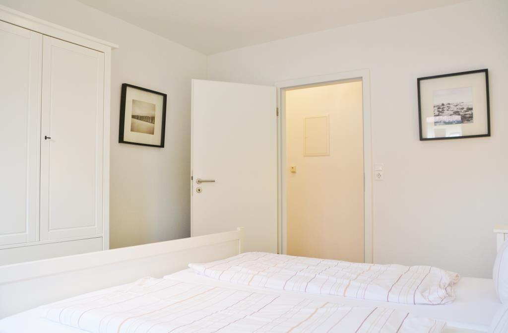 Das helle, freundliche 3-Raum-Appartement im Erdgeschoss verfügt über zwei separate Schlafzimmer mit je einem Doppelbett, Wohnraum mit Essecke, separate Küchenzeile, Kabel-TV, Diele und Badezimmer mit Dusche/WC. Wohn- und Schlafzimmer haben Zugang auf die Terrasse. Ein wohnungseigener Parkplatz ist vorhanden. Gemeinschaftliche Gartennutzung.