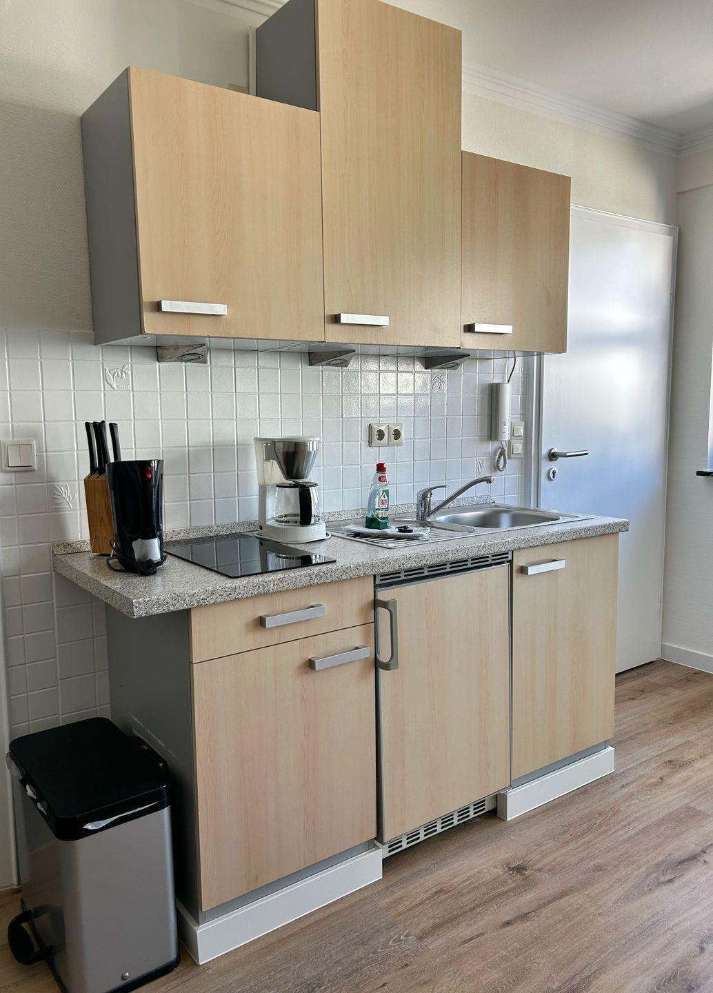 Das renovierte 2-Raum-Appartement in der 1. Etage für max. 3 Personen verfügt über ein Schlafzimmer mit Doppellbett, ein Wohn-/Schlafraum (Schlafsofa) mit TV, Esstisch mit 4 Stühlen und eine im Wohnbereich integrierte Küchenzeile mit 2-Plattenherd, Kühlschrank und 2* Gefrierfach. Dusche/WC und einen Balkon