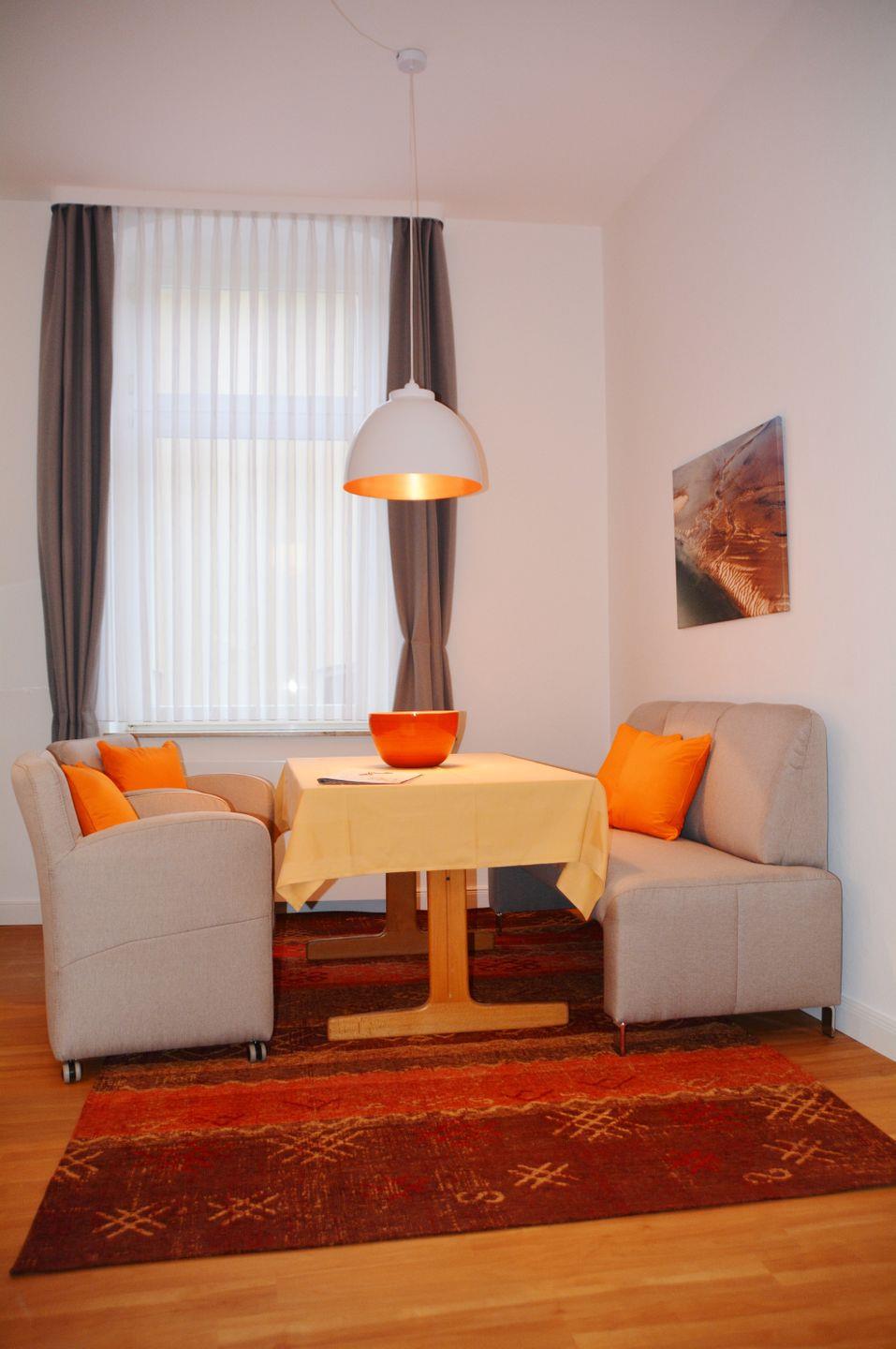 Das 3-Raum-Appartement verfügt über einen Wohn- und Essraum mit Küchenzeile (4-Plattenherd) sowie zwei Schlafzimmer (Doppelbetten), Dusche/WC und Flur. Vom Flur aus hat man Zutritt in das Badezimmer und den Wohn-/Essbereich. Von letzterem gehen die beiden Schlafzimmer ab.