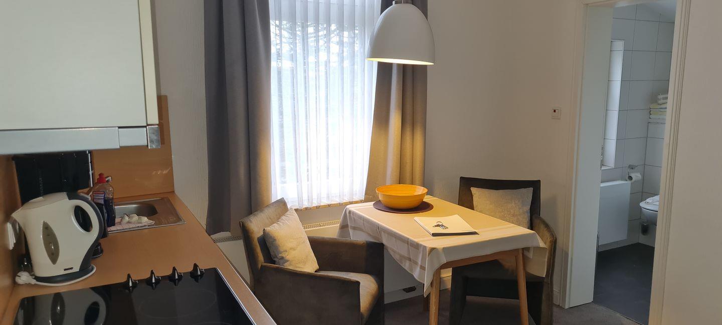 Küchenzeile und Essecke (TV, Spülmaschine, 4-Platten-Ceranfeld). Sowie ein Schlafzimmer mit Doppelbett und Dusche/WC sind vorhanden. Ein Parkplatz kann bei Verfügbarkeit für 2,50 € pro Tag hinzugemietet werden. WLAN.