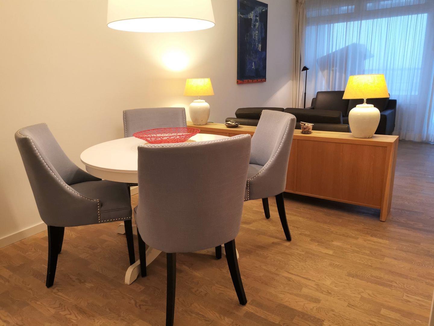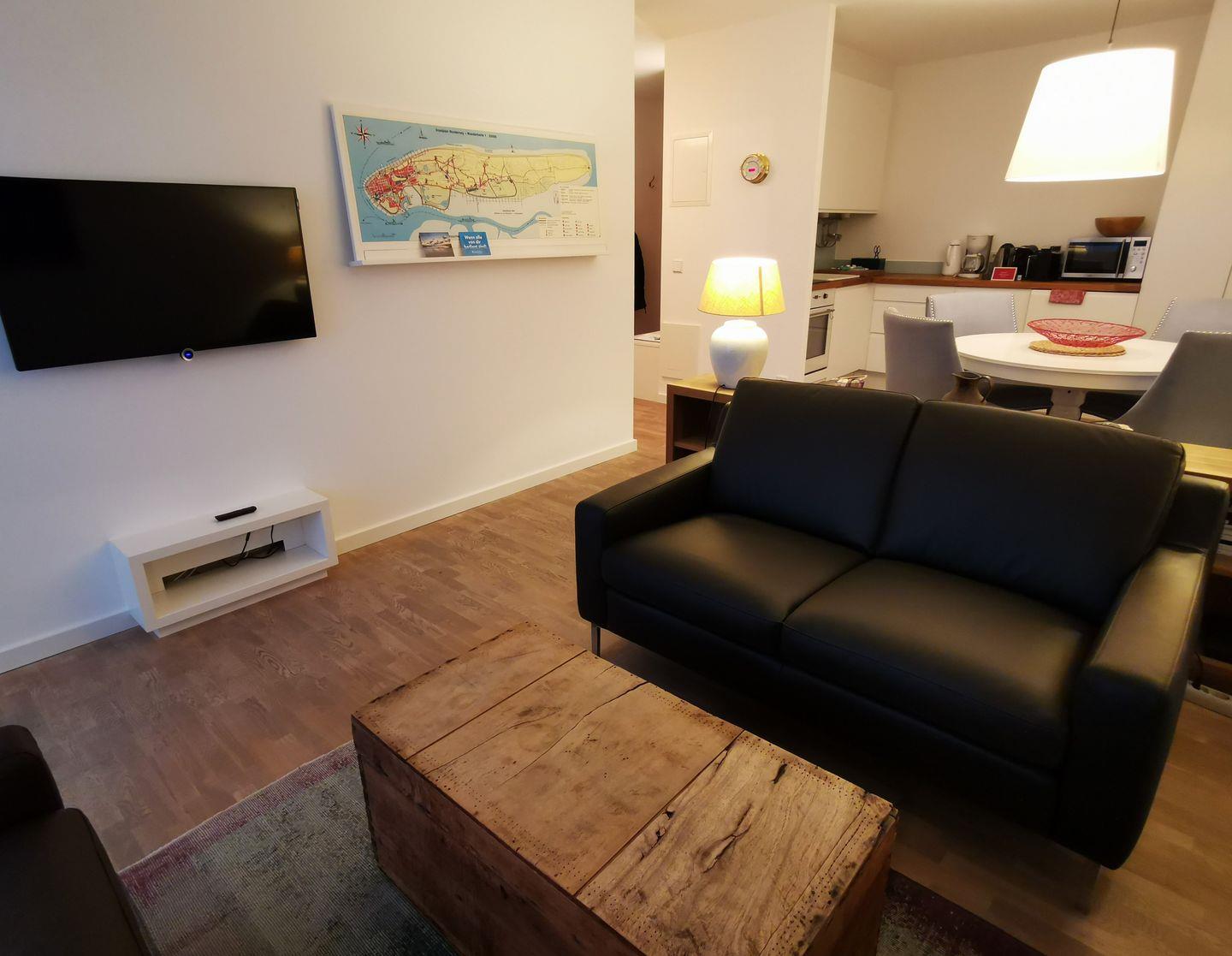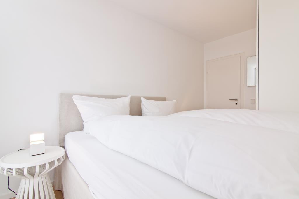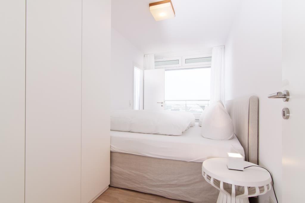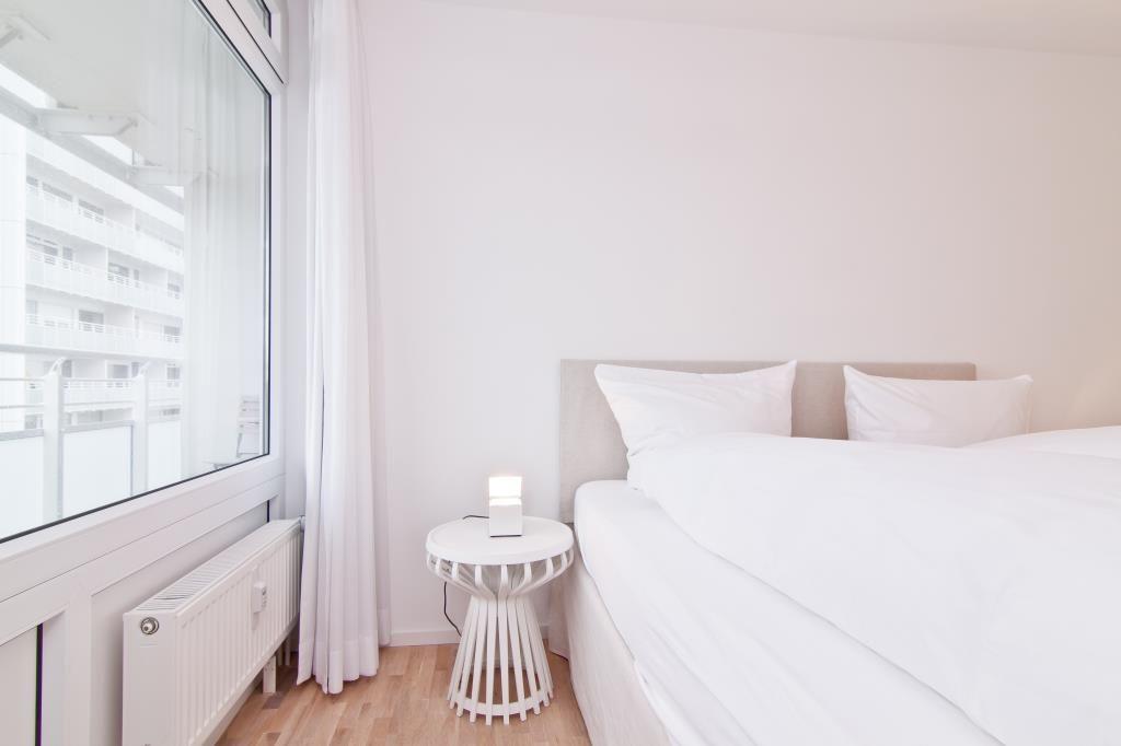 Das Appartement Nr. 126 in der 5. Etage verfügt über ein separates Schlafzimmer mit Doppelbett (Boxspringbett), eines mit zwei Einzelbetten, Wohnraum mit Küchenzeile (4-Plattenherd, Spülmaschine, Backofen), Essecke, Diele, Dusche/WC und Kabel-TV. Der Balkon hat seitliche Seesicht und einen Blick über die Stadt. NICHTRAUCHERWOHNUNG !!! WLAN. Ein wohnungseigener Parkplatz (Nr. 33) ist am Haus (Kaiserstraße 18).