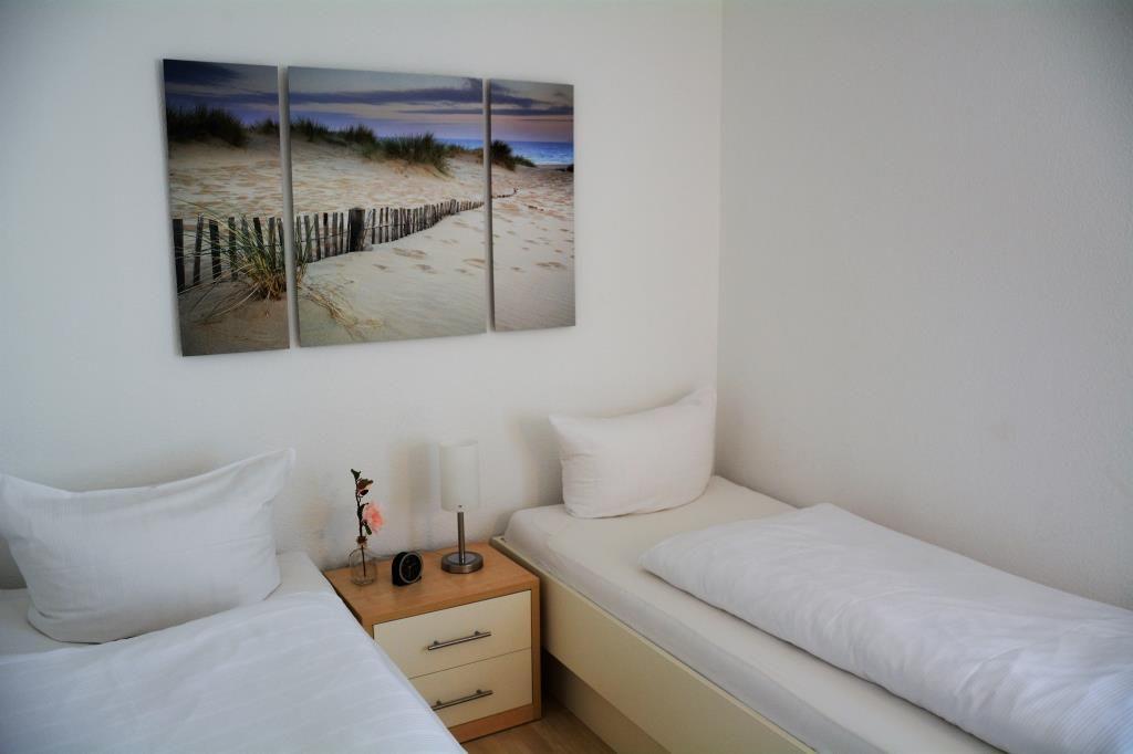 Die renovierte 2-Raum-Ferienwohnung befindet sich im 1. Obergeschoss und besteht aus einem Schlafzimmer mit zwei Einzelbetten, einem Wohnraum (TV) mit Zugang zum Balkon, einer kleinen Küchenzeile (ausgestattet mit 2-Platten-Herd, Mikrowelle und kleinem Gefrierfach), Diele und Duschbad mit separatem WC (erneuert 2017). Es handelt sich um eine Nichtraucher-Wohnung.