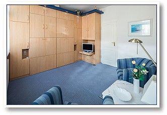 Die 1-Raum-Ferienwohnung im Obergeschoss verfügt über einen Wohn-/Schlafraum mit elektronisch ausfahrbaren Schrankbetten, separater Küche mit Essplatz. Mikrowelle sowie Duschbad mit WC. NICHTRAUCHERWOHNUNG! WLAN vorhanden.