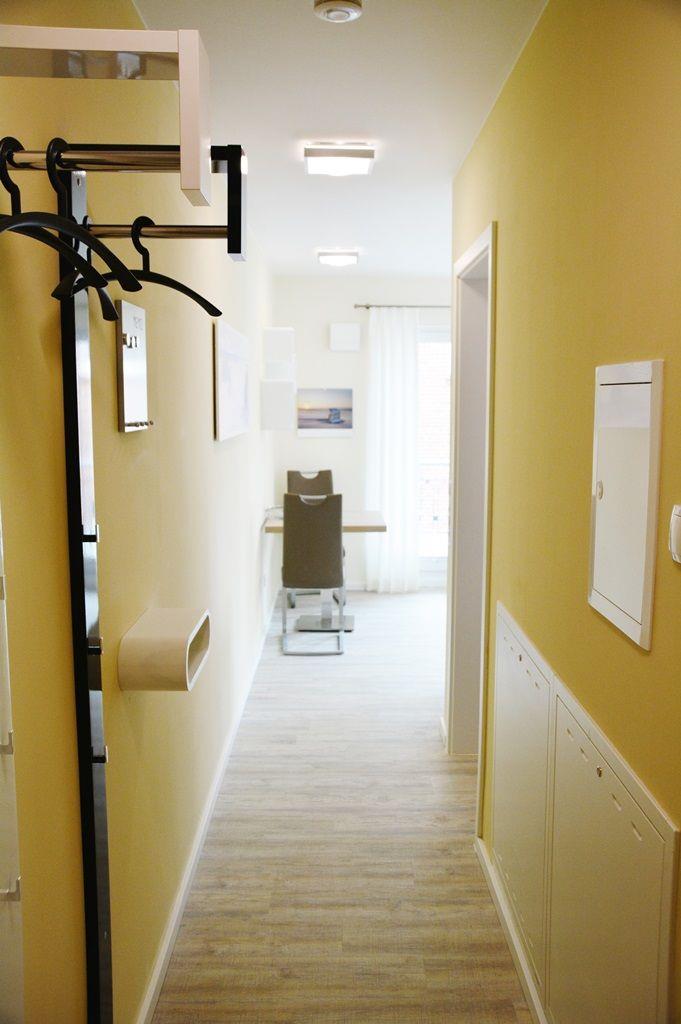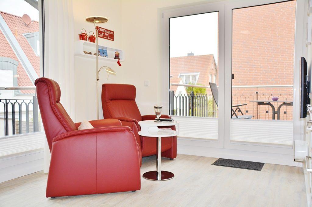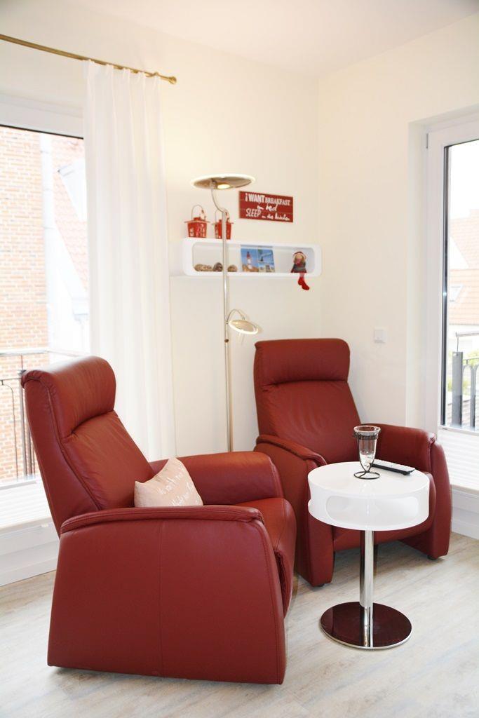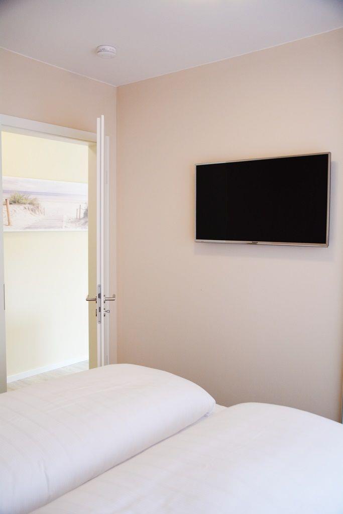 Das Neubau-Appartement besteht aus einem separaten Schlafzimmer mit TV (das Doppelbett ist 1,60m breit), einem Wohnraum (zwei Sessel, TV) mit integrierter