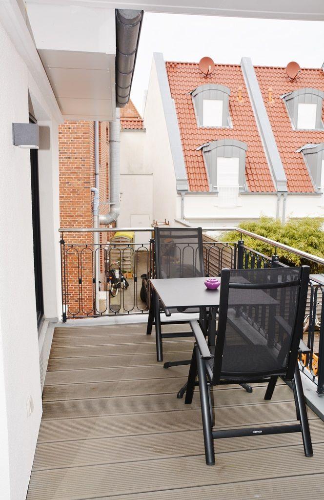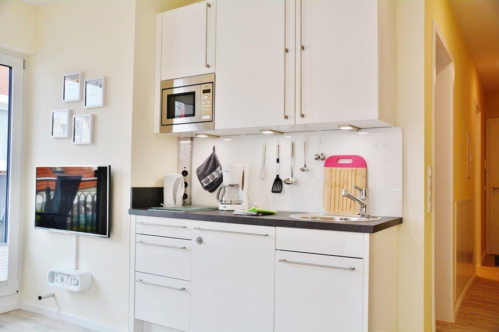 Küchenzeile (Mikrowelle, 2-Platten-Ceranfeld) sowie einem Duschbad mit WC. Die Wohnung bietet zwei Balkone: einen, den man von Wohnzimmer und Schlafzimmer aus betritt und einen weiteren kleinen, der auch vom Wohnbereich aus zu erreichen ist. Sie befindet sich im 1. Obergeschoss, ein Aufzug ist vorhanden. Es handelt sich um eine Nichtraucherwohnung.