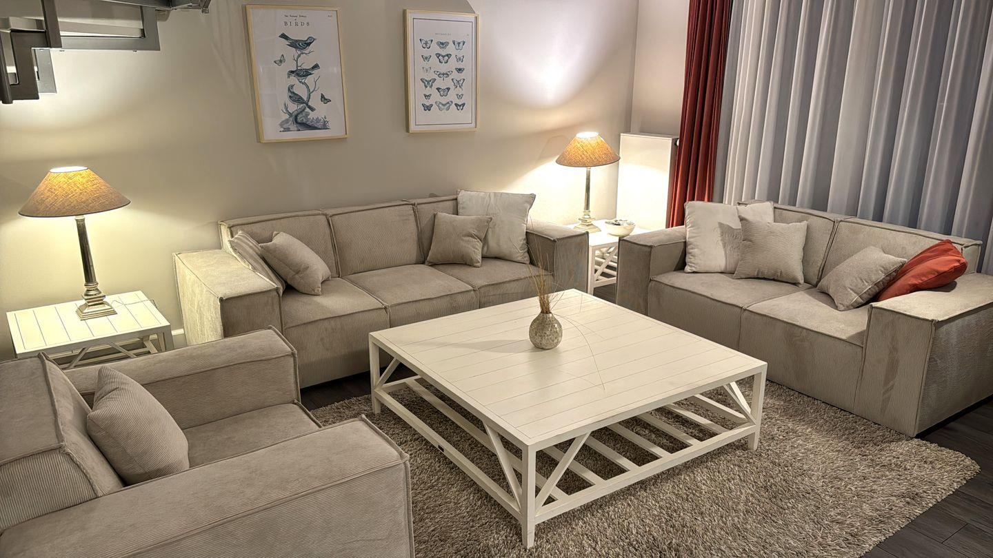 Das Kapitänshaus verfügt im EG über einen Flur, ein Wohnzimmer (TV) mit integrierter Küche (Backofen, Mikrowelle, Geschirrspüler) und Zugang zur Terrasse sowie ein Gäste-WC. Im OG gibt es drei Schlafzimmer: eines mit Etagenbett und zwei mit jeweils einem Doppelbett. Zusätzlich ist dort ein Duschbad mit WC. Im Haus gibt es eine Waschmaschine und WLAN.