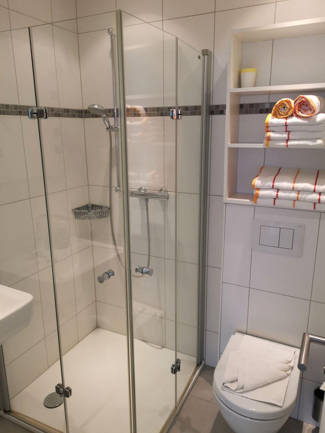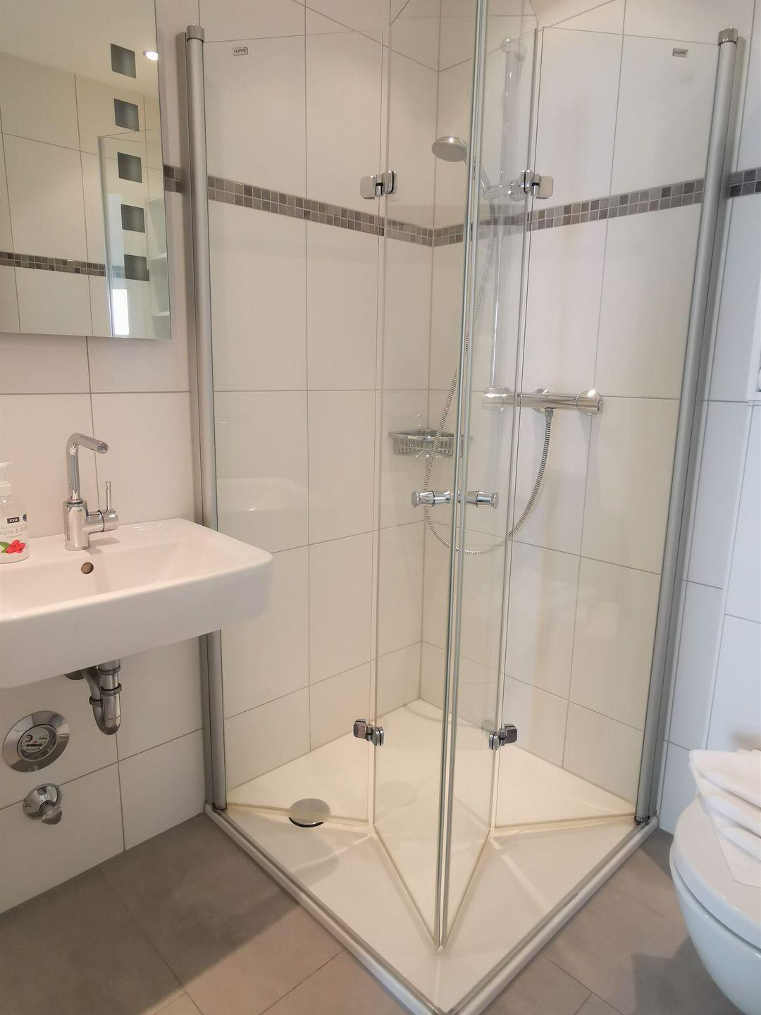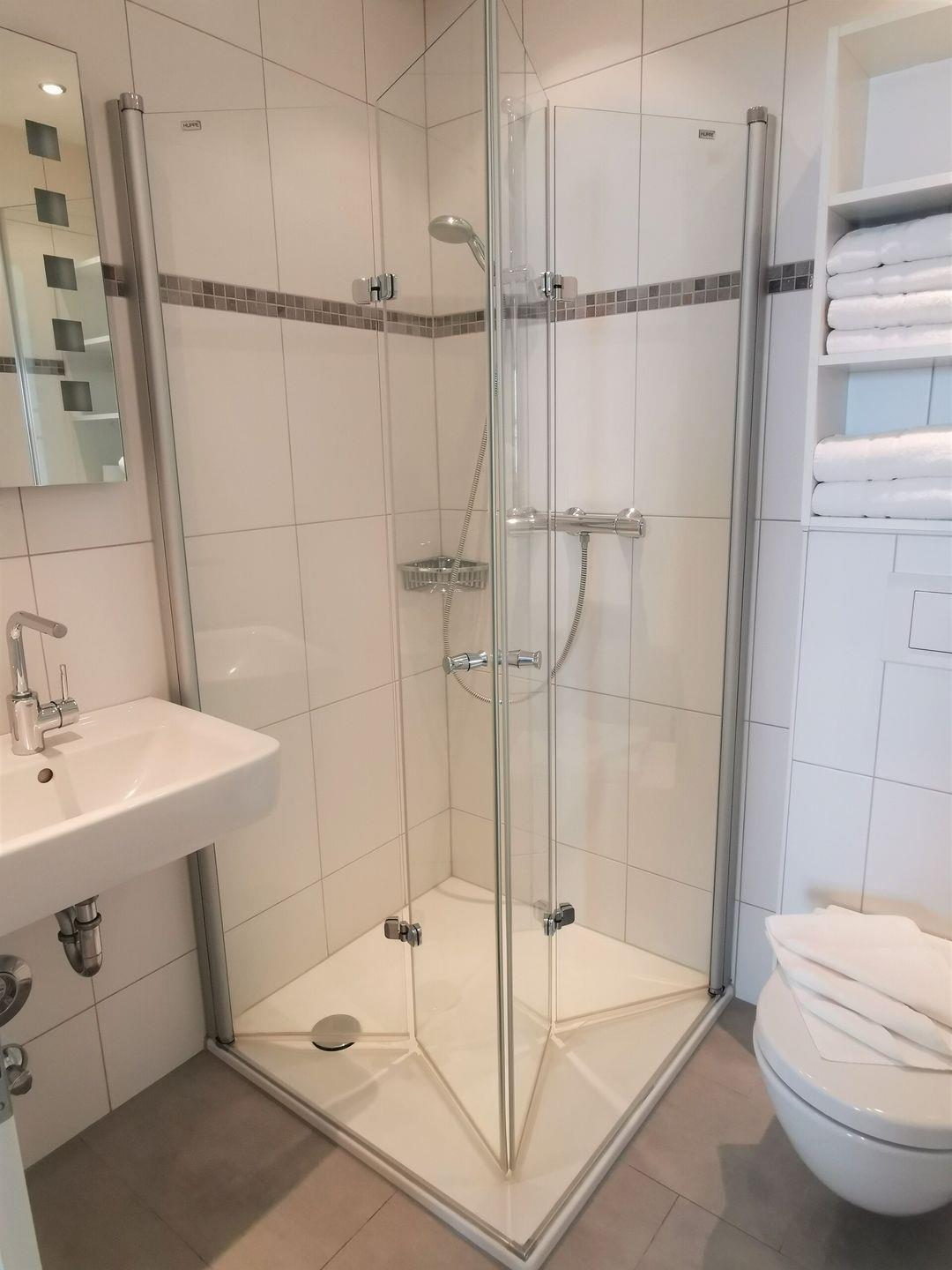 Das moderne Badezimmer ist mit einer Dusche, WC und Waschbecken ausgestattet.