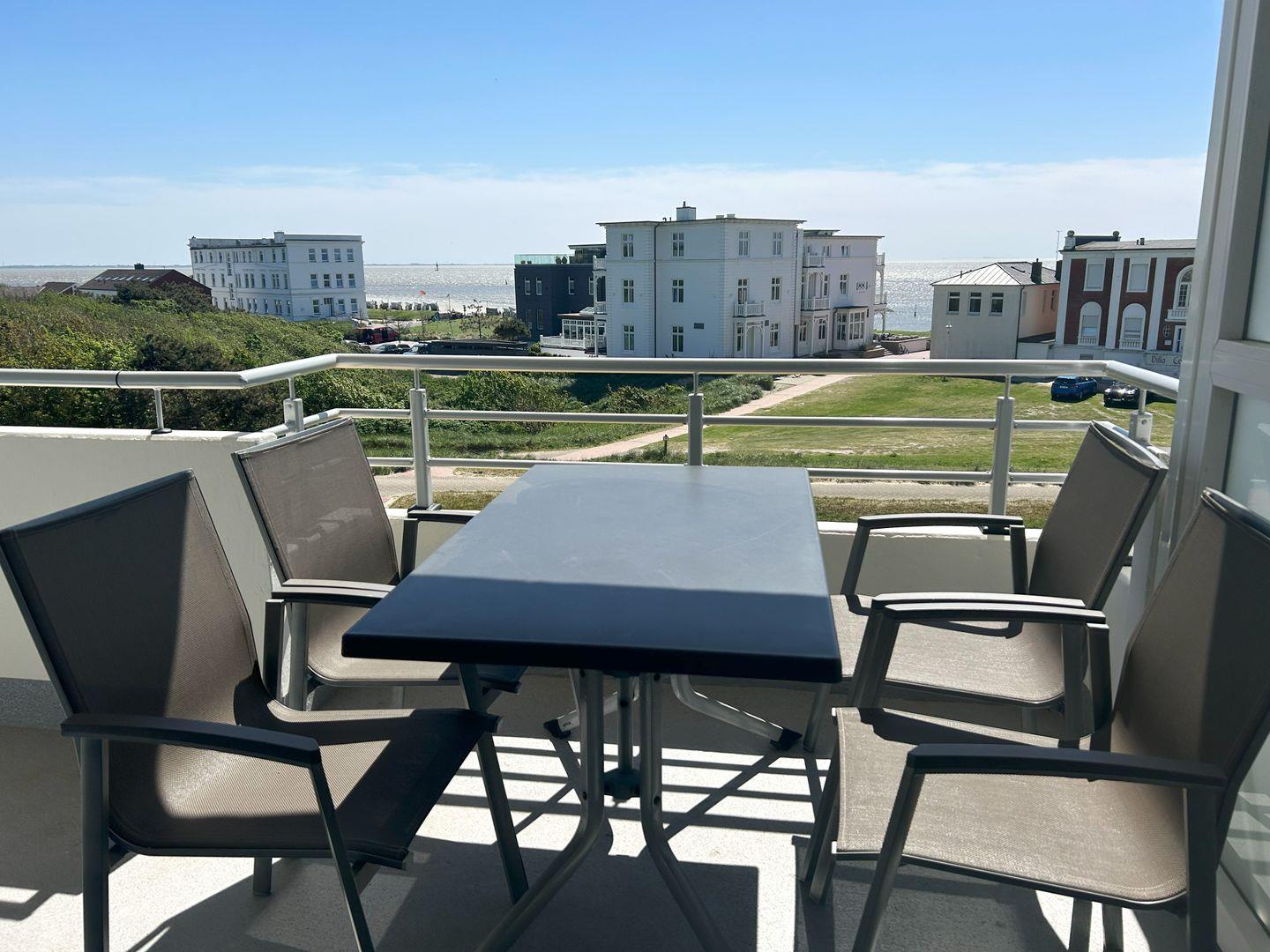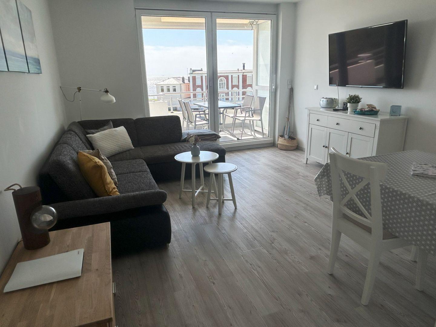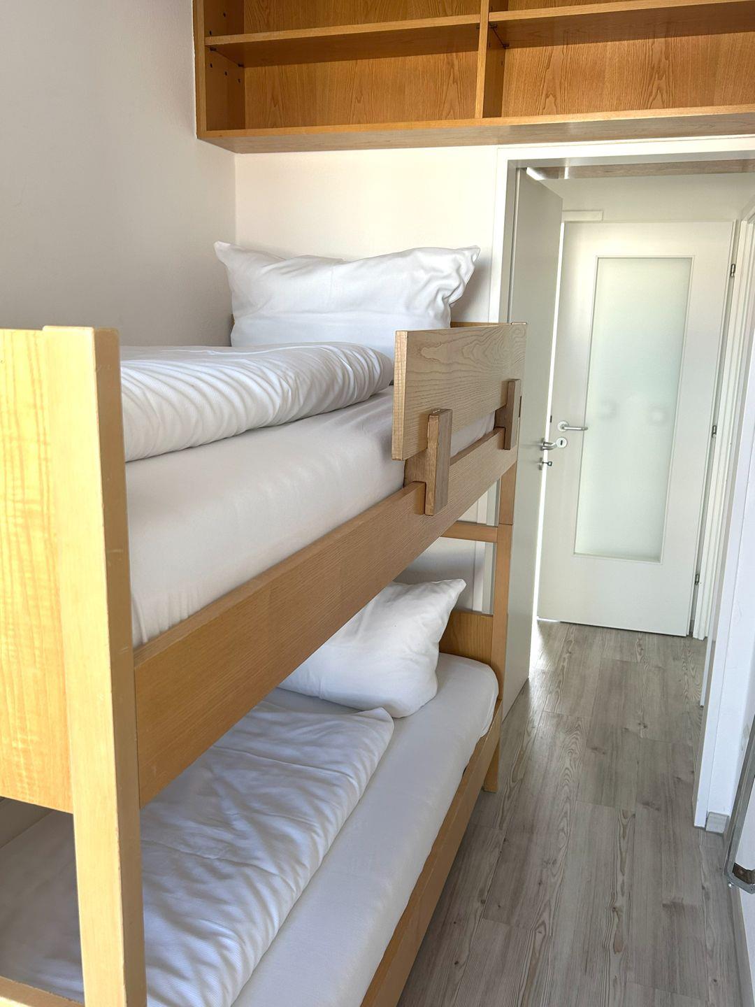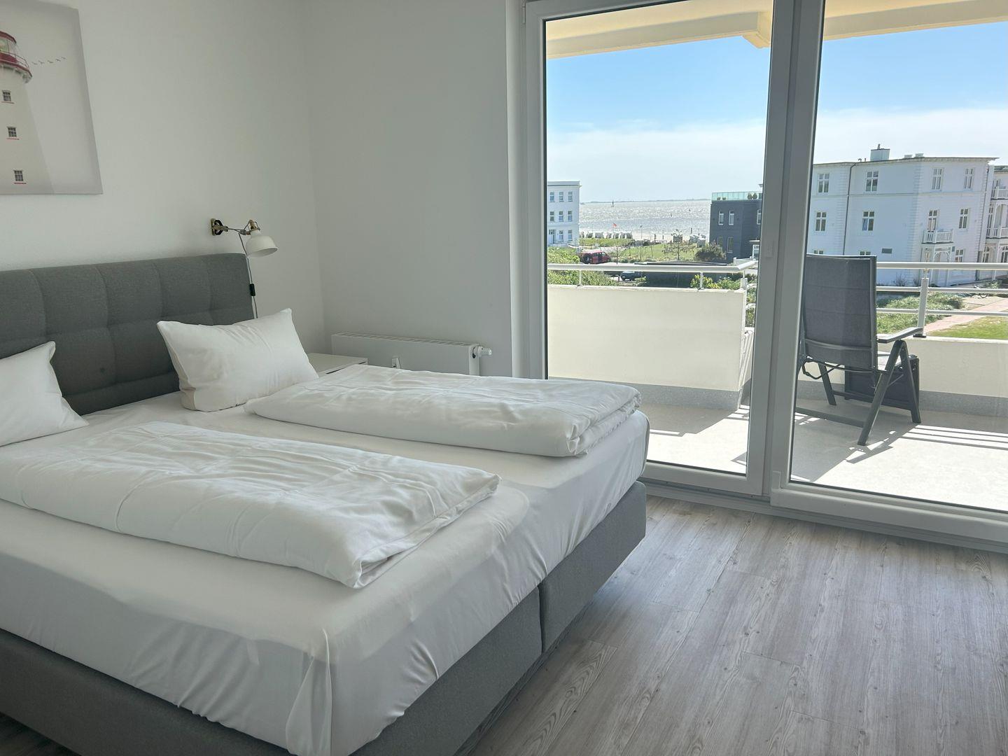Die frisch renovierte Wohnung besteht aus einem Wohnzimmer mit offener Küche (Geschirrspüler, Backofen, Gefrierfach, Ceranfeld) und Zugang zum großen Balkon mit direktem Meerblick, einem Schlafzimmer mit Boxspringbett (Duschbad mit WC en suite), welches ebenfalls Zugang zum Meerblick-Balkon bietet, einem Schlafzimmer mit Etagenbett (90x190cm) und einem Schlafzimmer mit Stapelbett (90x190cm). Zusätzliches Duschbad mit WC vorhanden. Waschmaschine-/Trockner gegen Gebühr im gemeinschaftlichen Hauswirtschaftsraum. Nichtraucherwohnung.