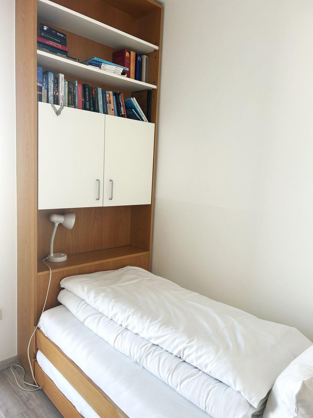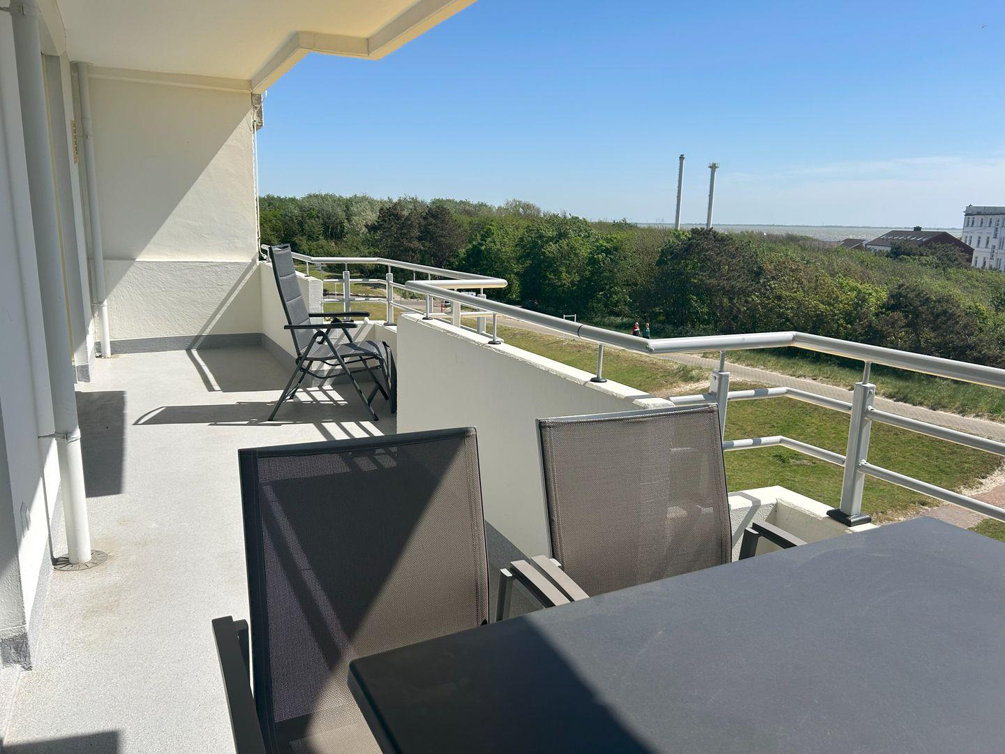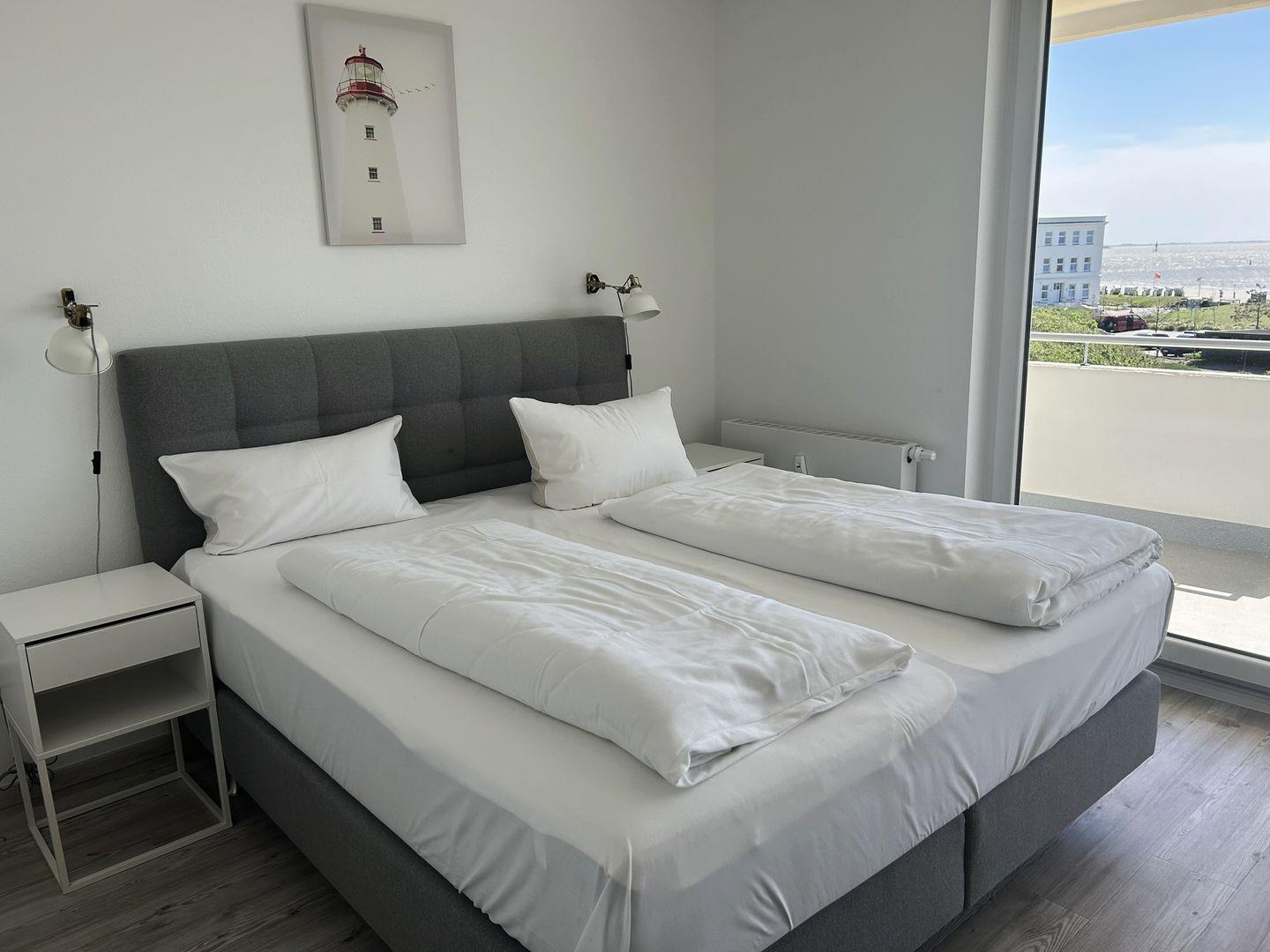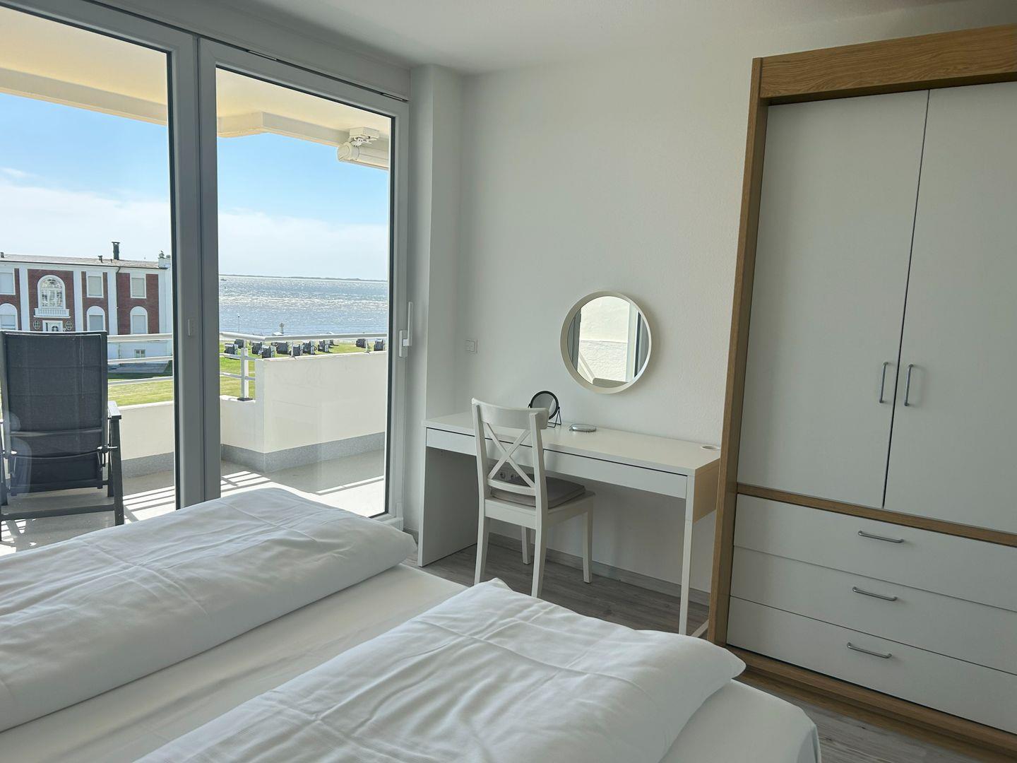 Die frisch renovierte Wohnung besteht aus einem Wohnzimmer mit offener Küche (Geschirrspüler, Backofen, Gefrierfach, Ceranfeld) und Zugang zum großen Balkon mit direktem Meerblick, einem Schlafzimmer mit Boxspringbett (Duschbad mit WC en suite), welches ebenfalls Zugang zum Meerblick-Balkon bietet, einem Schlafzimmer mit Etagenbett (90x190cm) und einem Schlafzimmer mit Stapelbett (90x190cm). Zusätzliches Duschbad mit WC vorhanden. Waschmaschine-/Trockner gegen Gebühr im gemeinschaftlichen Hauswirtschaftsraum. Nichtraucherwohnung.