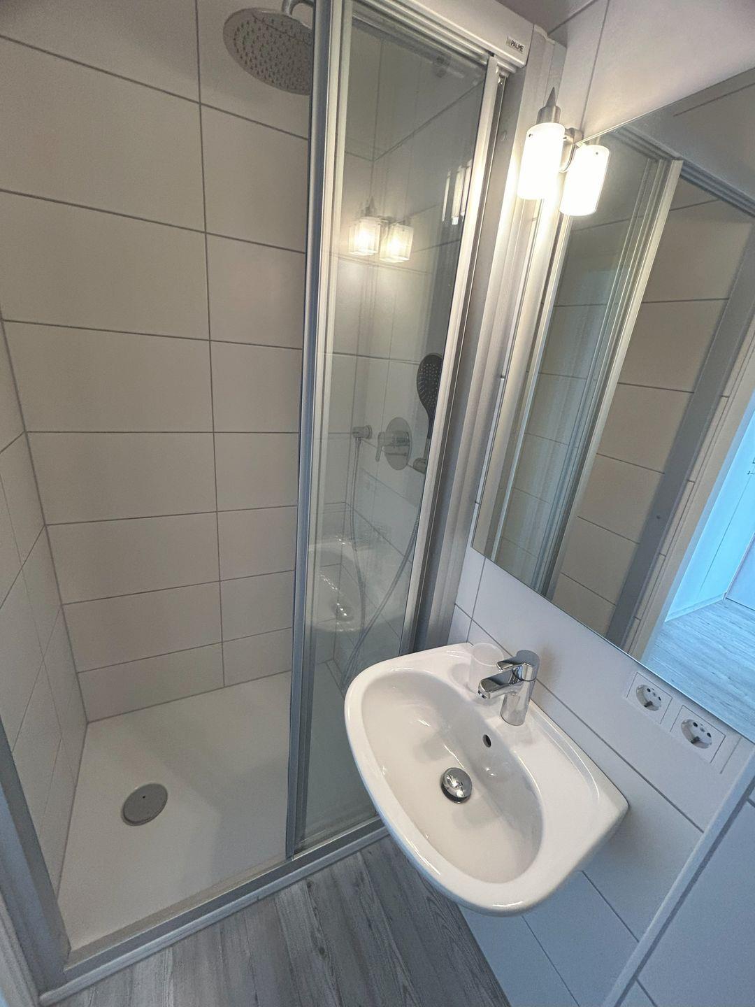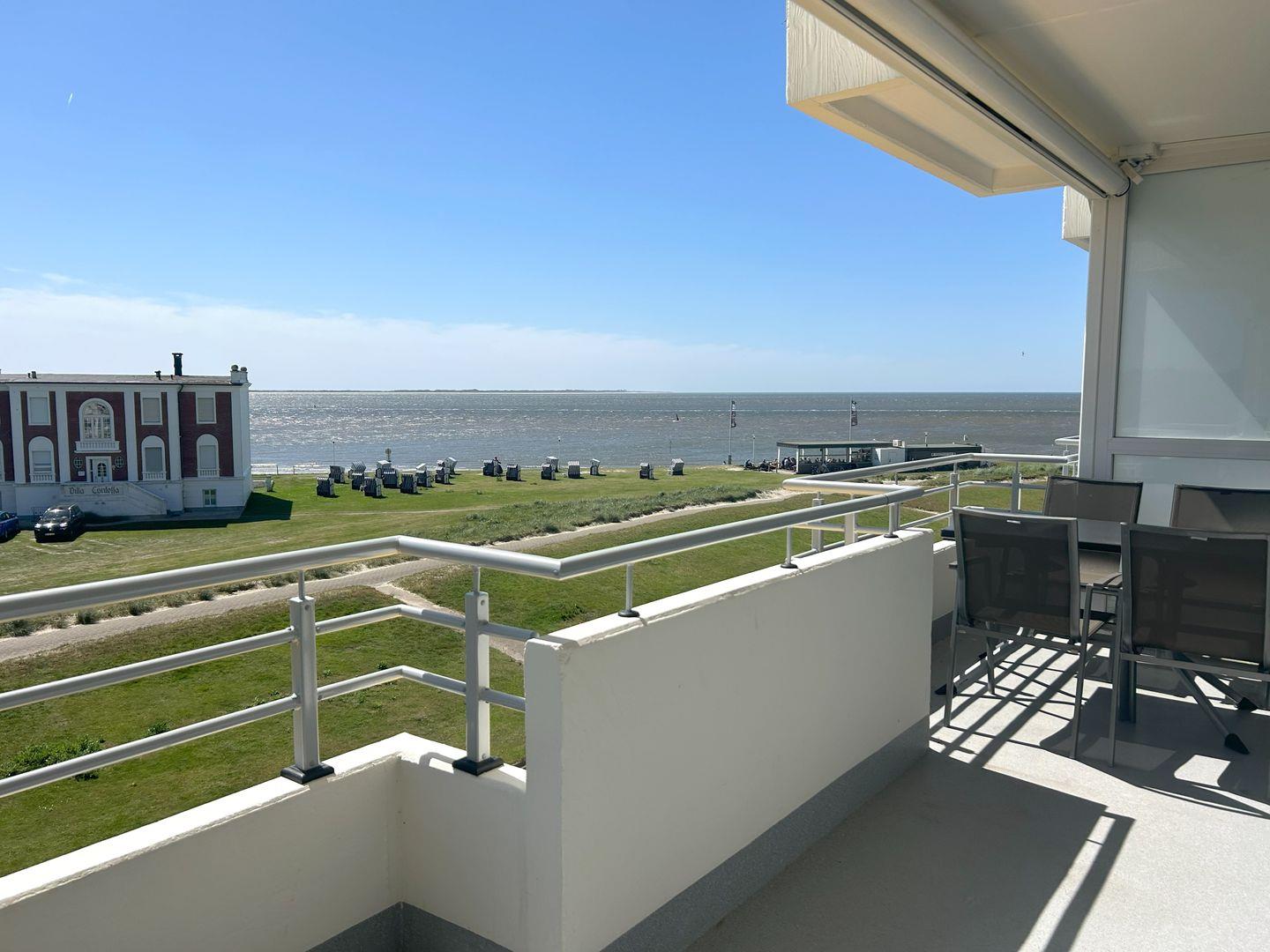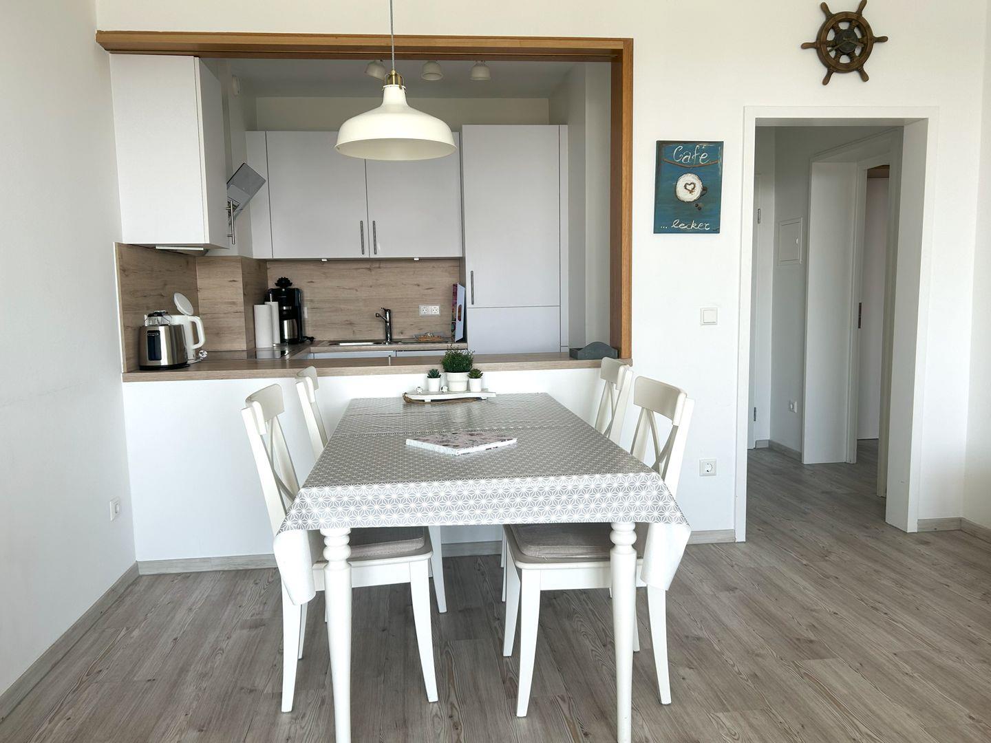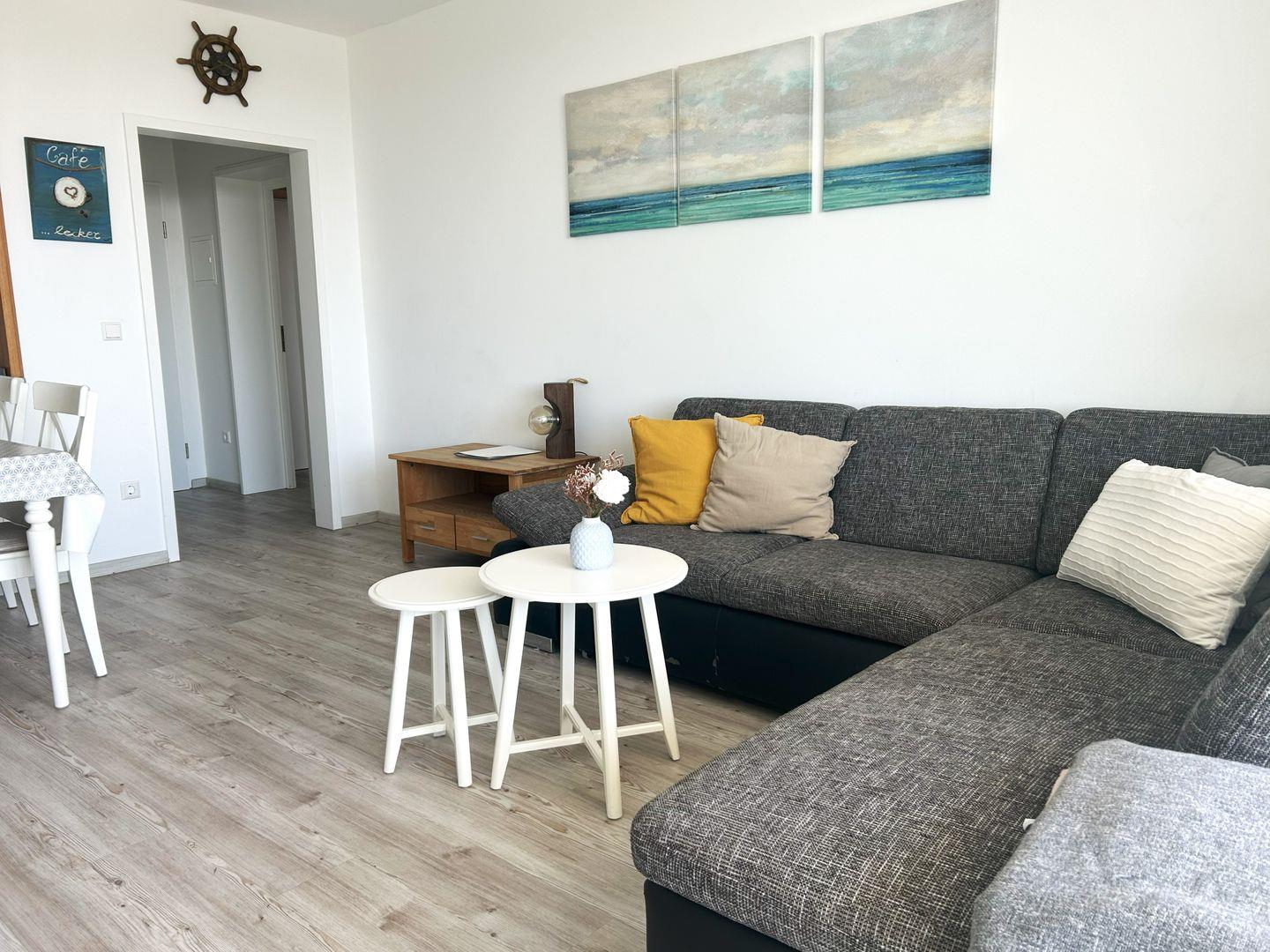 Die frisch renovierte Wohnung besteht aus einem Wohnzimmer mit offener Küche (Geschirrspüler, Backofen, Gefrierfach, Ceranfeld) und Zugang zum großen Balkon mit direktem Meerblick, einem Schlafzimmer mit Boxspringbett (Duschbad mit WC en suite), welches ebenfalls Zugang zum Meerblick-Balkon bietet, einem Schlafzimmer mit Etagenbett (90x190cm) und einem Schlafzimmer mit Stapelbett (90x190cm). Zusätzliches Duschbad mit WC vorhanden. Waschmaschine-/Trockner gegen Gebühr im gemeinschaftlichen Hauswirtschaftsraum. Nichtraucherwohnung.