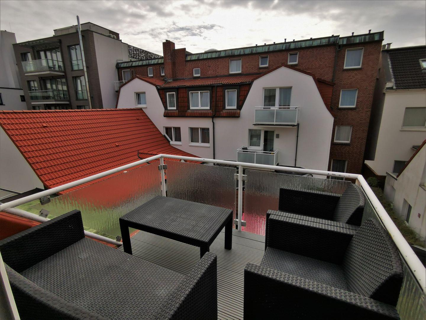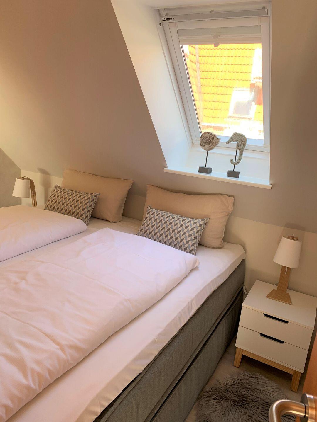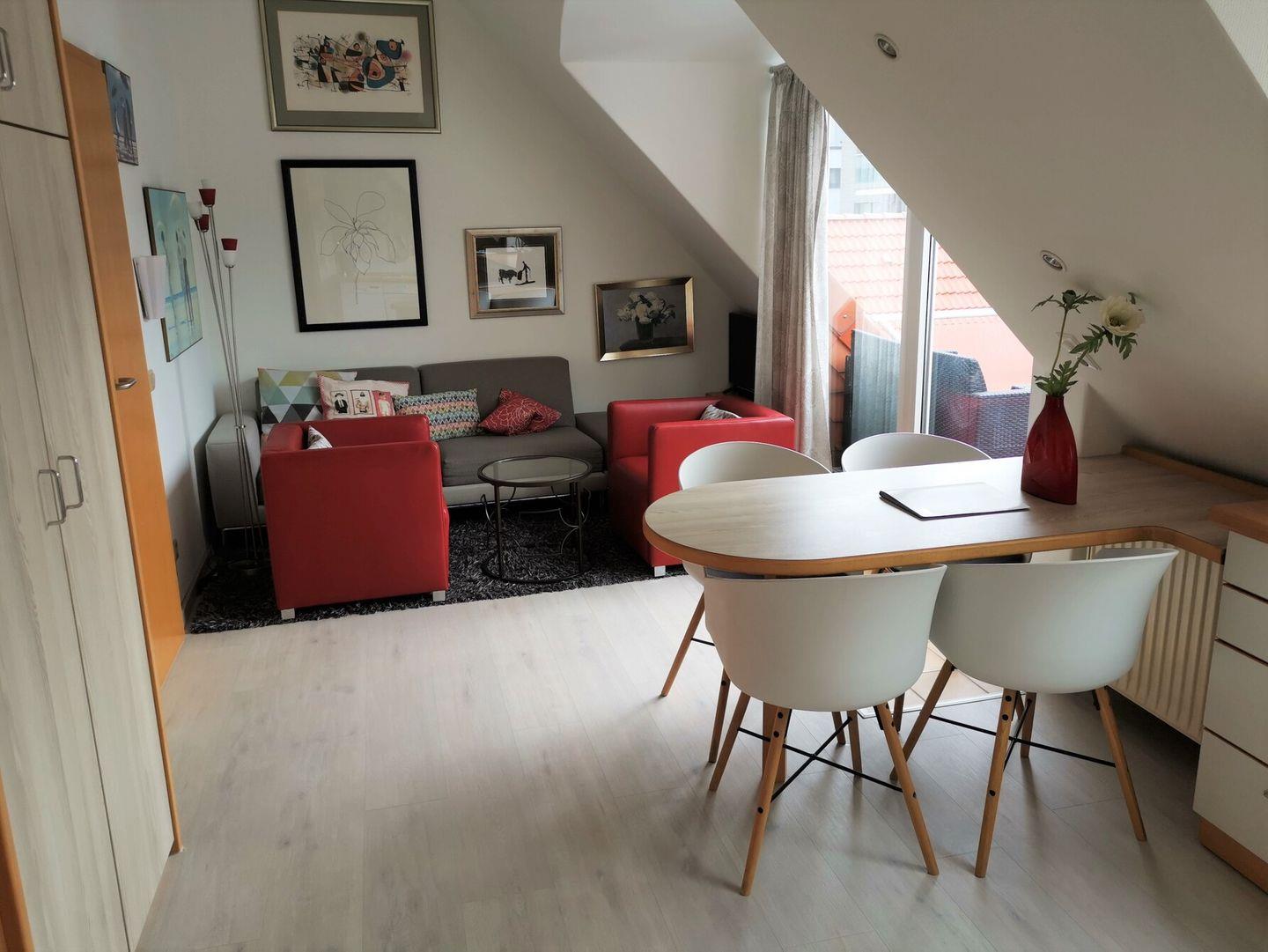 Die lichtdurchflutete Studiowohnung in der 2. Etage verfügt über zwei separate Schlafräume, ein Schlafzimmer mit Boxspring-Doppelbett und ein Kinderzimmer mit Schlafsofa, Liegefläche 136 x 200 cm/ Höhe 39 cm, und TV, einen offenen Wohnraum mit TV, Essplatz und gut ausgestatteter Küche mit Spülmaschine, Backofen, 2-Plattenherd und großem Kühlschrank mit Gefrierfach. Vom Wohnraum aus ist der Zugang zum Südwest-Balkon mit Loungemöbeln und Markise. Badezimmer mit Dusche und WC. WLAN. NICHTRAUCHERWOHNUNG!